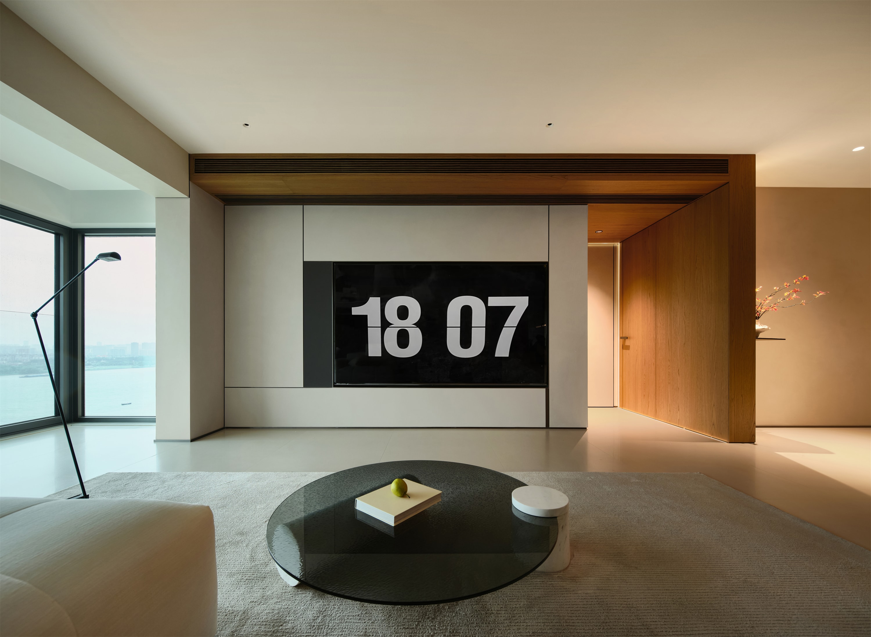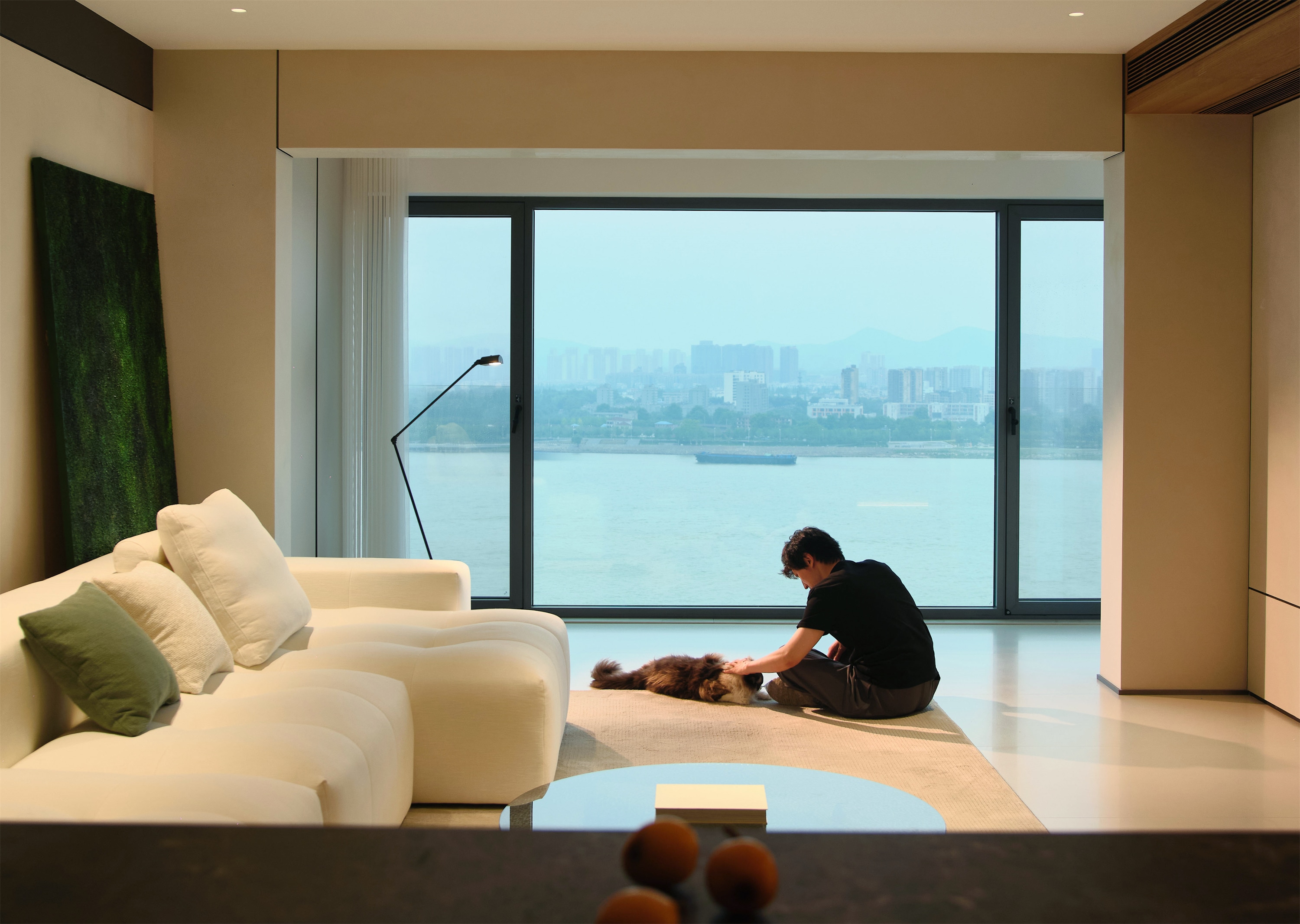 空间意境:阳台是一扇巨大的落地窗,窗外可以看到一片江景,水面平静,远处是连绵的城市建筑和绿色的植被,视野极为开阔。自然光线透过窗户洒入室内,使空间显得更加明亮通透。沙发旁的黑色的落地灯,灯臂细长,设计简约,让空间更精致有层次。窗外的景色与室内的静谧氛围相互映衬,给人一种宁静致远的感觉。整体空间设计简约而不失格调,自然元素与现代设计巧妙融合,展现出独特的美感。