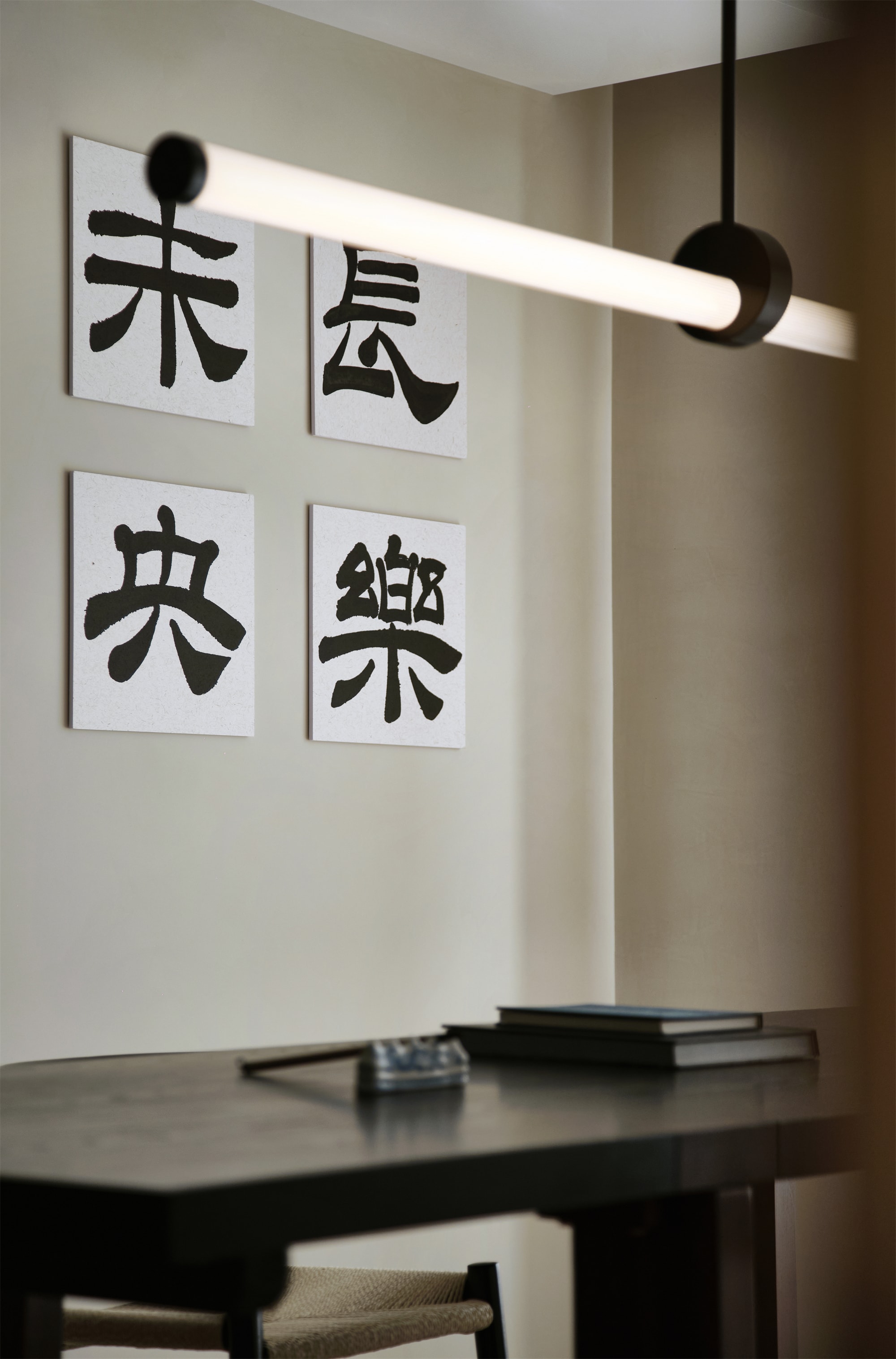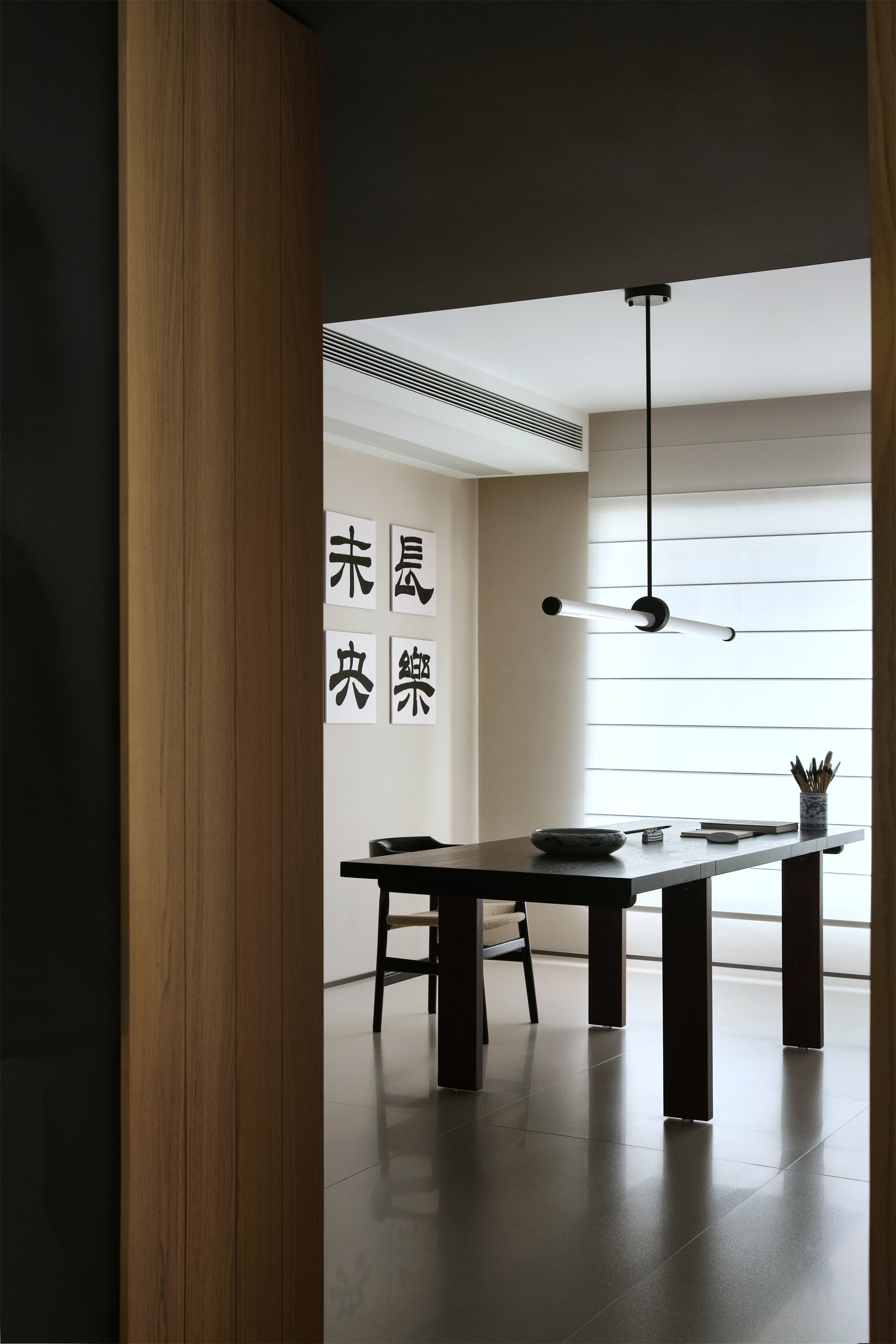 业主爱习书法,在西厨左侧房间设计了一个多功能室。浅色墙面上挂有四幅黑白书法作品,为空间增添了文化气息和艺术氛围。窗帘选用了横向线条的罗马帘,增加了空间的层次感。灯杆细长的吊灯设计简洁而富有线条感。
