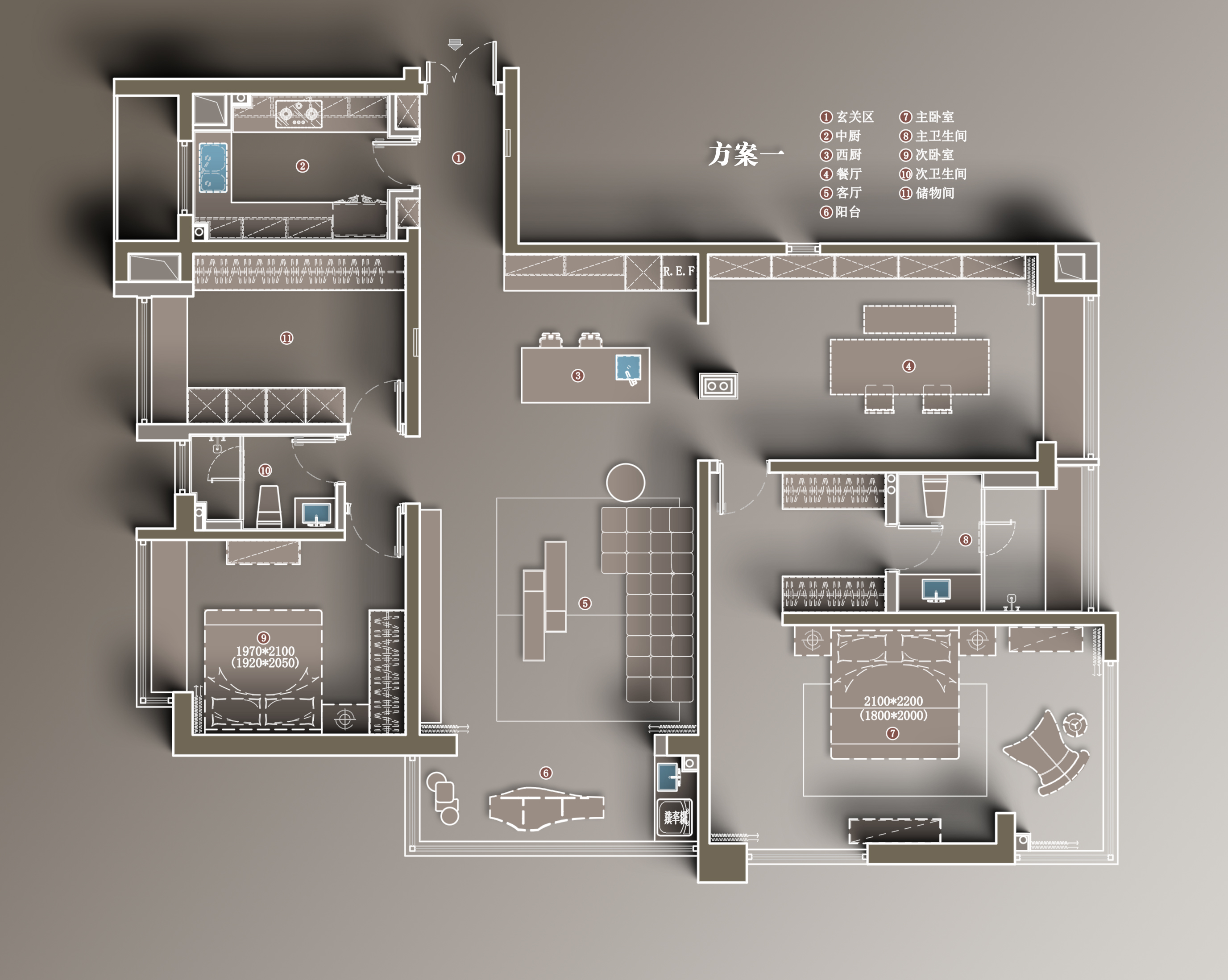 由于建筑是江边的高层,承重墙比重很大,能改动的空间很小。能动的只有东北方位的房间。拆除掉卫生间之后,下水管便裸漏了出来。那么这个存在于客厅和多功能房之间的下水管的处理,便成了一个重点和难点。最开始的时候设计了两个方案,增加空间氛围感与美观度的同时,也能起到一个隔断的作用