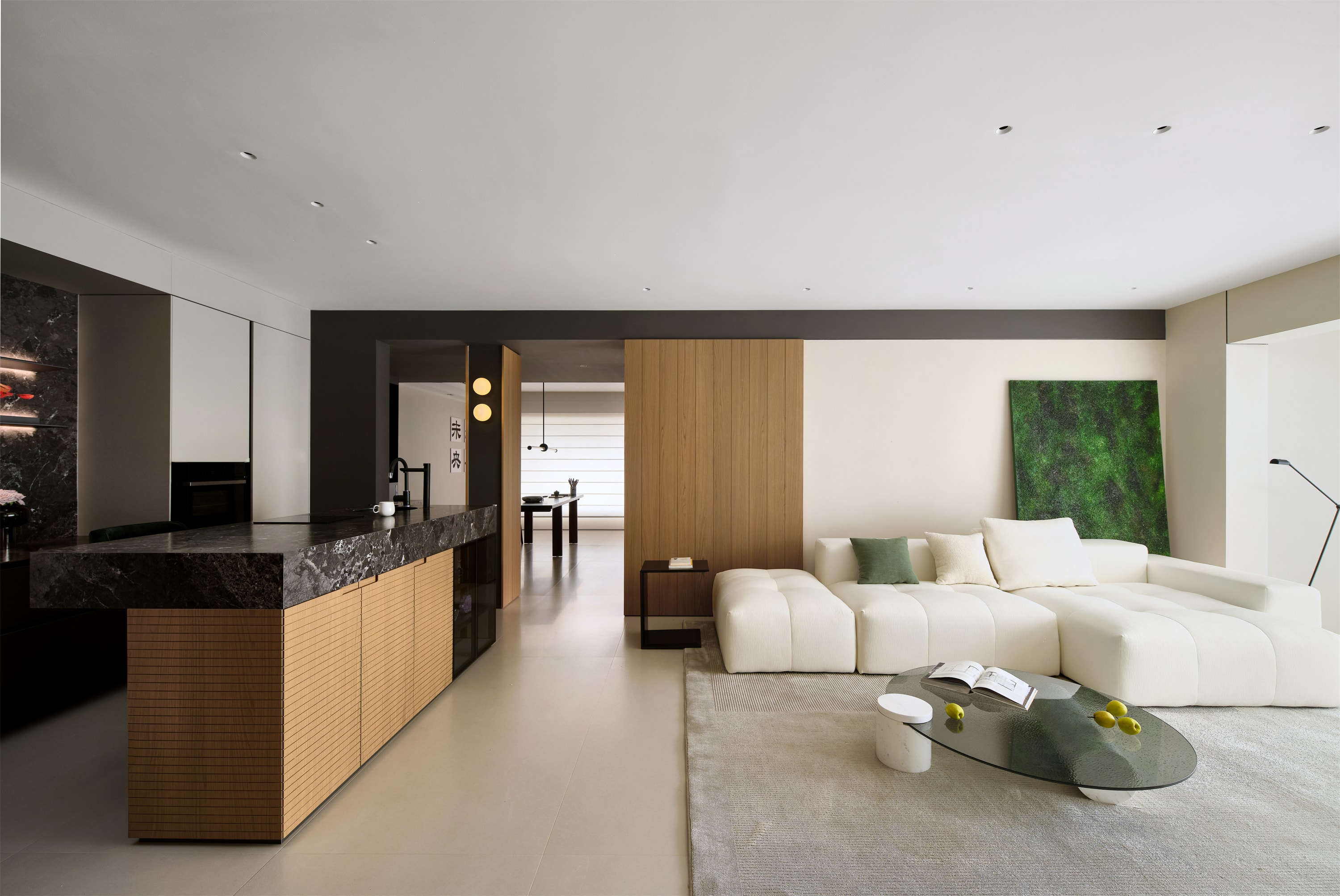 设计选材:空间以米白、浅棕和黑色为主色调,搭配绿色的装饰画和靠垫,形成了和谐且富有层次感的色彩组合。运用了大理石、木质、织物等多种材质,提升了空间的质感和品质。空间采光良好,开放式的设计使得客厅和厨房区域相互连通,视野开阔,动线流畅,增强了空间的通透感。