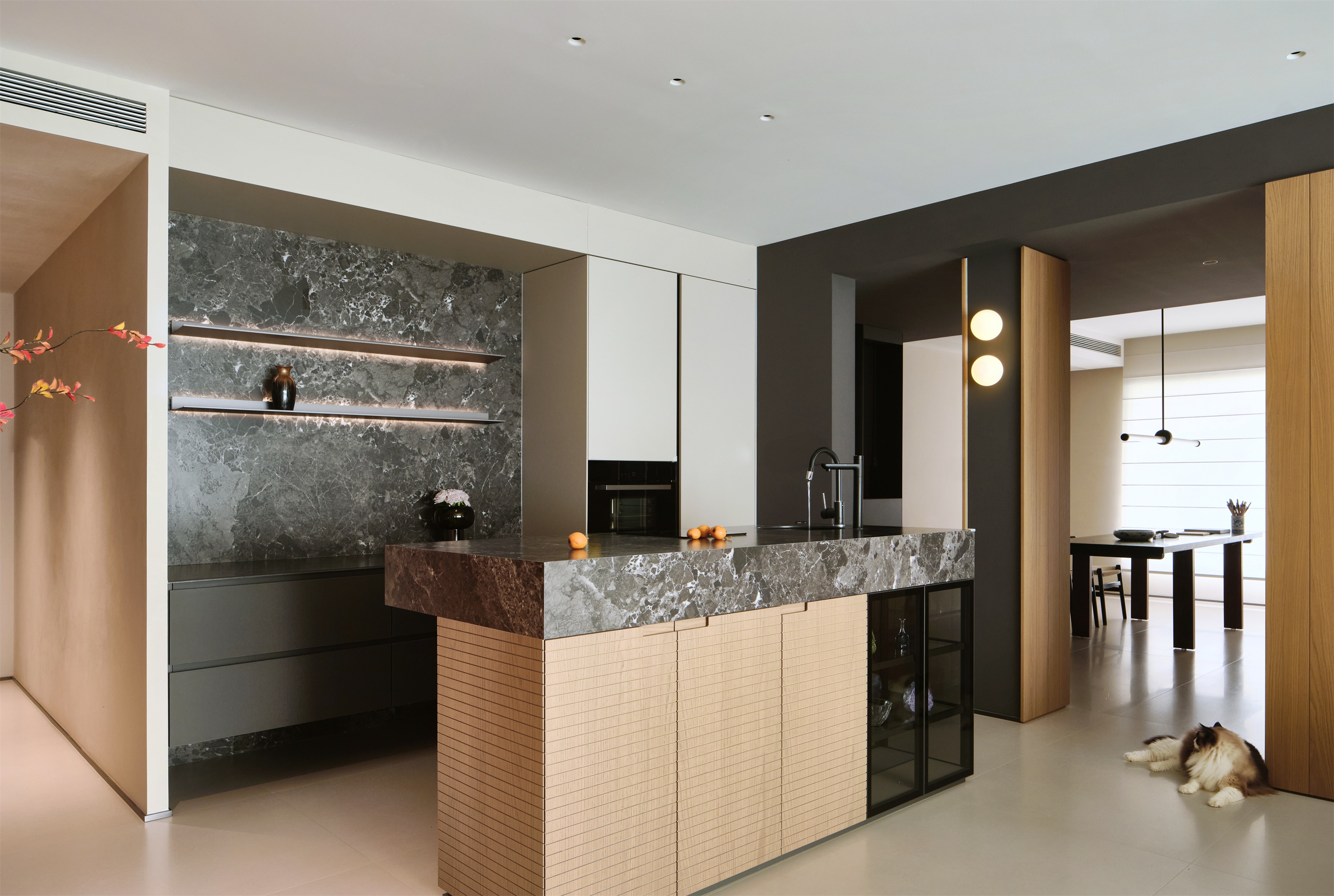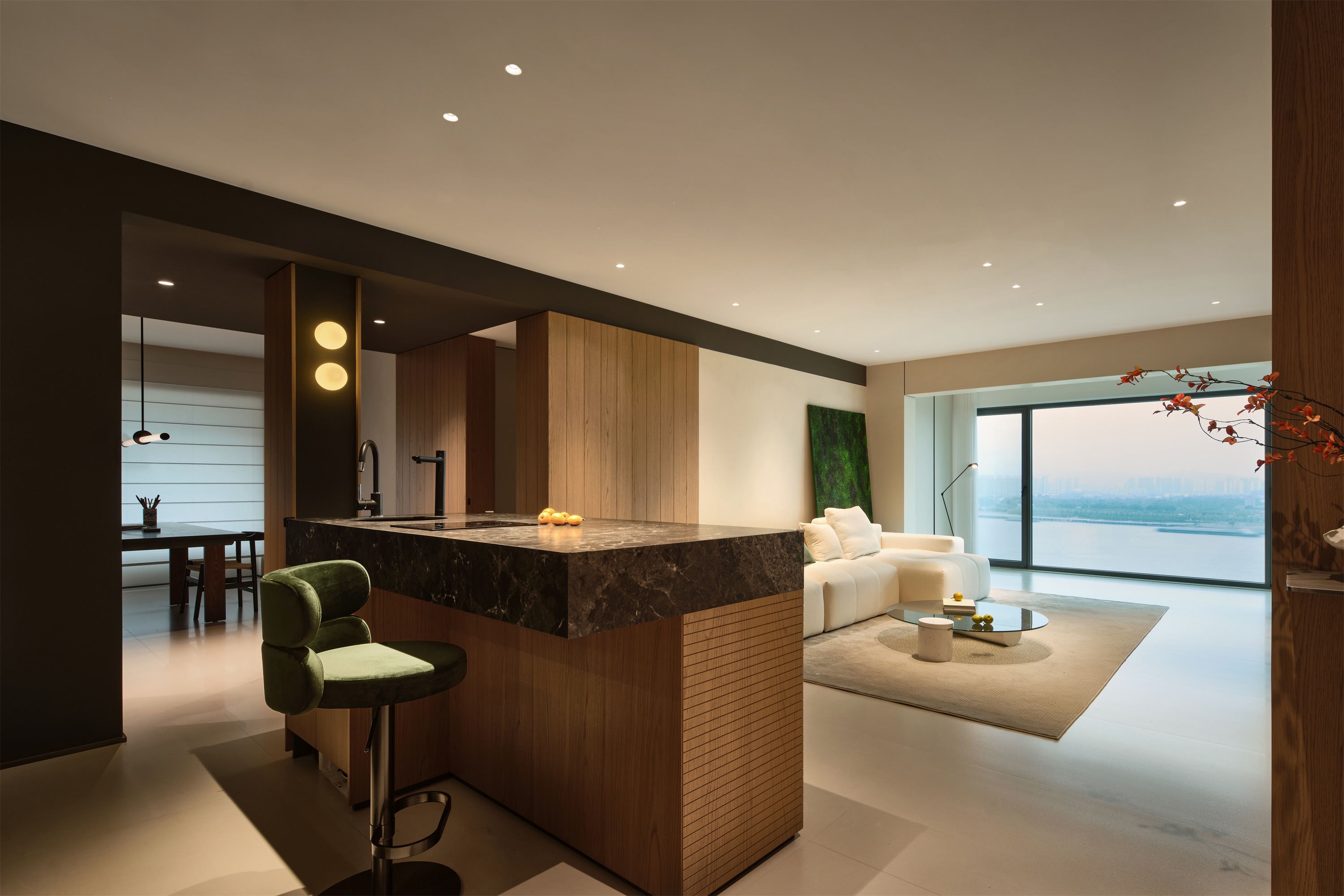 穿过走廊,左手边就是西厨区域,岛台面对着客厅,在西厨劳作时可以与客厅的人交流无阻,视线可以一直望到阳台外的江景,使身心得以放松,心情保持愉悦。色彩上,将原木色融入现代极简的黑白中,在硬朗的结构中揉入了温暖的木色,使空间氛围温馨舒适。