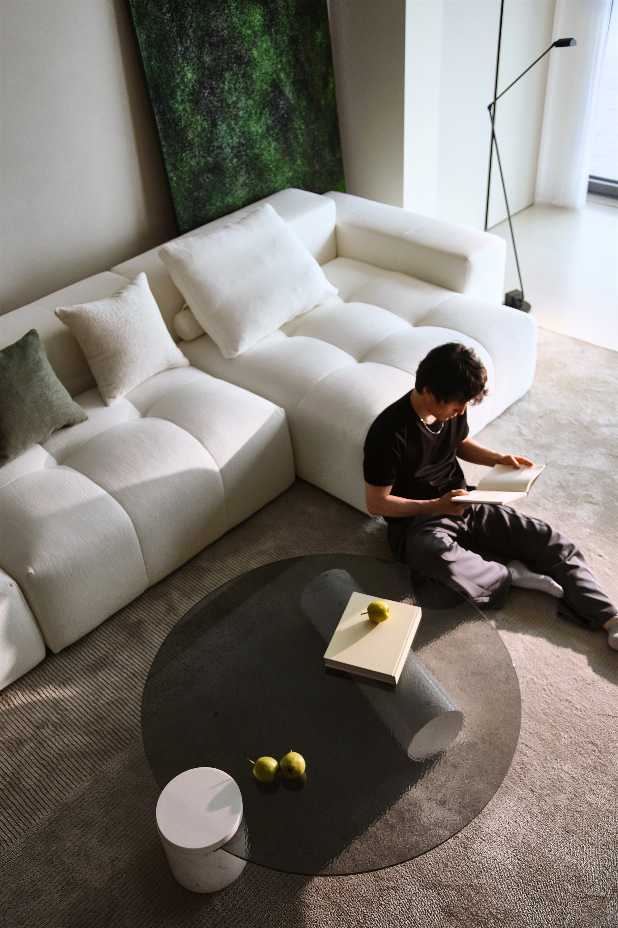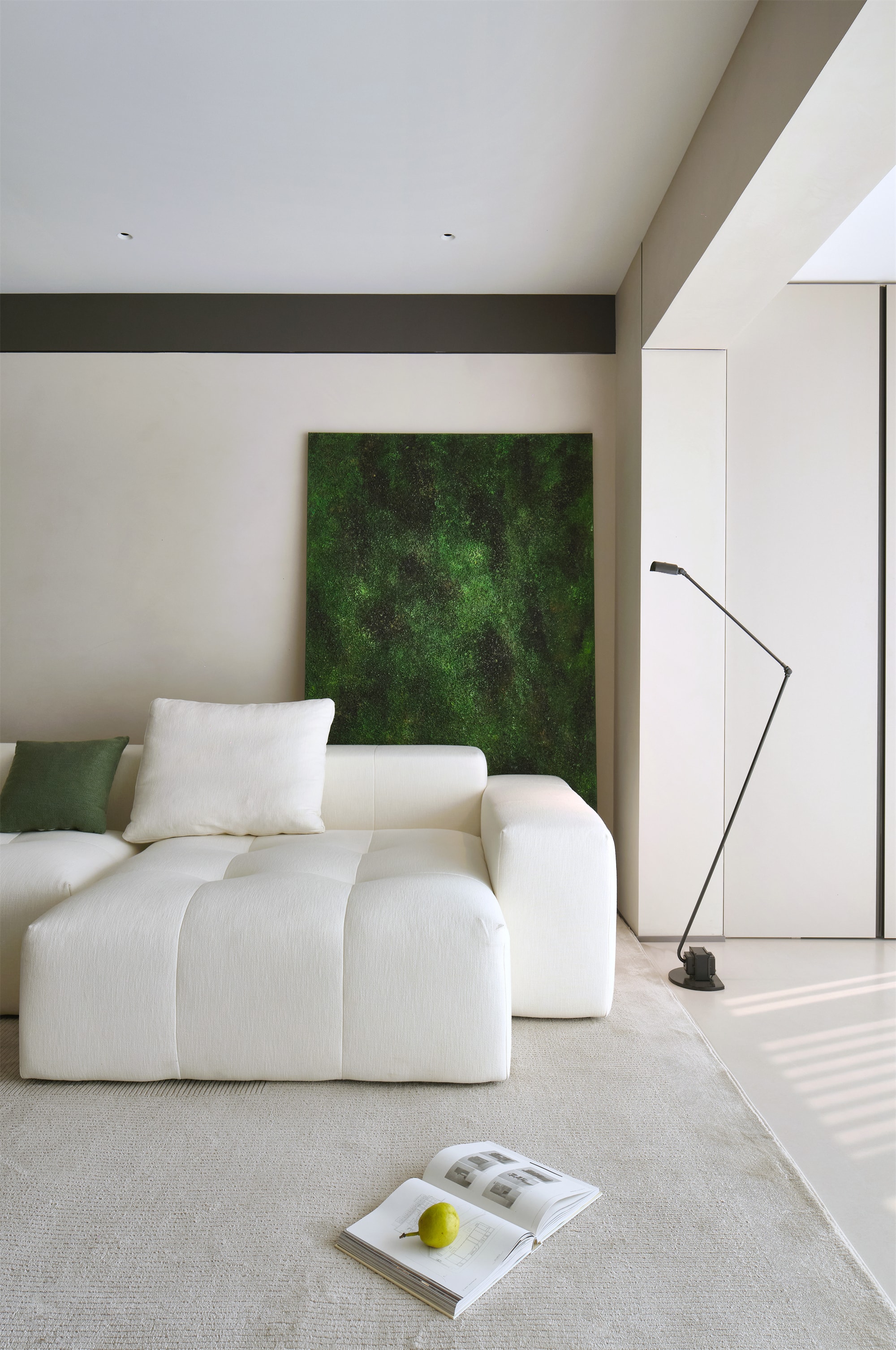 岛台前方就是客厅的模块沙发,造型饱满,搭配了同色系和深绿色的靠垫,与沙发背后的绿色装饰画相呼应,增添了空间色彩层次,为空间带来一抹自然的色彩。柔软的地毯使空间更加温馨舒适,光影在地面上交织,形成美丽的图案
