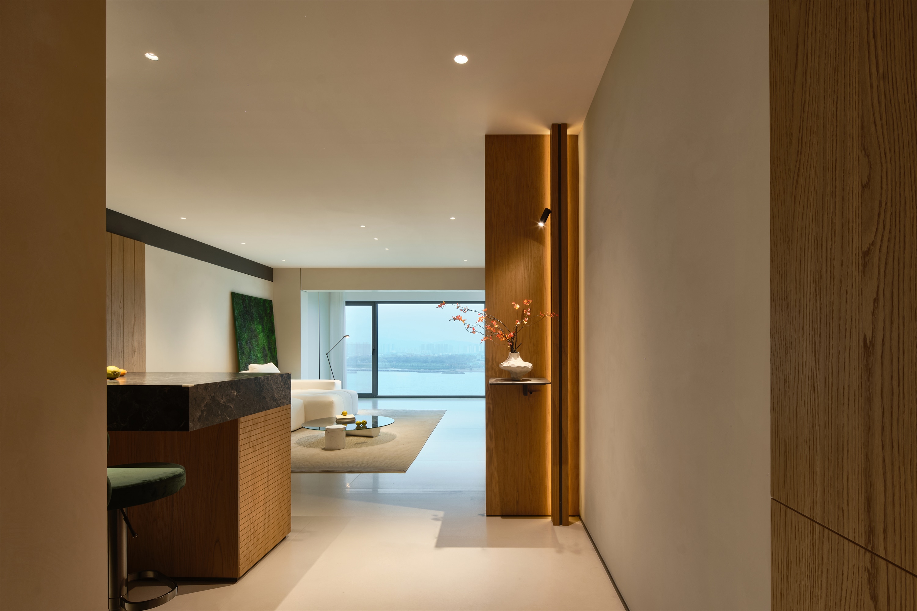 项目定位:这是南京市鼓楼区的一间临江大平层住宅,优越的地理位置和景观环境赋予了住宅别具一格的自然属性,设计师将阳台的玻璃换成了一面整玻,充分利用这优越的地理环境,将满目江景融进室内。业主临近退休,女儿已在外地工作,打算装修一下这个临江的房子,享受自己退休之后清闲美好的生活。在平面的规划上,减少了卧室数量,最大化的扩大活动的公区。在视觉上,硬朗的现代极简中融入原木元素,让整个空间洋溢着温馨的氛围