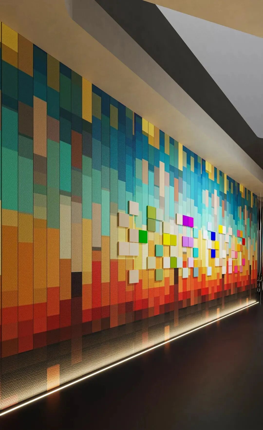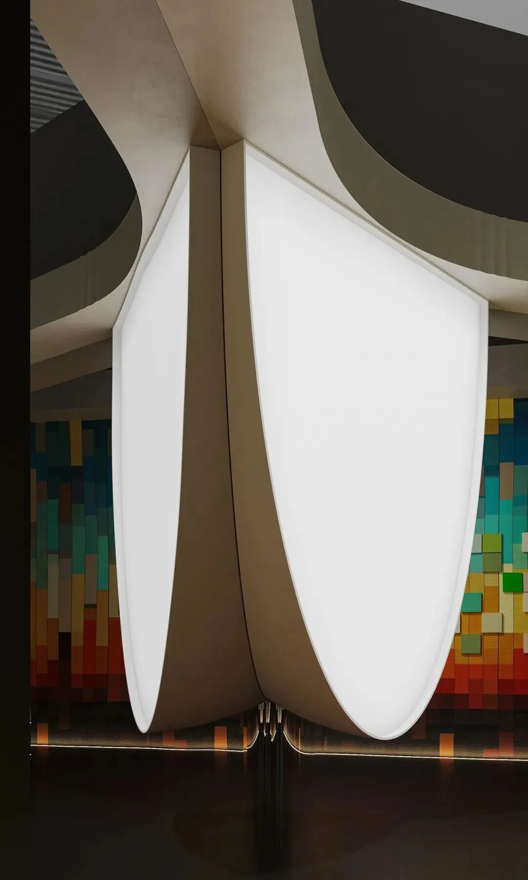 空间布局:展厅采用棱角分明的立体结构,搭配深色与光影的应用,彰显我们的品质,同时在最显眼的部分,拼接了高达5米高的动态屏,让空间的主视觉更加绚丽。