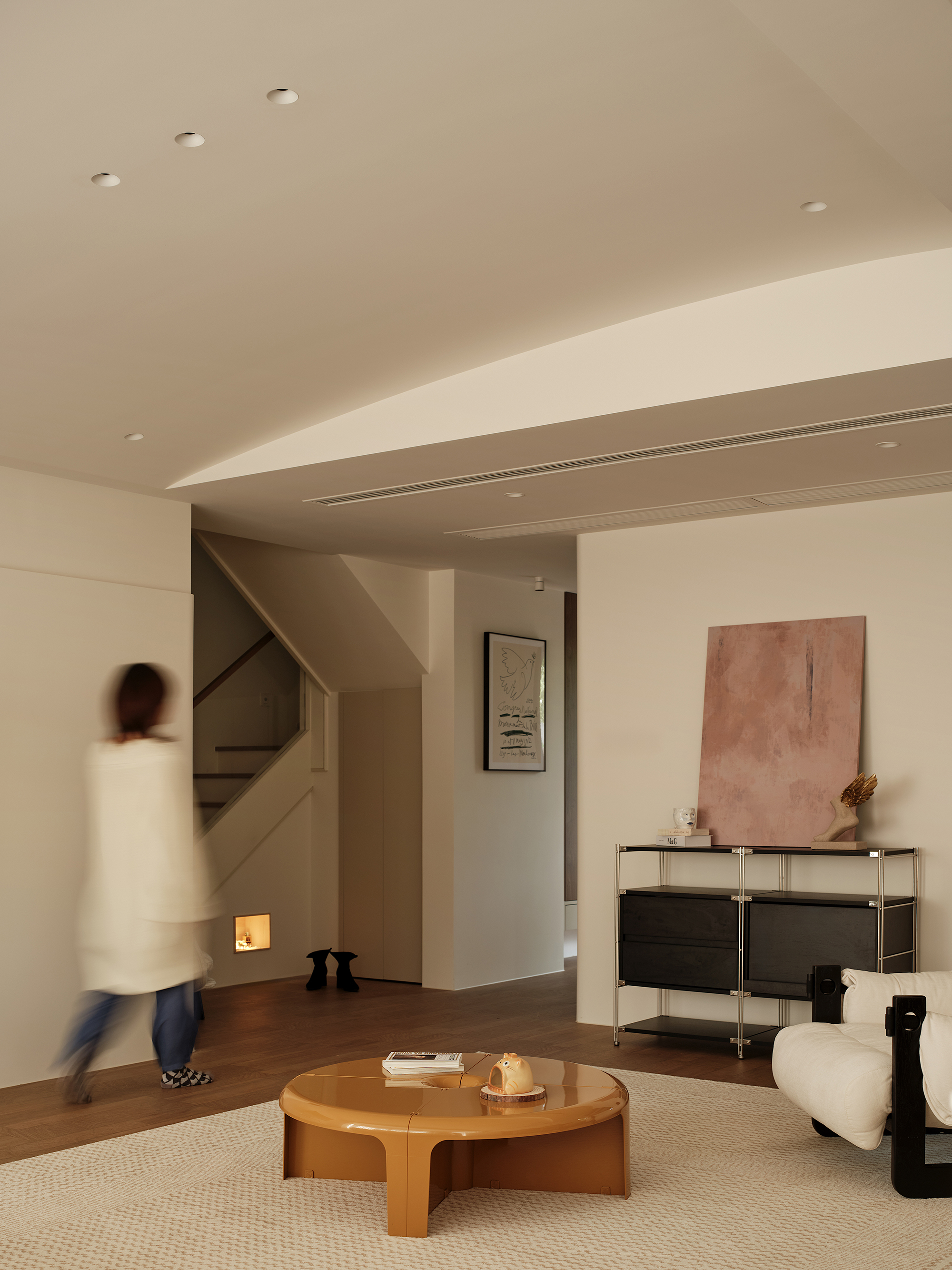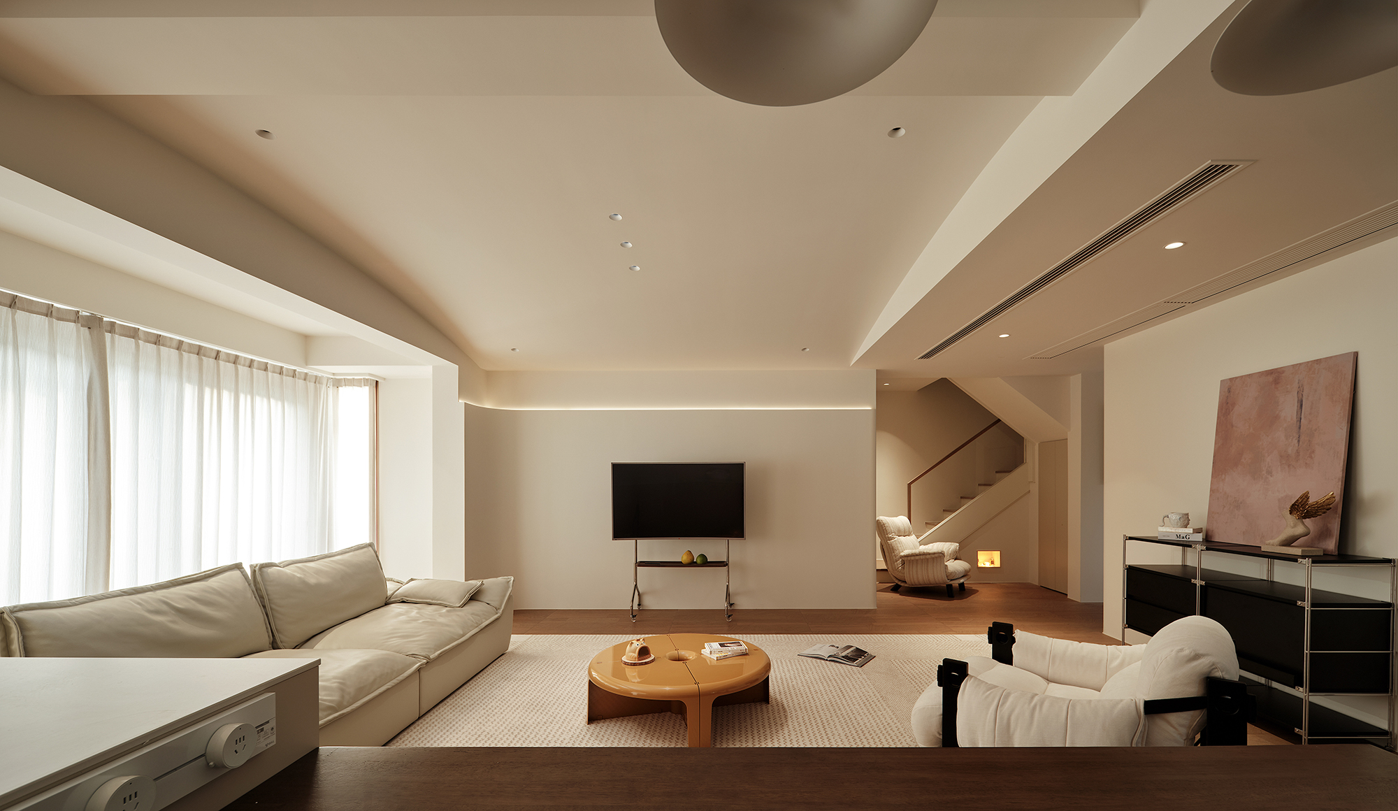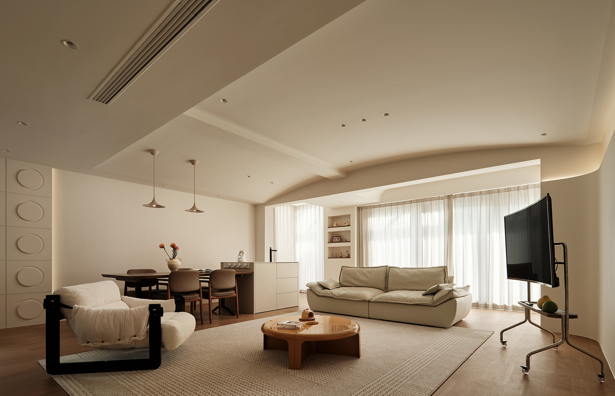 项目定位:本案以“自然融合、安全适配、功能整合”为核心,将自然风贯穿于空间设计始终。通过圆弧造型弱化建筑结构硬伤,以墙顶同色延伸拉伸空间维度,同时围绕亲子空间的成长需求优化细节,兼顾自然美学与实用功能,打造兼具治愈感与探索性的家庭生活场景。