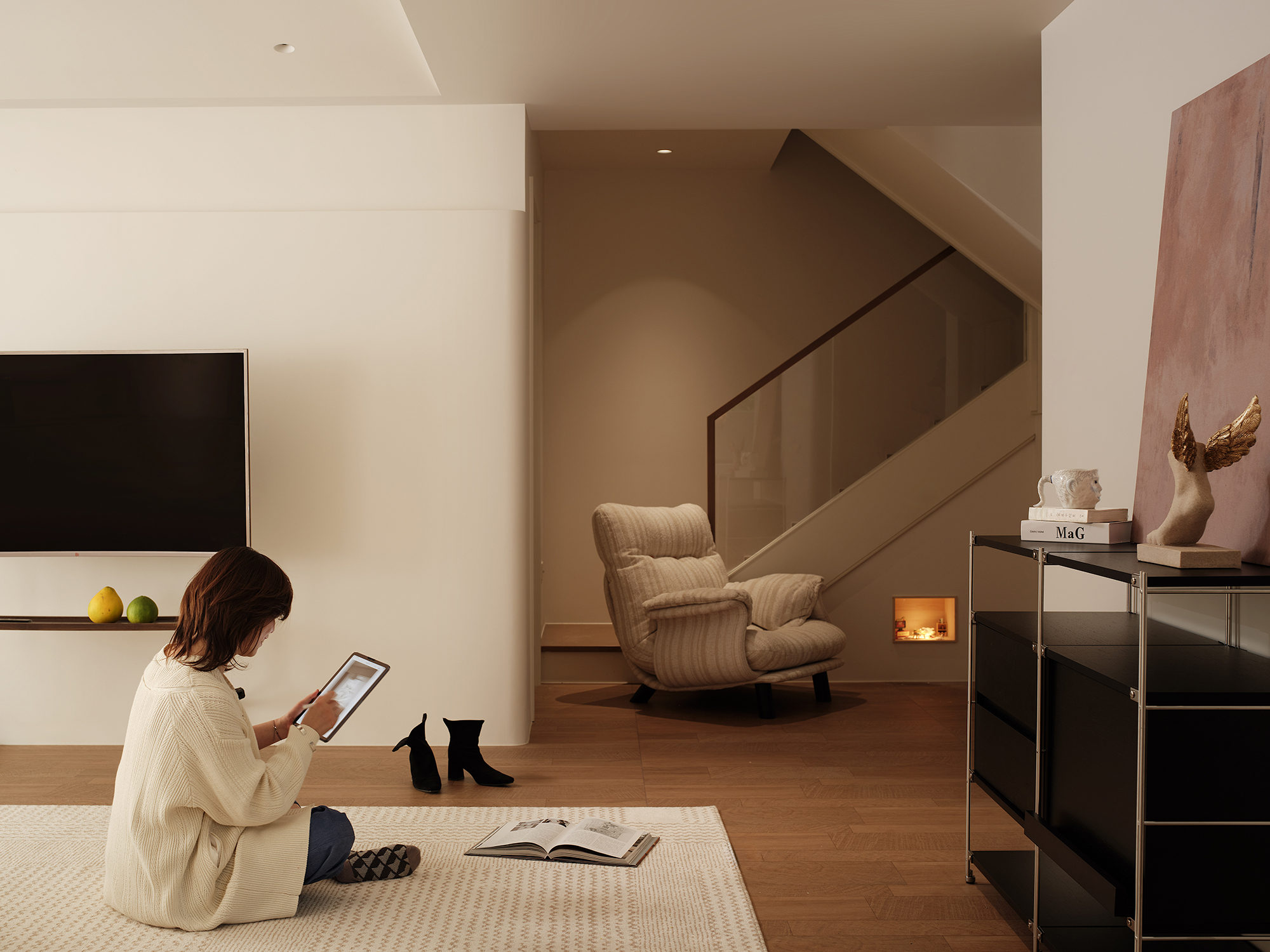 用户体验:家居空间中植入一些温馨的小细节,原本平平无奇的楼梯,以内嵌光体为核心,布置家居场景,营造温暖仪式感,让每一次居家都充满专属的温馨与期待。