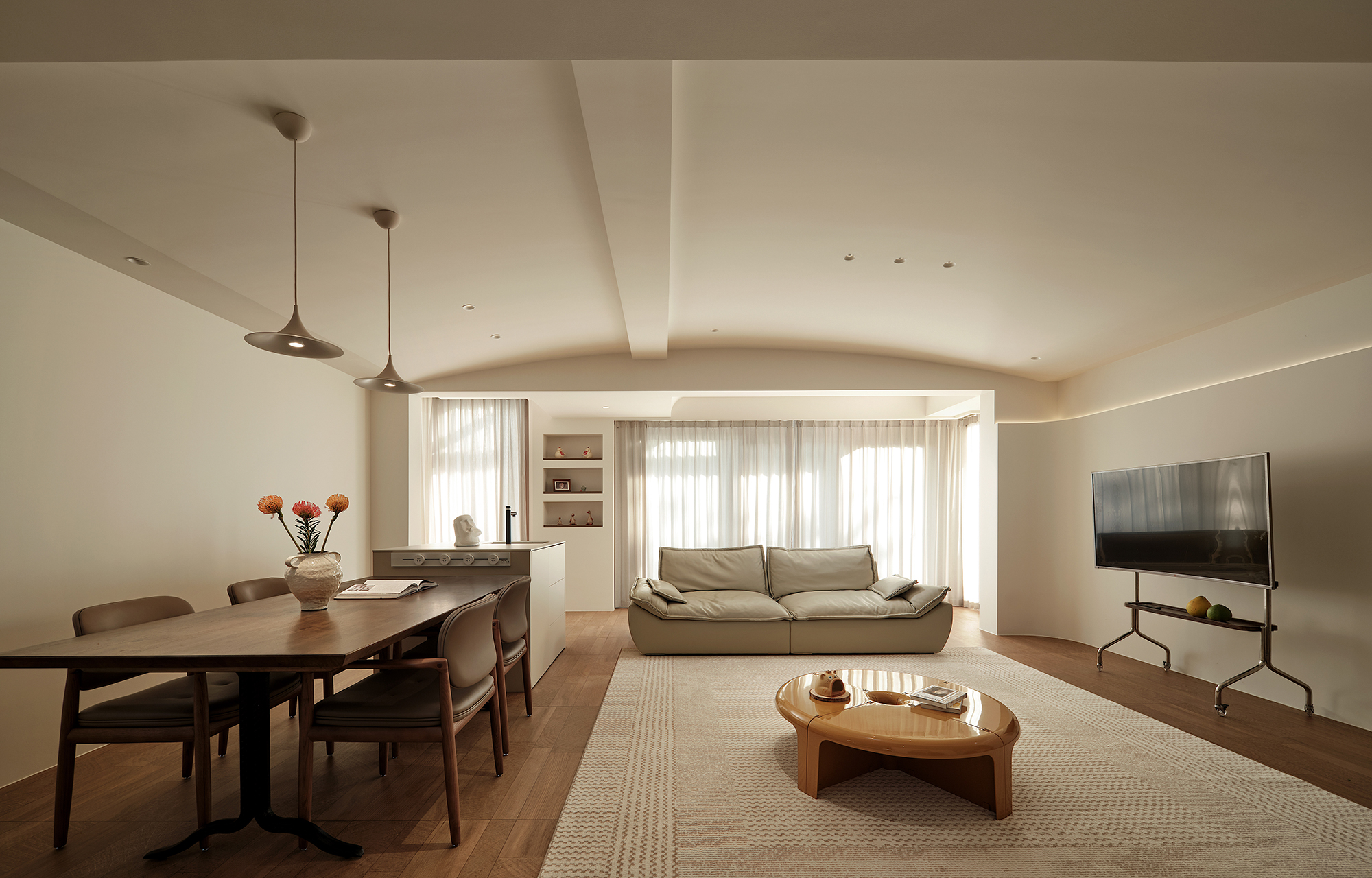 空间意境:客厅弱化空间结构,深度贴合自然风理念,借助顶面与墙面的梁体结构与走向,打造圆弧造型,弧线在此如自然肌理,彻底消解原始梁体的视觉压迫感,同时拉伸空间纵向与横向尺度,营造通透开阔的氛围。