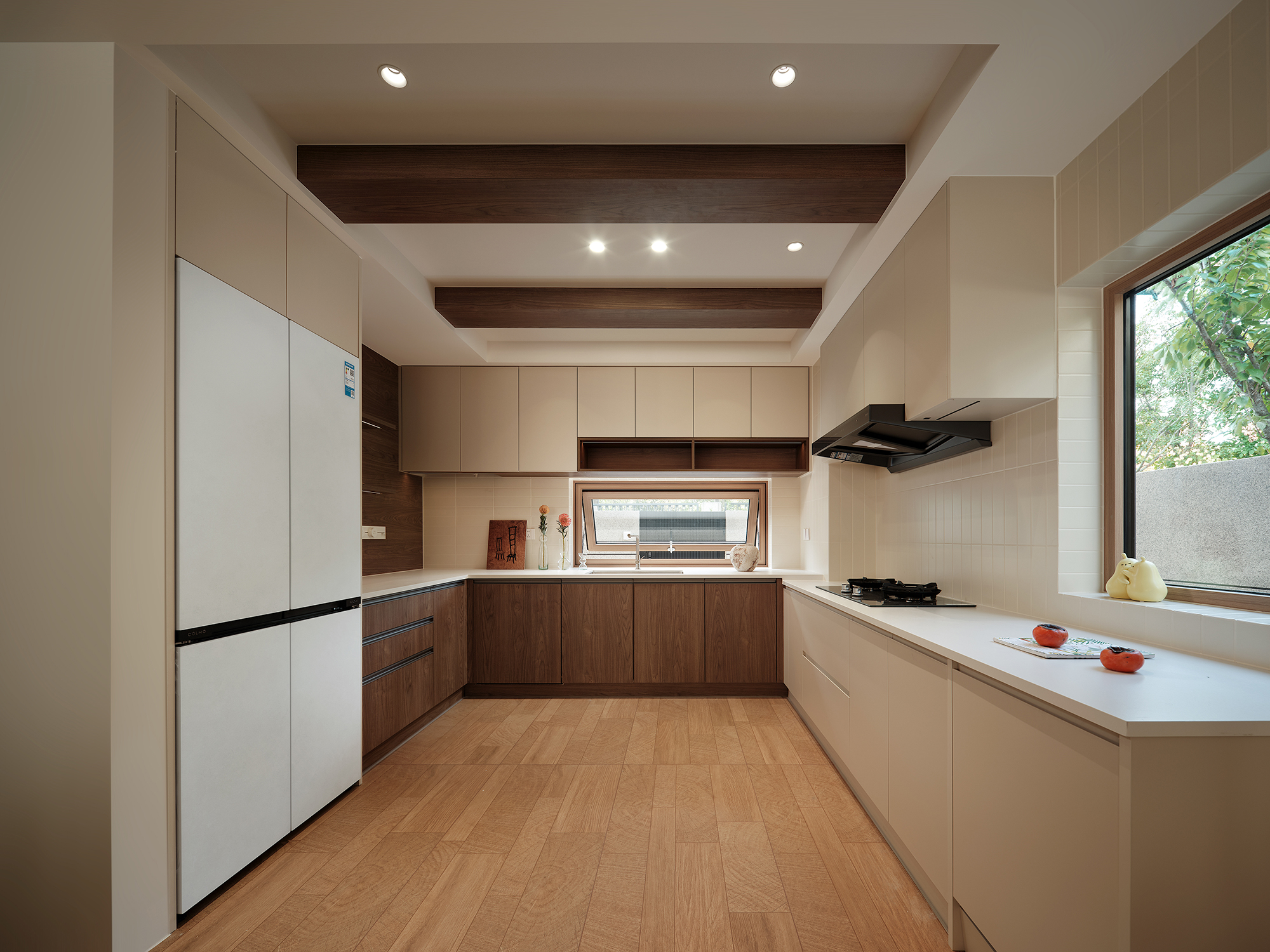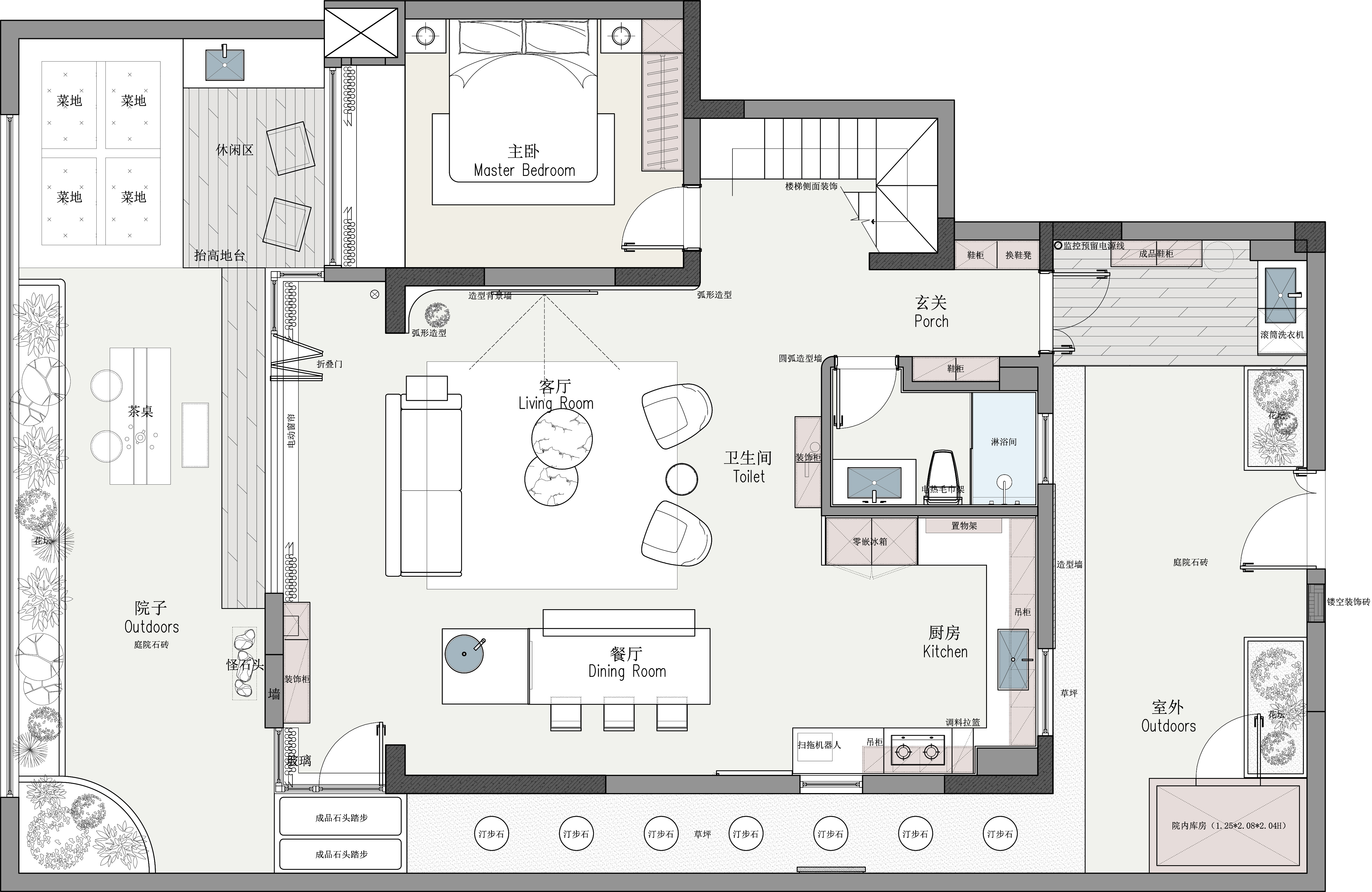 设计选材:客餐区域自然过渡,餐厅与岛台相接,岛台一侧与外部紧密联动,打开时可与室外庭院形成通透互动,一杯咖啡,一本书,抬头可见庭院景观,让自然光影与新鲜空气融入居家休闲过程。