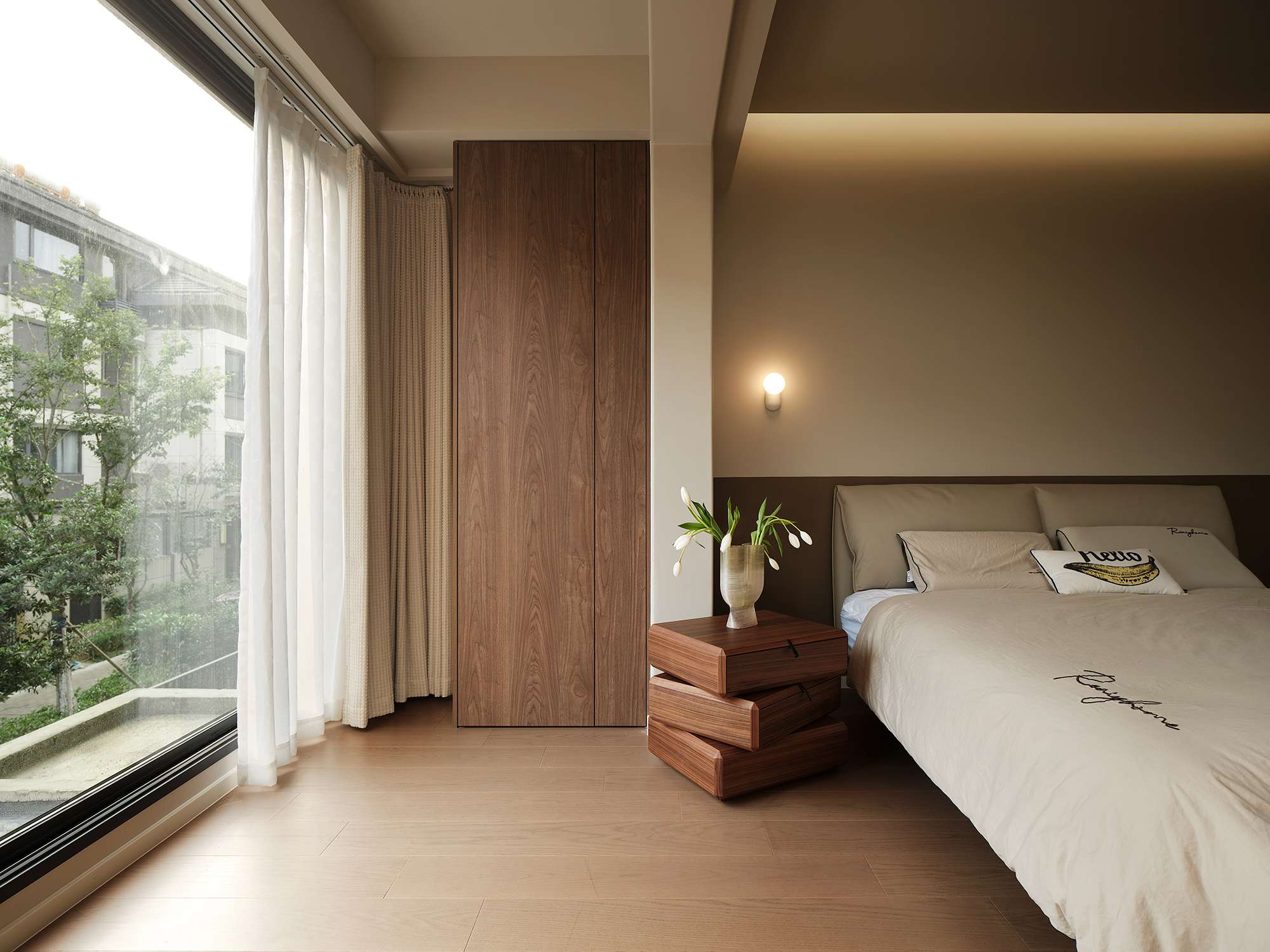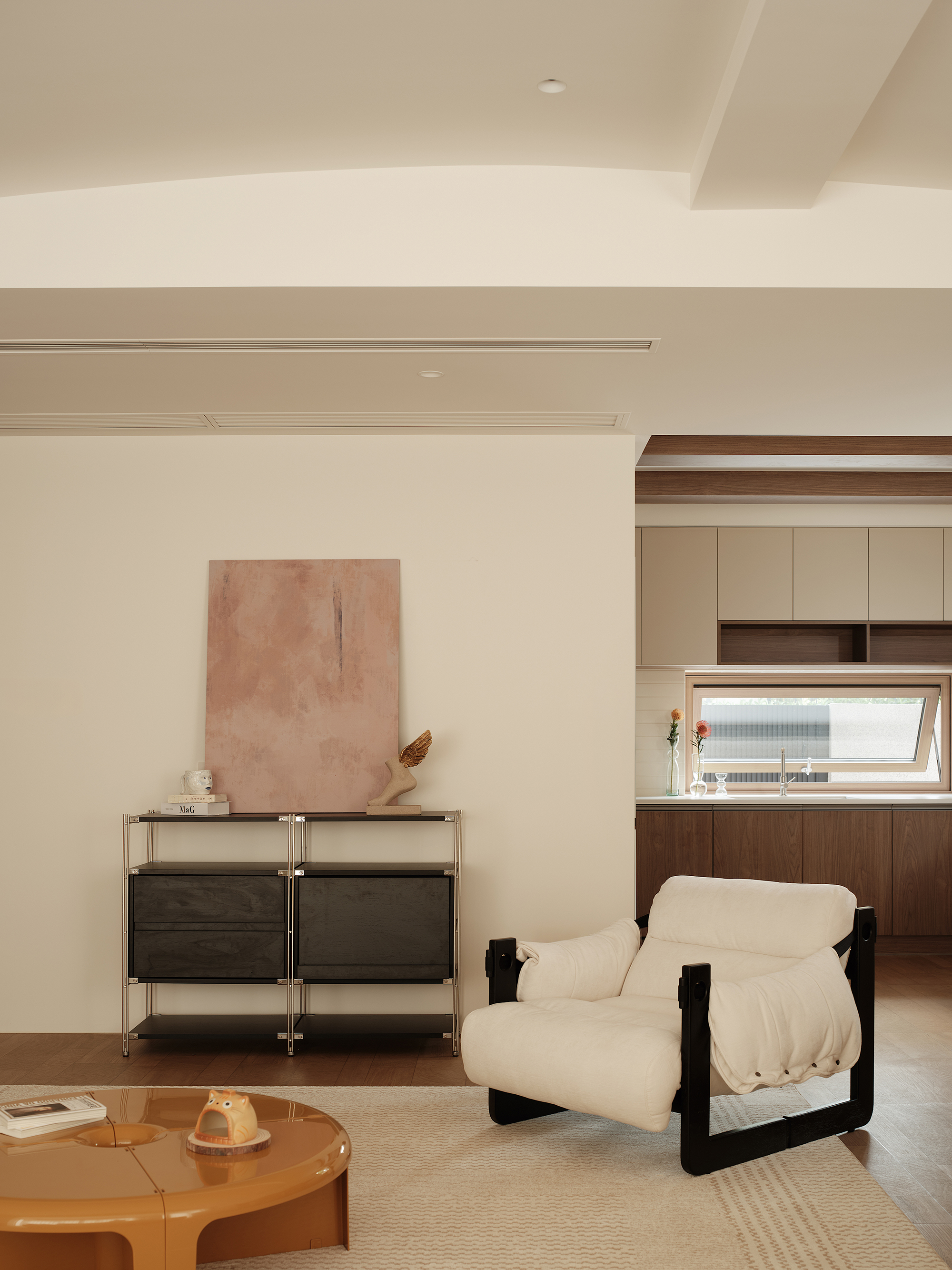 空间布局:客厅以杏色为基底,搭配黑色线条储物柜、原木元素等,为空间注入自然质感,棕粉色装饰画增添一抹温柔色系,提升视觉层次与冲击力。空间家具以人为本,围绕居者一岁宝宝的安全需求,沙发以柔软布艺为主,温馨舒适。茶几采用圆弧形边角,规避磕碰风险,同时在空间中暗藏秘密探索区域,以趣味引导小朋友主动探索,让亲子互动融入自然空间。