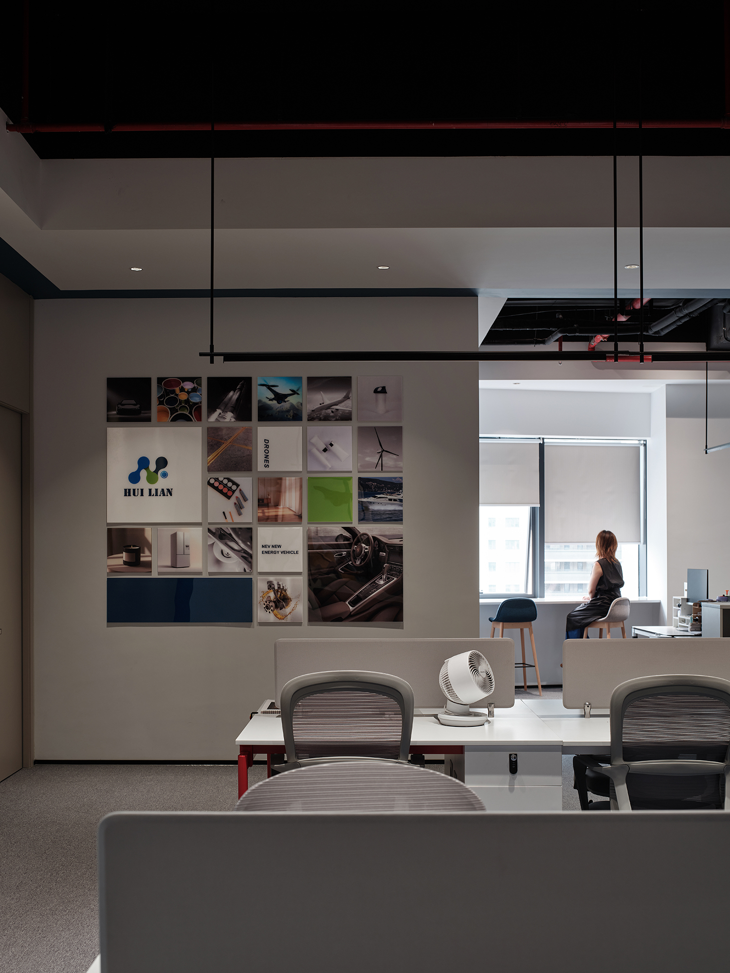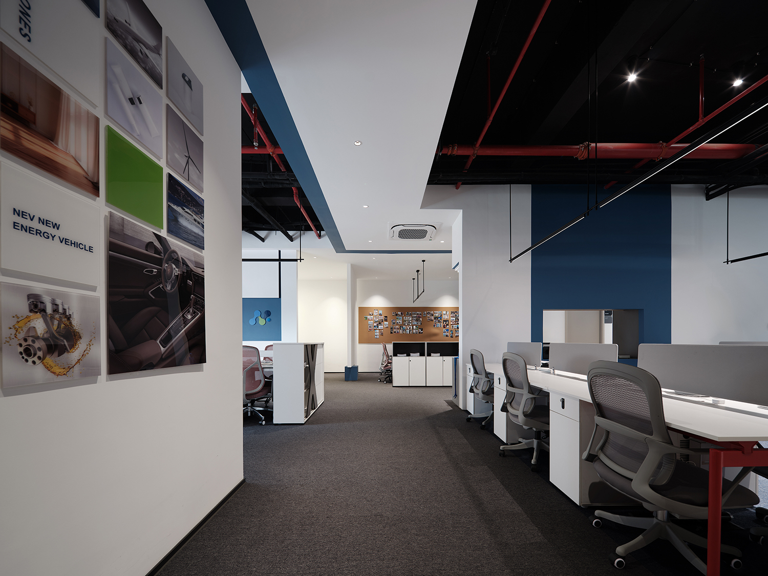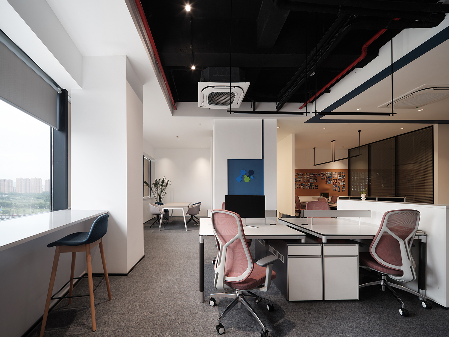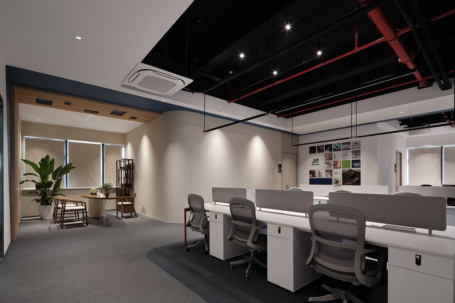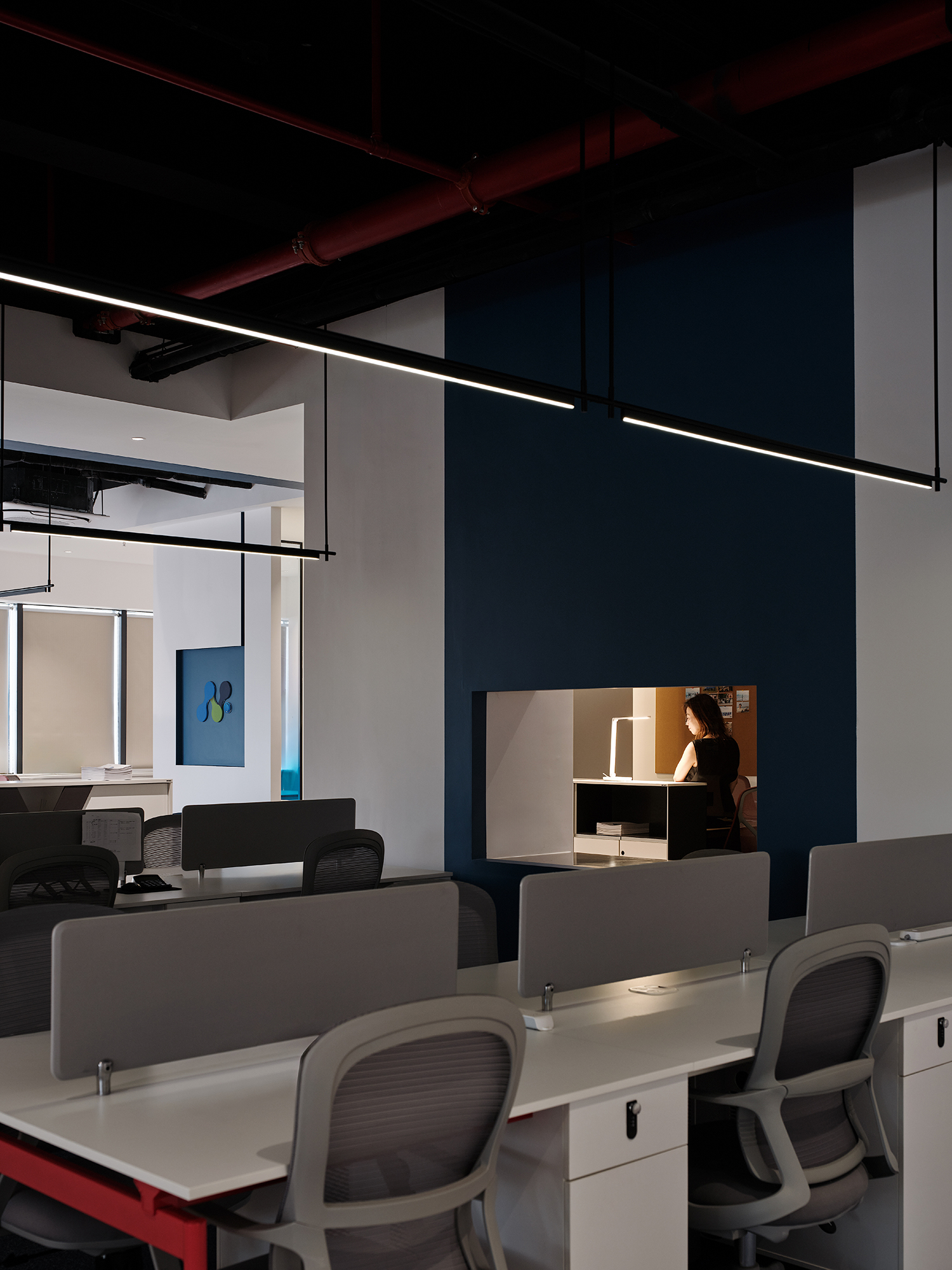 设计选材:开放式工位区作为团队协作的核心场域,以纯净的白色为基底,搭配深蓝色块拼接,顶面红色管道裸露在外,既有层次分明的视觉节奏,又注入了轻松的活力。开放式的工位布局保证了沟通的便捷性,隔断的巧妙运用则在共享空间中划分出相对独立的工作单元,避免了干扰的同时确保了视线的穿透性。