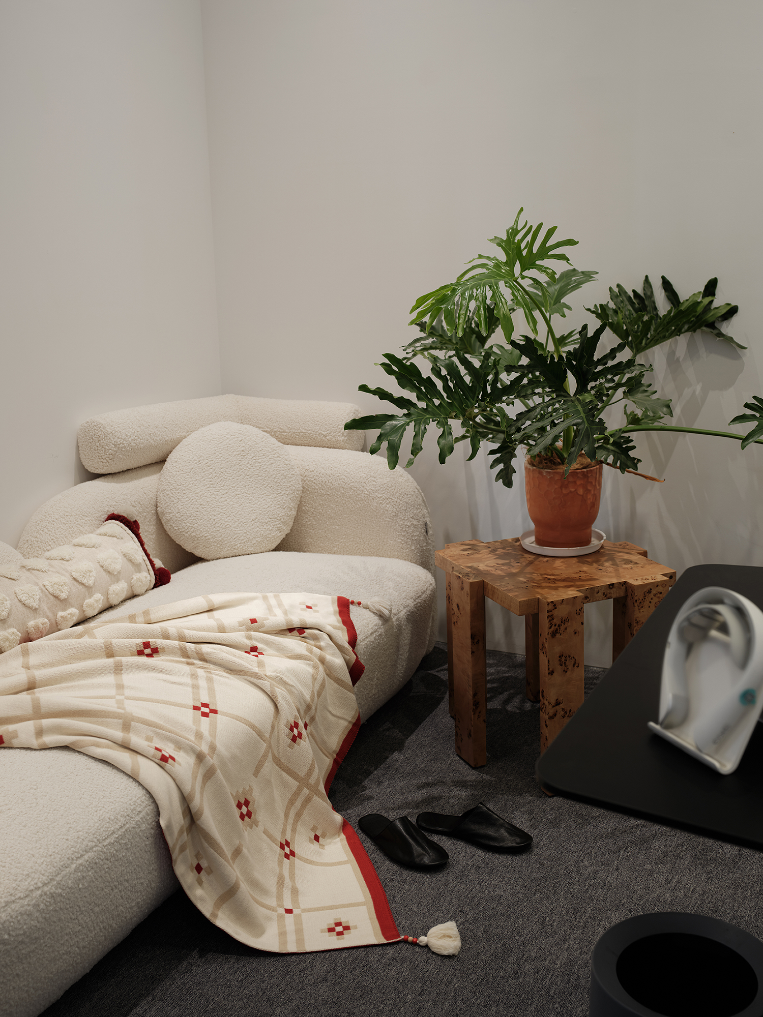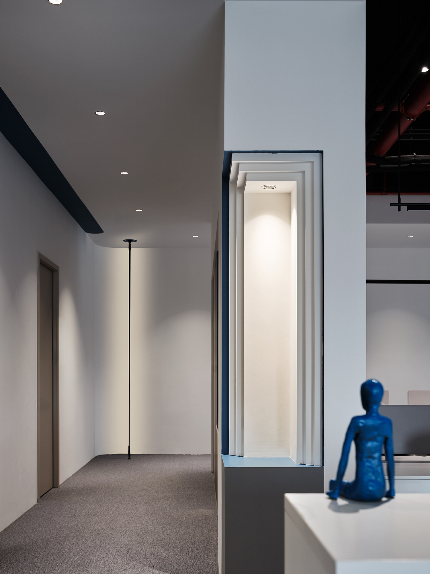 用户体验:在 Blue House 的每个转角,几乎都暗藏设计师精心构思的视觉惊喜。棱角分明的柱体被切割重塑,以重叠方形的姿态嵌入空间,与一旁造型独特的蓝色雕塑遥遥相望,仿佛在进行一场静默的艺术对话。雕塑底座采用蓝色,在精心布置的灯光照射下,光线或柔和漫射,或锐利折射,在地面与墙面勾勒出灵动多变的光影图案,为空间注入神秘而富有层次的氛围。