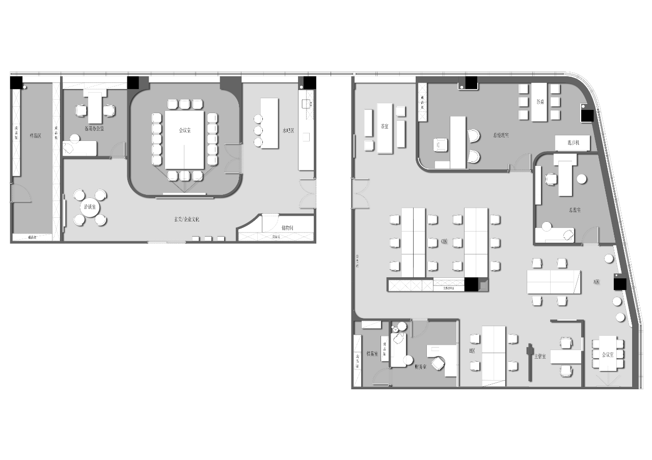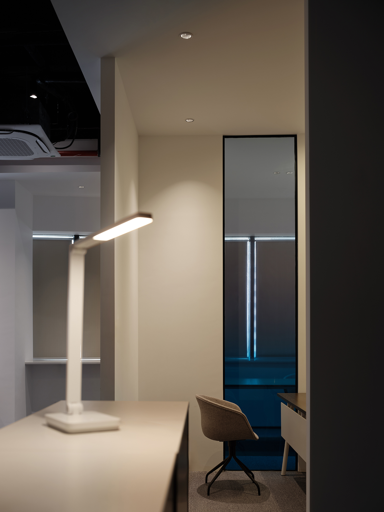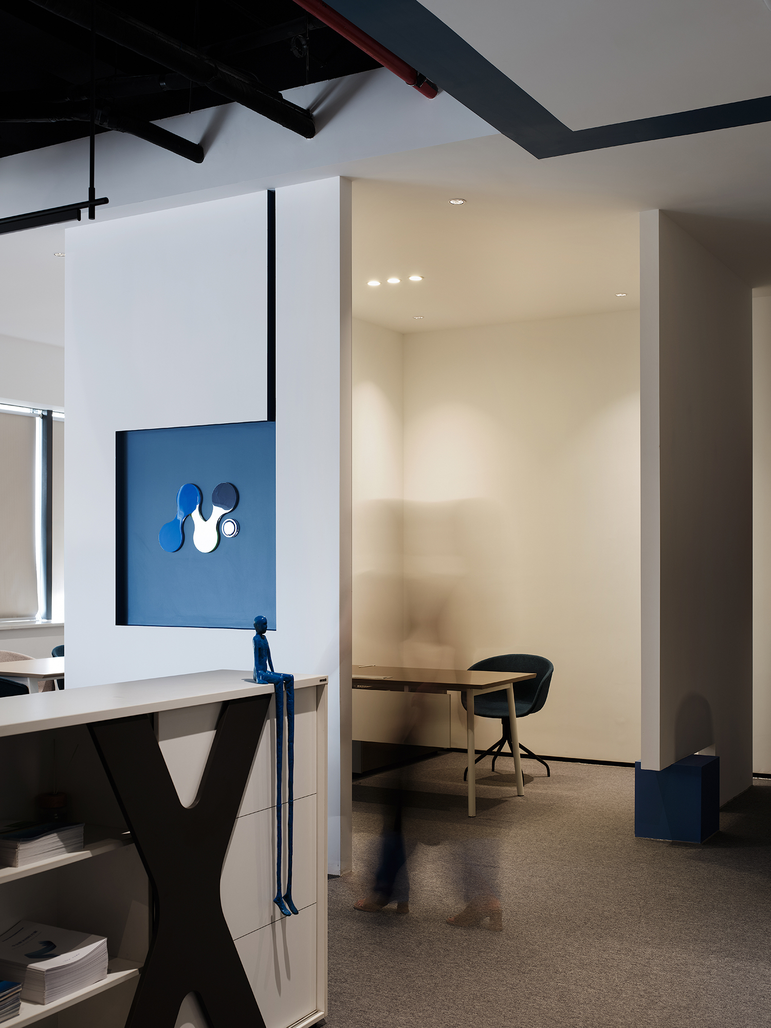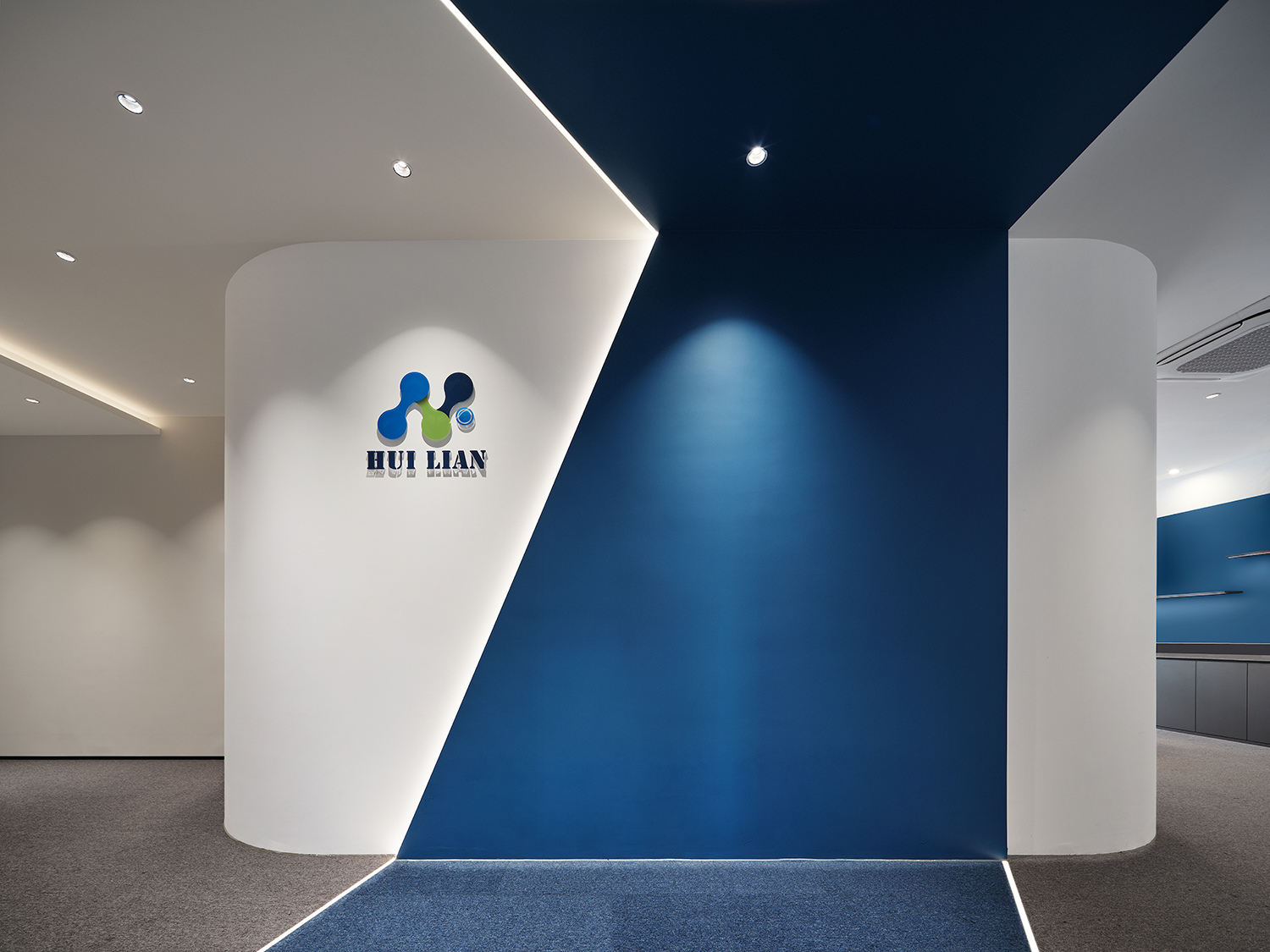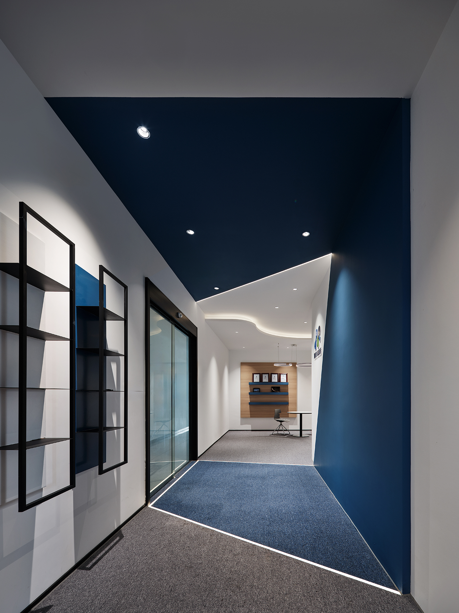 空间意境:在接待区最引人注目的当属白色弧形企业logo墙体,宛如灵动的飘带优雅舒展。“白 + 蓝”结合的几何线条沿着地面蜿蜒而起,顺势攀附墙面,继而流转至顶面,以流畅且富有节奏感的轨迹贯穿整个空间,仿佛赋予线条生命,使其在三维空间中肆意舞动。