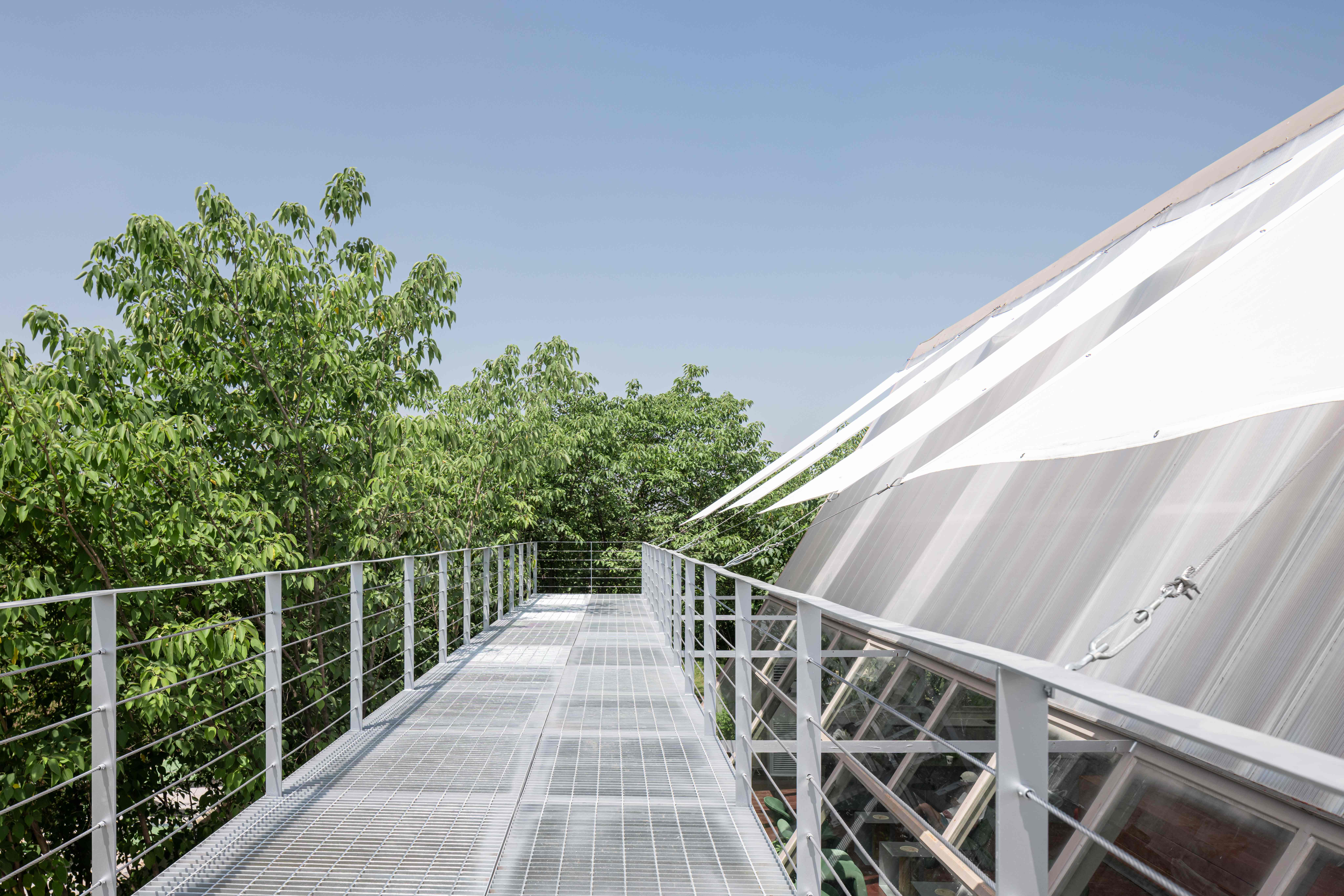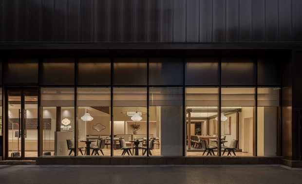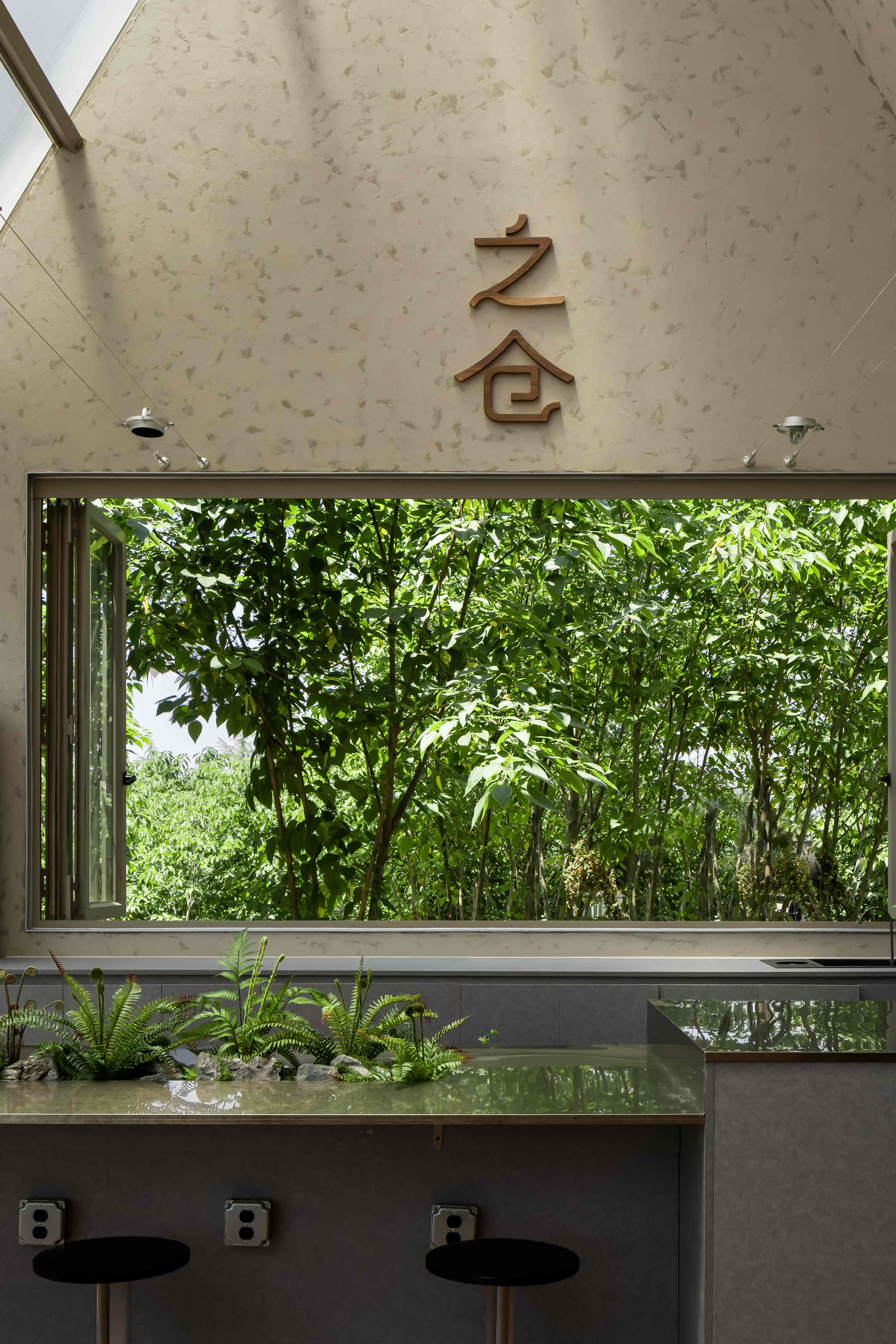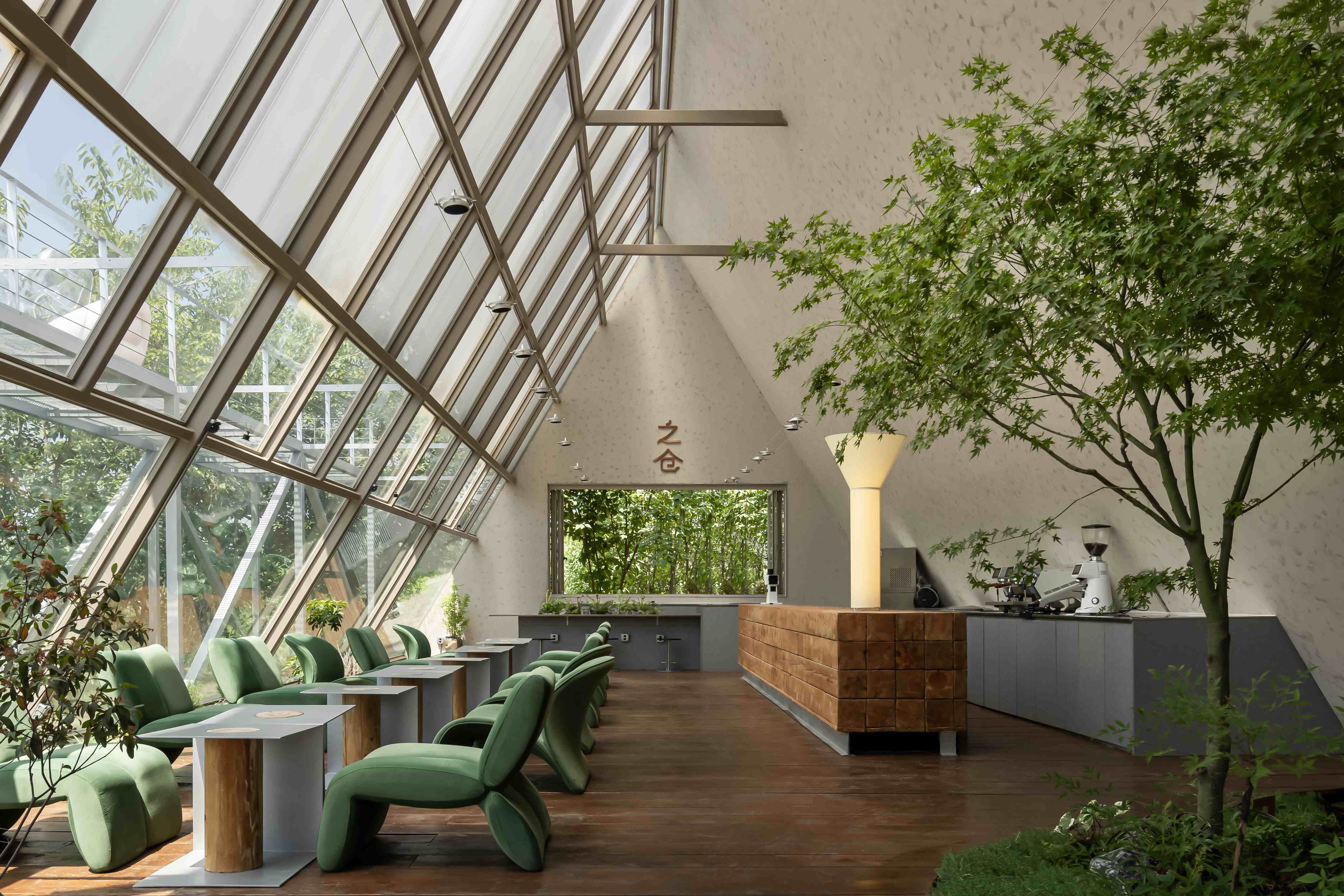 空间布局:之仓咖啡整体建筑通过精妙的结构、材料与空间叙事,将自身塑造为光与自然的容器。朝南的钢构玻璃幕墙将田野景观与天光最大化引入,形成开放通透的视觉主线;北侧阳光板与内置灯带则在夜间转化为柔和的发光体。南北立面“虚与实”的对比,不仅调控了光与视线,更丰富了建筑的内外感知层次。平面布局紧扣功能性与体验感:操作台靠北,零售区临西窗,旋转楼梯串联艺术展陈,形成清晰而流动的运营与参观动线。室内植树、西侧横窗取景等策略,进一步消融了建筑与自然的边界,使空间最终成为自然场域中一个含蓄而动人的存在。