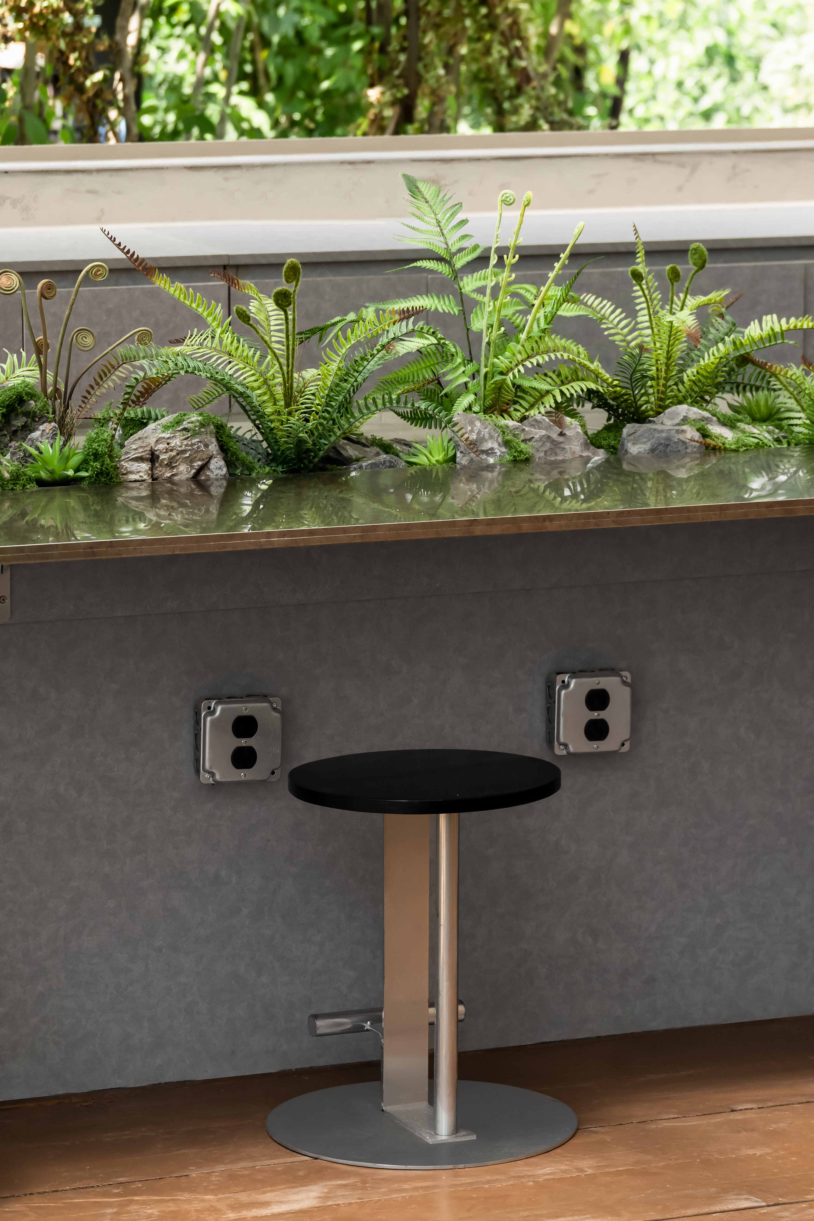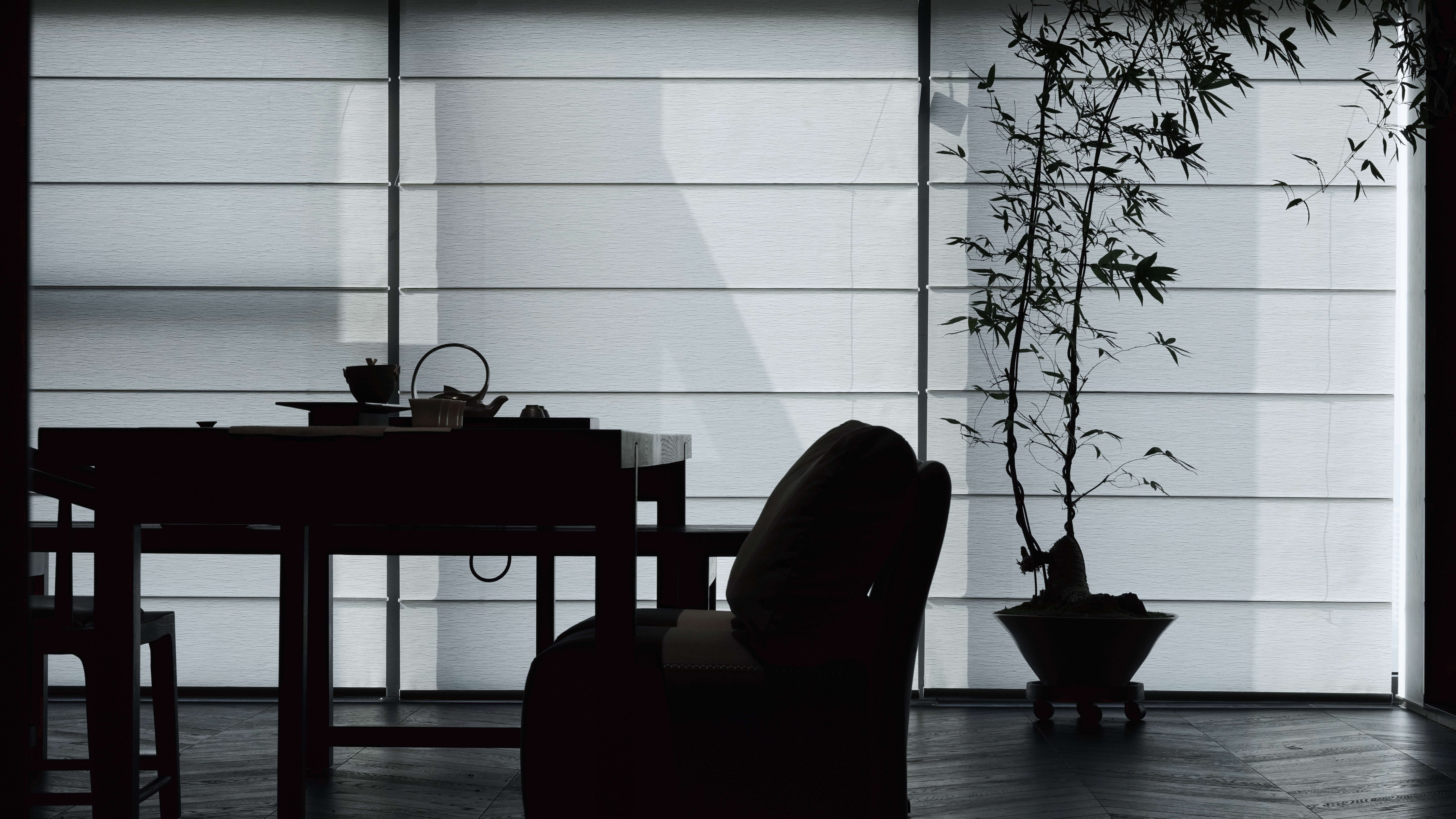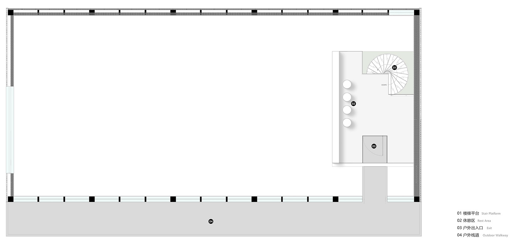 空间布局:之仓咖啡整体建筑通过精妙的结构、材料与空间叙事,将自身塑造为光与自然的容器。朝南的钢构玻璃幕墙将田野景观与天光最大化引入,形成开放通透的视觉主线;北侧阳光板与内置灯带则在夜间转化为柔和的发光体。南北立面“虚与实”的对比,不仅调控了光与视线,更丰富了建筑的内外感知层次。平面布局紧扣功能性与体验感:操作台靠北,零售区临西窗,旋转楼梯串联艺术展陈,形成清晰而流动的运营与参观动线。室内植树、西侧横窗取景等策略,进一步消融了建筑与自然的边界,使空间最终成为自然场域中一个含蓄而动人的存在。