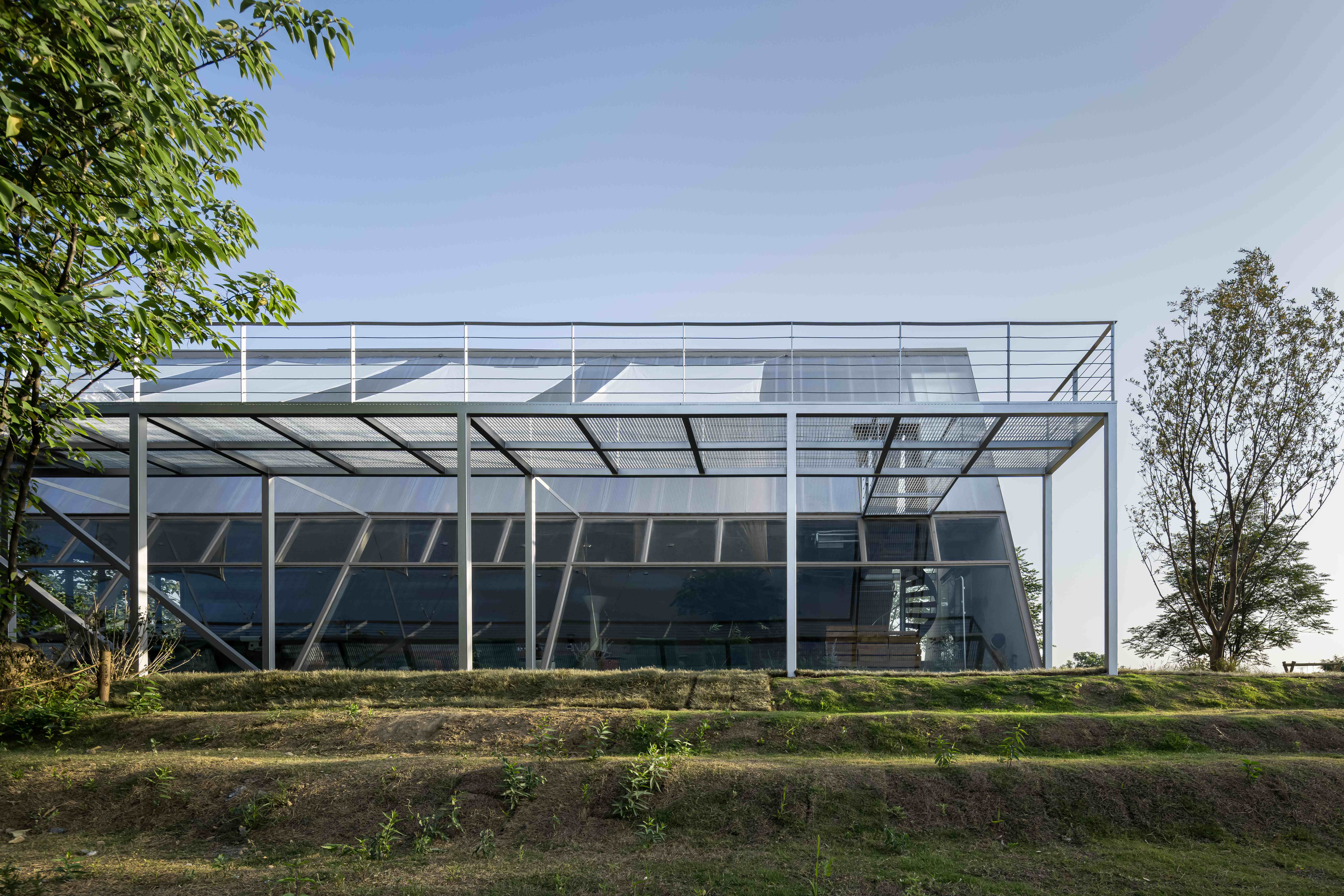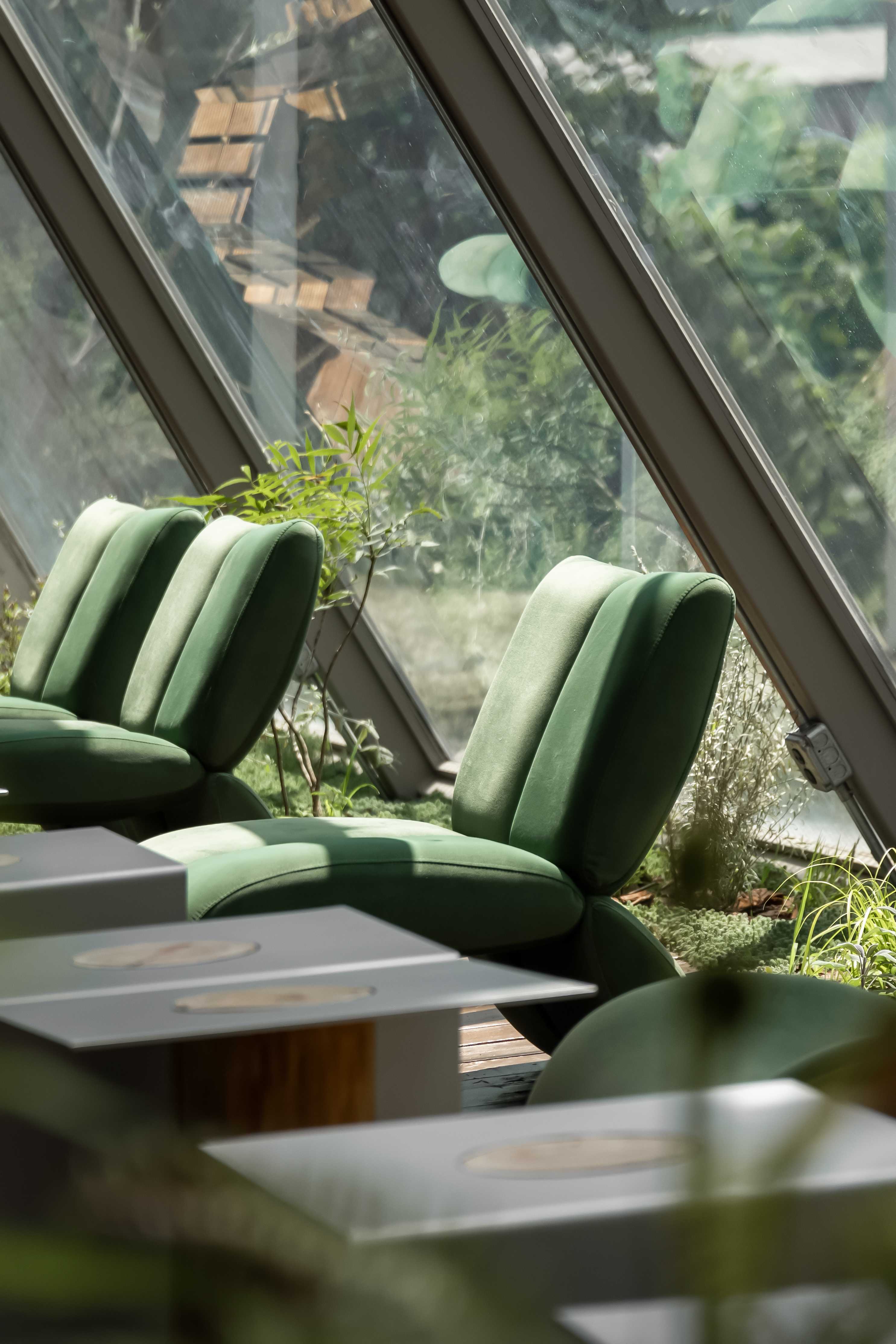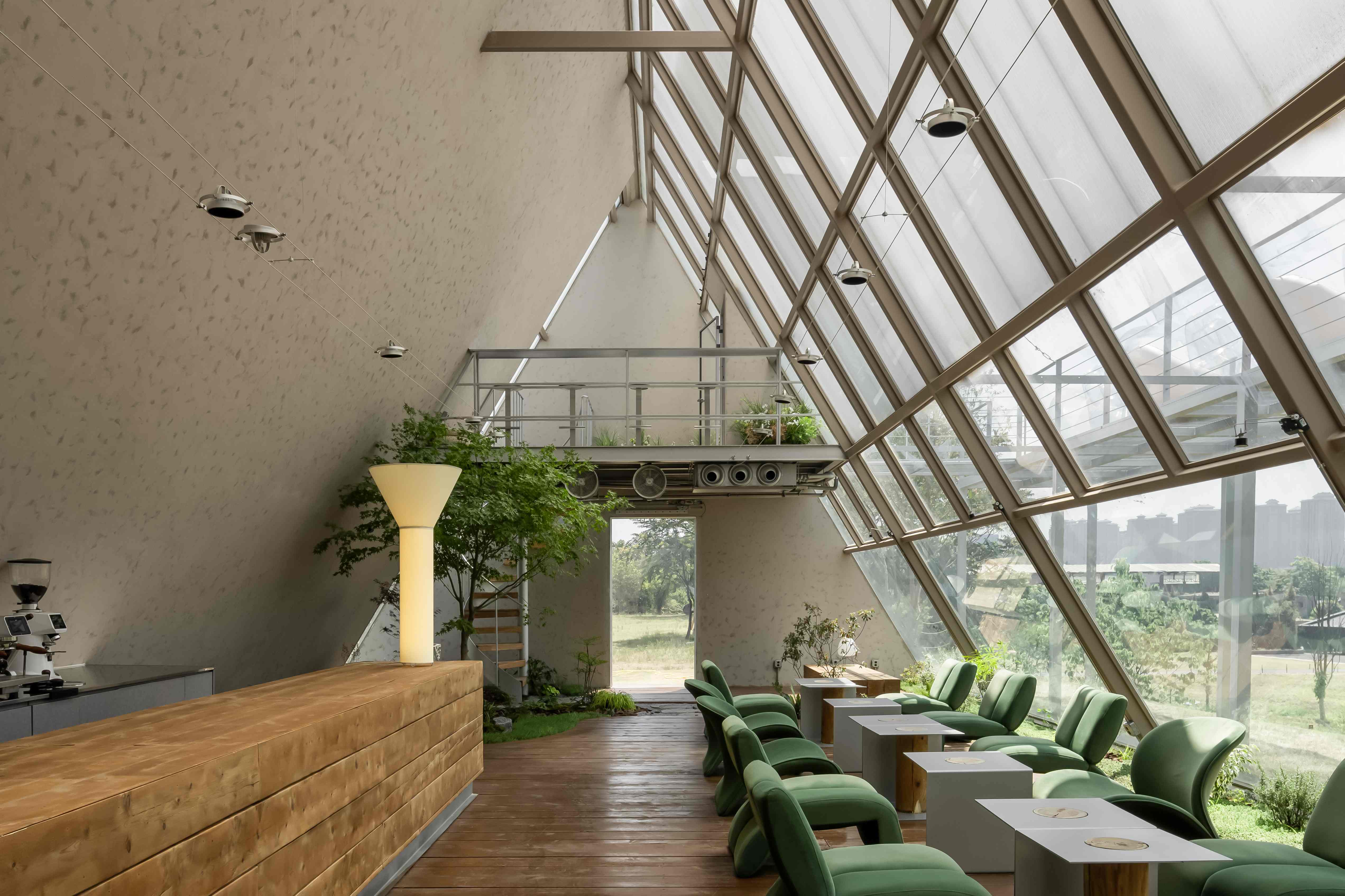空间意境:整体设计保留了原始地形与植被,场地的高低起伏与树木分布,形成自然的环绕动线。建筑选址于农场中心制高点,视野开阔。基于原有树木围合成的三角形空地,抽象出三棱柱几何体作为核心概念,并将其旋转90度,使矩形底面着地。这一设计既为建筑带来了结构稳定性和抵御多变天气的能力,又通过形体自下而上的收束态势,在视觉上强化了聚焦感与庇护感,使咖啡馆成为高地之上的精神顶点,营造出层层递进的场所趣味。其创新点在于将品牌理念“光的容器”贯穿于整个空间设计,从味觉、视觉与精神多维度的沉浸式体验。