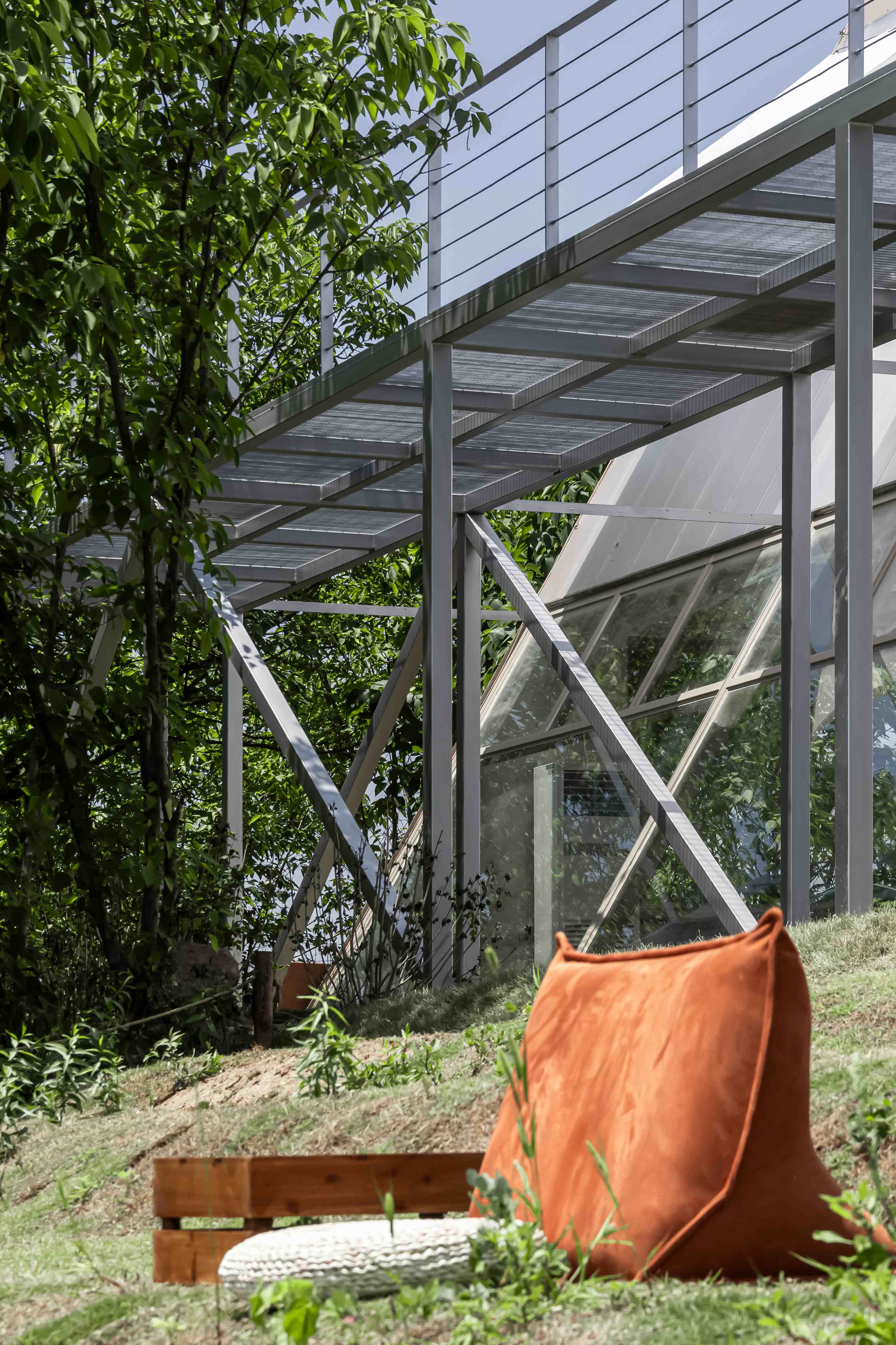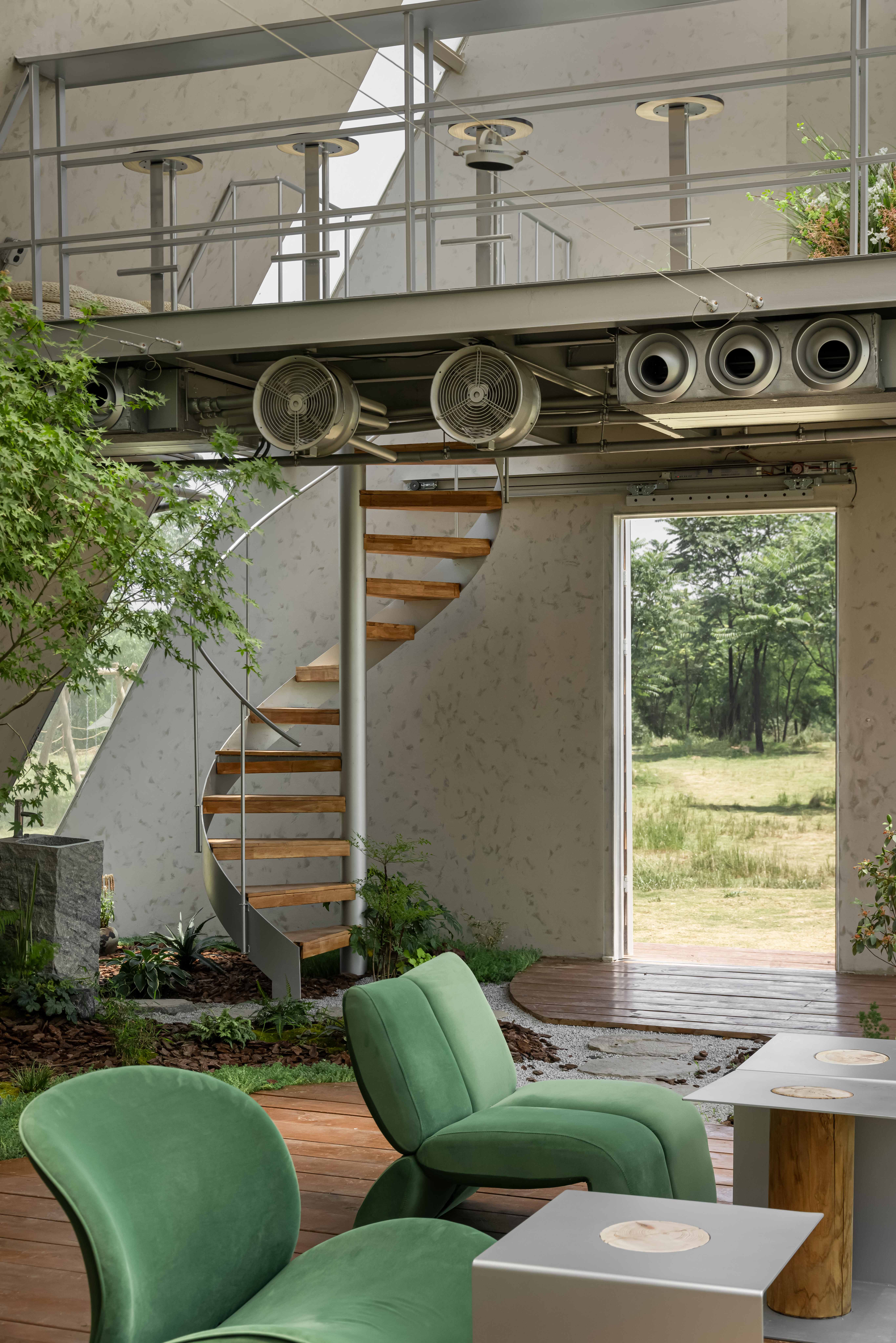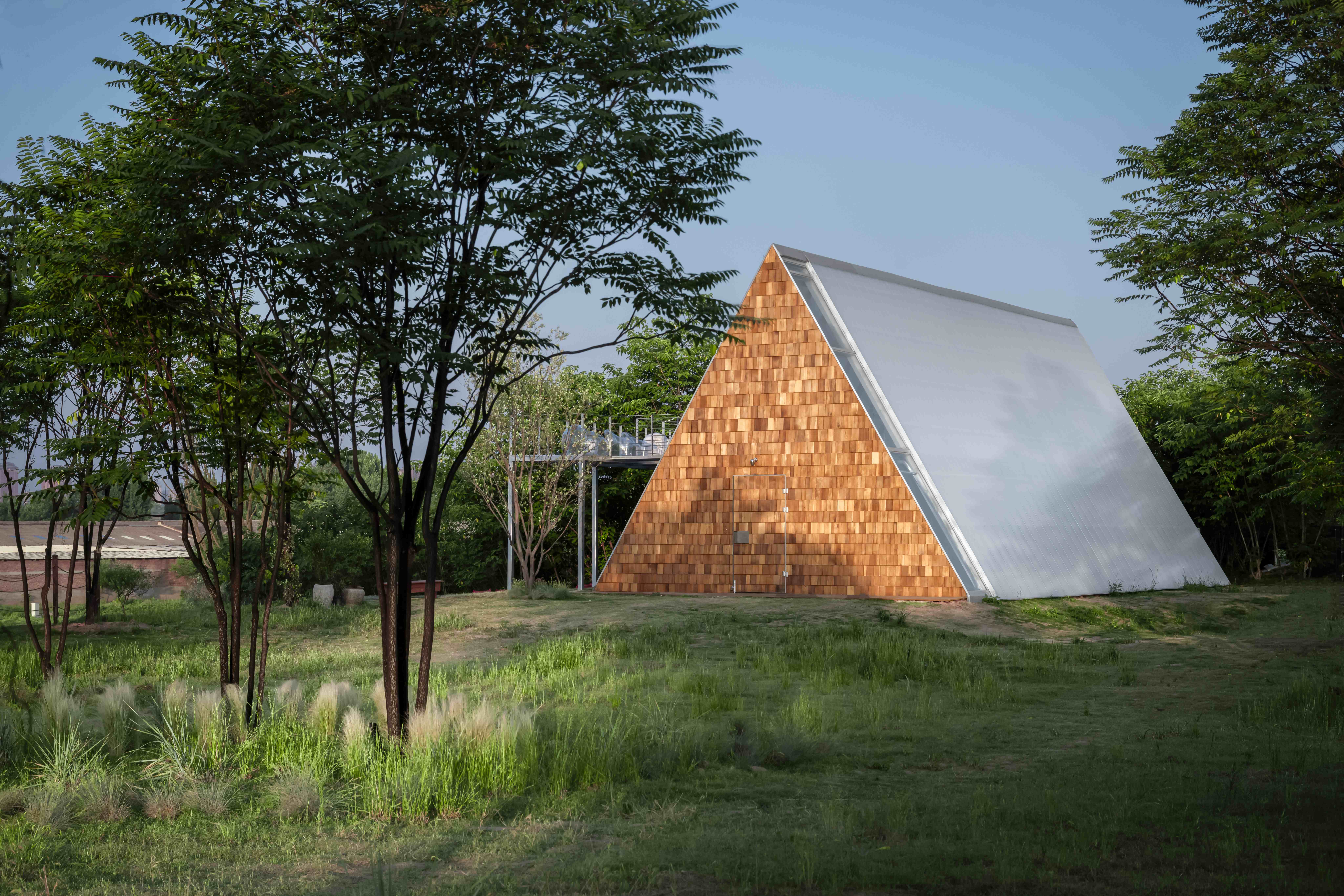 设计选材:选材策略紧密围绕自然质感、耐用性与经济性的平衡。木瓦与木材的暖色调及天然纹理,融入场地环境并营造亲和力;金属、镀锌钢板则以冷峻质感形成对比,提升现代感与结构清晰度。涂料与艺术涂料控制整体色彩氛围,同时兼顾防火与耐候性,确保在开放农场环境中的安全与持久维护。