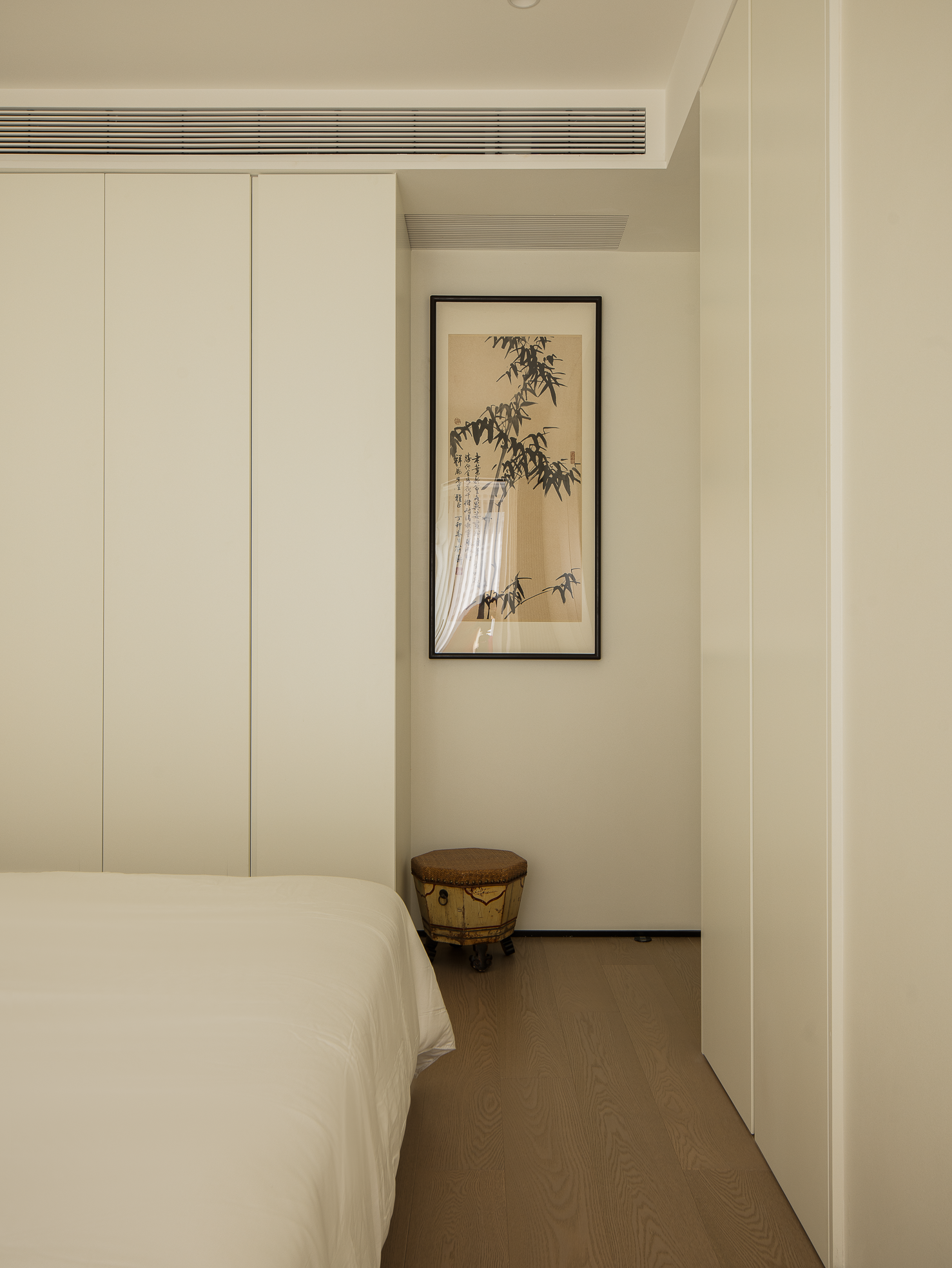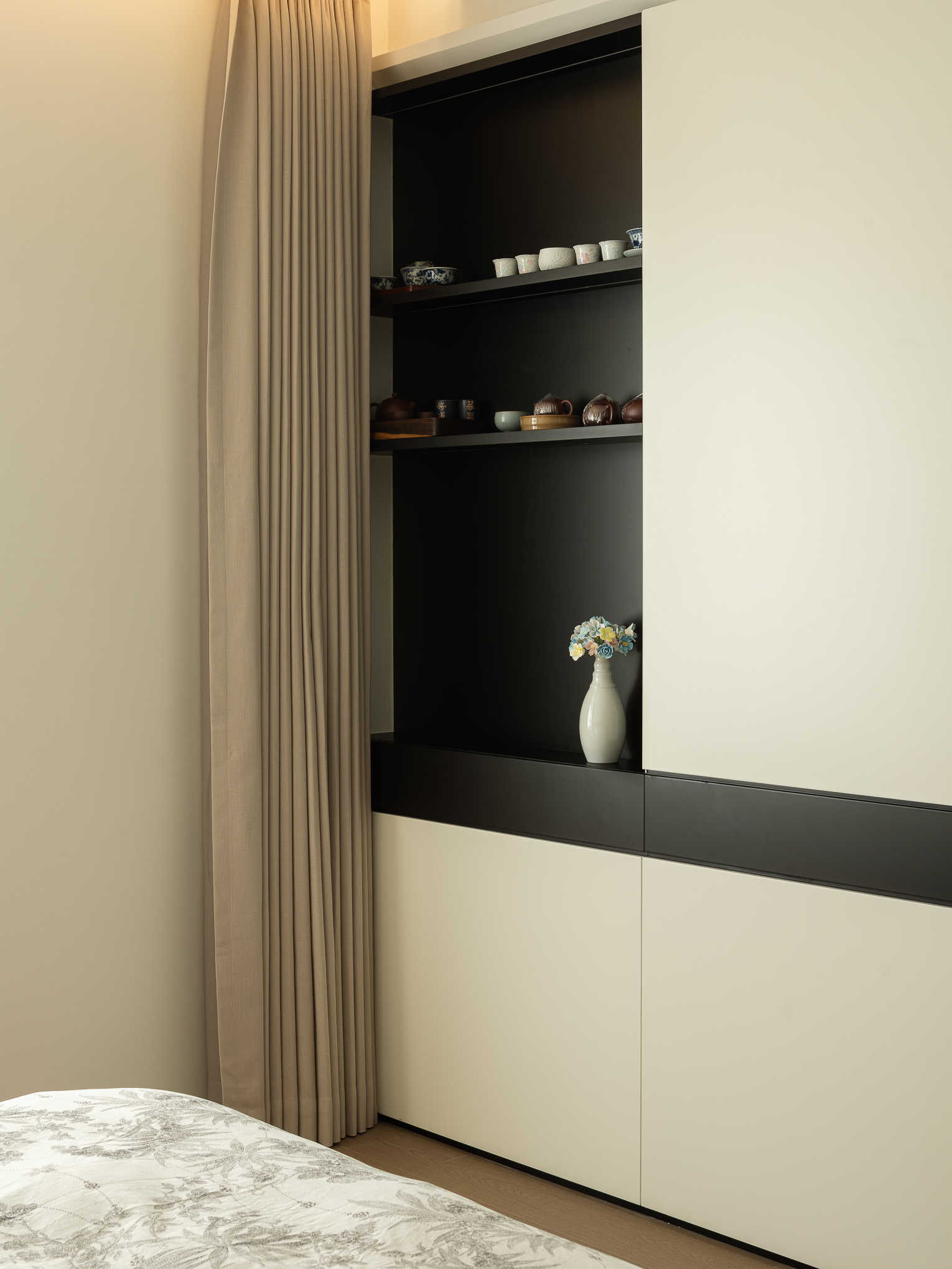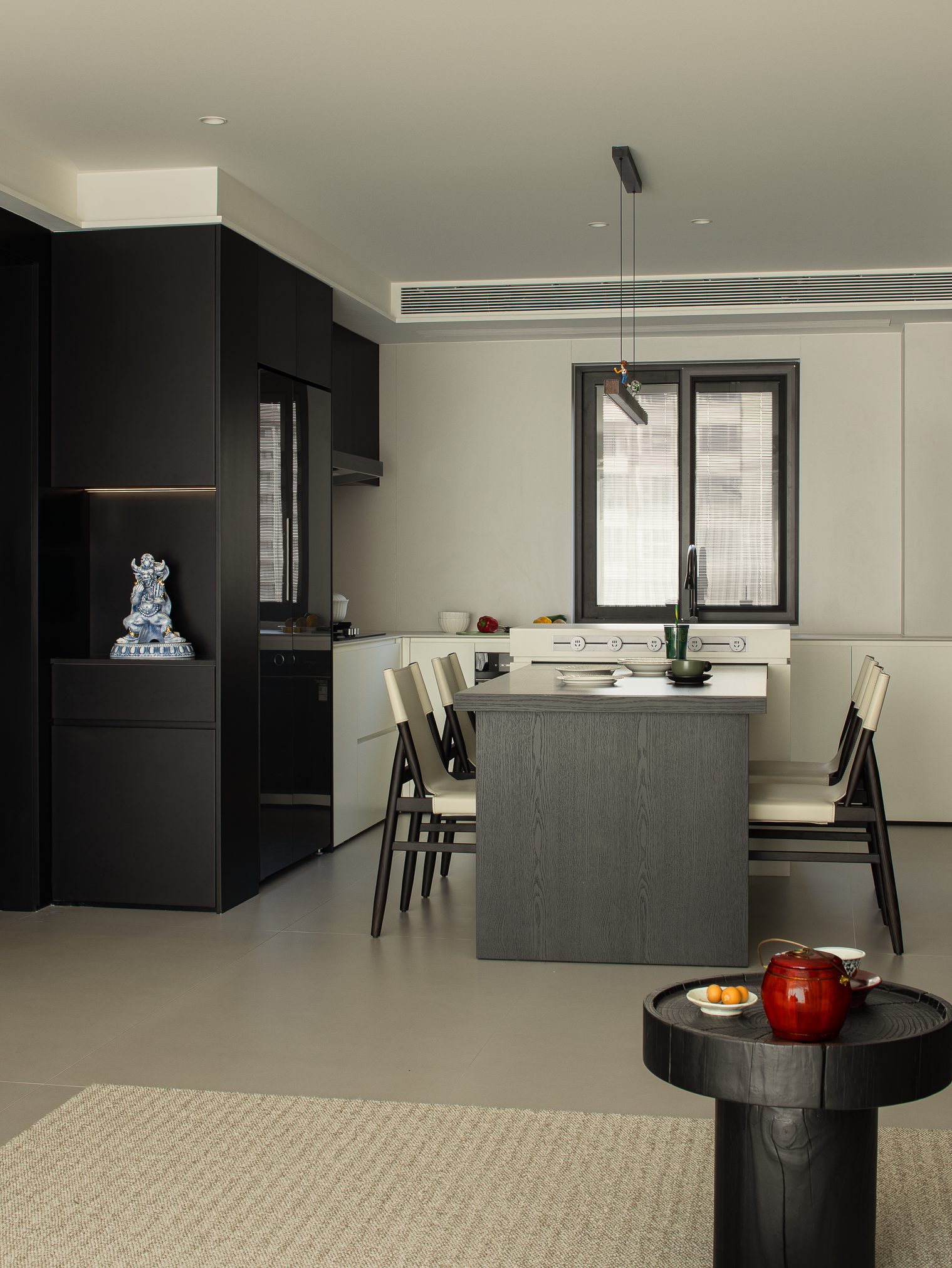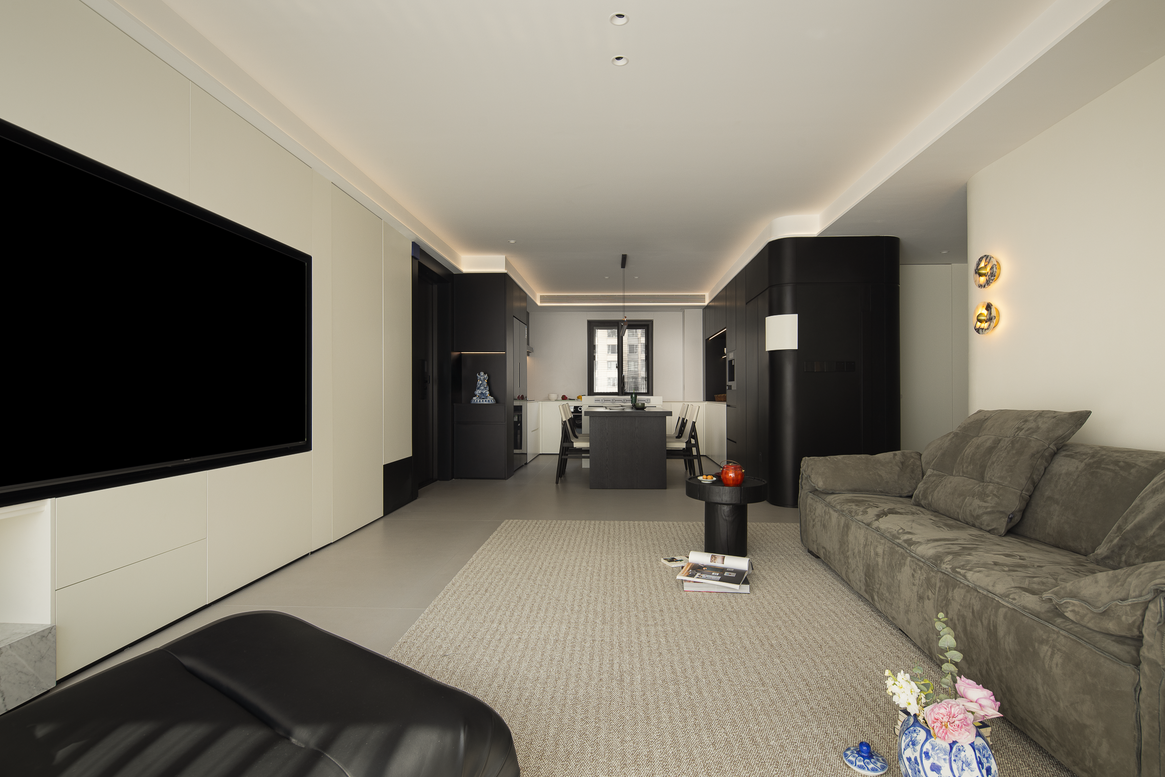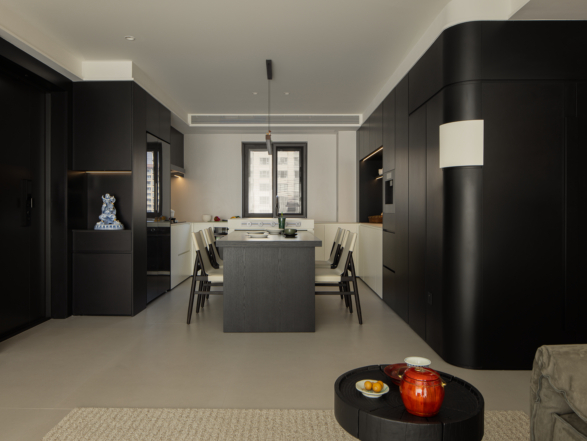 空间意境:公共区采用无主灯设计,搭建流畅的一体化结构,以此修饰层高。设计在生活功能的考量中,布局了高效的收纳体系:电视机柜、餐边柜、转角柜体互相搭配,将不同区域和不同类型的生活用品进行便捷归类,保障公共区干净整洁。业主喜欢将收藏的字画、器皿、插花作为装饰品,安置在家的各个角落,营造专属的气质氛围。在某个闲暇的午后,安静地坐在沙发前阅读、喝茶,独享宁静时刻。原始餐厨分隔独立,设计将这里打通开放,以餐桌为中心点产生洄游流动,与客厅兼容交互。烹饪、用餐、聚会都能在这里串联一体,成为了一家人的主要活动区域。过道的转角处,巧妙设置了一个「黑色盒子」,作为日常生活的辅助收纳,同时牵引场景过渡,功能与美学一举两得。餐厅和厨房互相包裹、内嵌,共生一体,打破了平铺直叙的功能规划。此番布局也强化了收纳体系,柴米油盐与厨余用品都能安置在更合适的区域,通过暗柜、抽屉的组合设计,极致优化空间利用率。业主只需转身就能快速拿取想要的物品,一举一动间保障了操作的便捷性。厨房调度过道的比例关系,在岛台嵌入烤箱,搭配餐边柜的吧台使用,延伸了中西厨的功能应用。家人们一起制作料理,深入日常与三餐四季,细细品味这场可持续的生活品质。屋主对于主卧的居住体验和收纳的要求比较高,独立衣帽间、宽阔的卫生间、舒适的阳光氛围,都必不可少。朝南的两个卧室合并为主卧套房,于是拥有了一个非常宽阔的衣帽间。卫生间摒弃了门的隔离,打通后形成更柔和的区域过渡。原始的飘窗占据了较多的面积且缺少实用性,直接拆除后让渡了一部分空间,可以放一把单人椅,在这里沐光落座,独享慢节奏生活。
