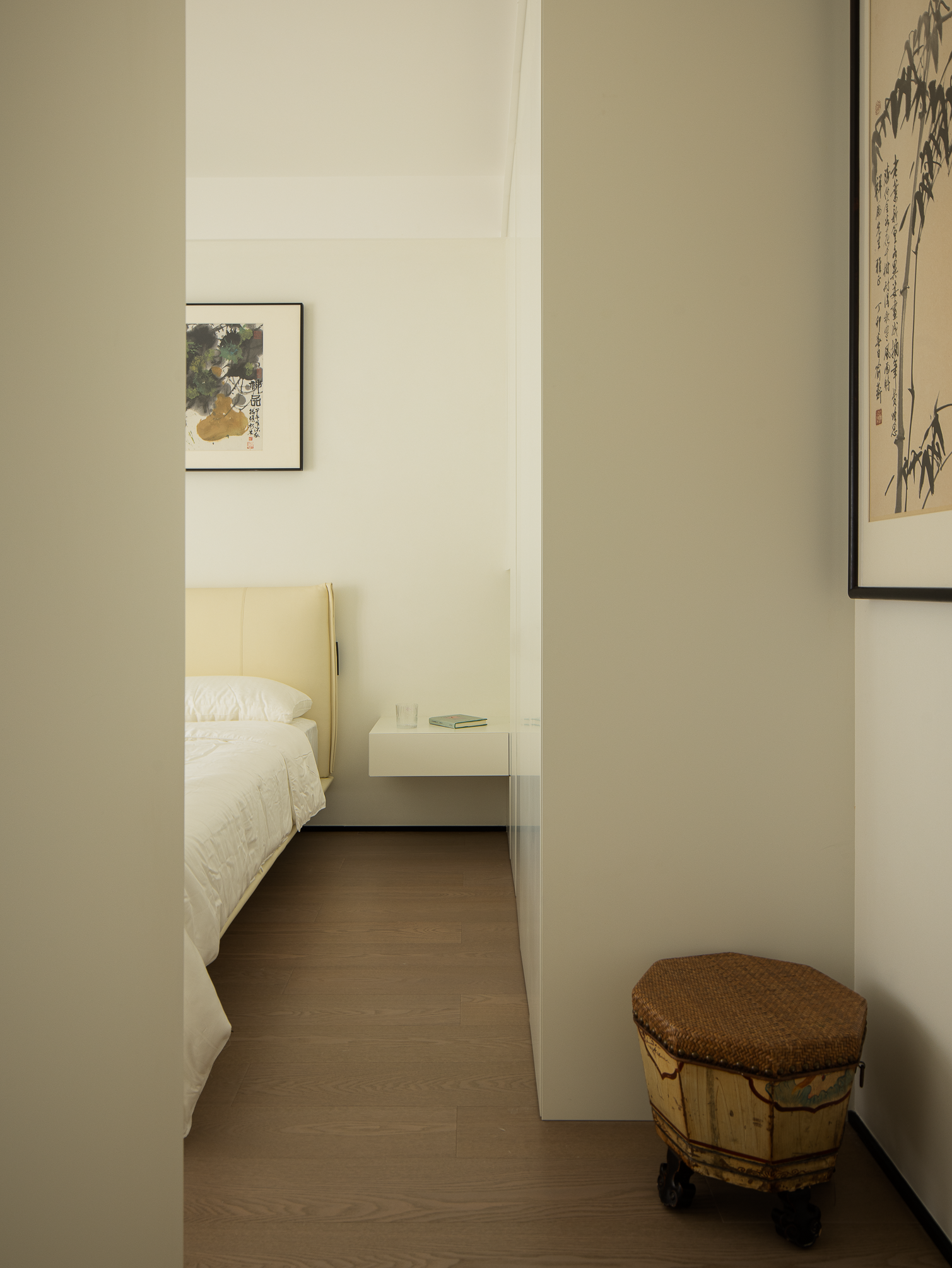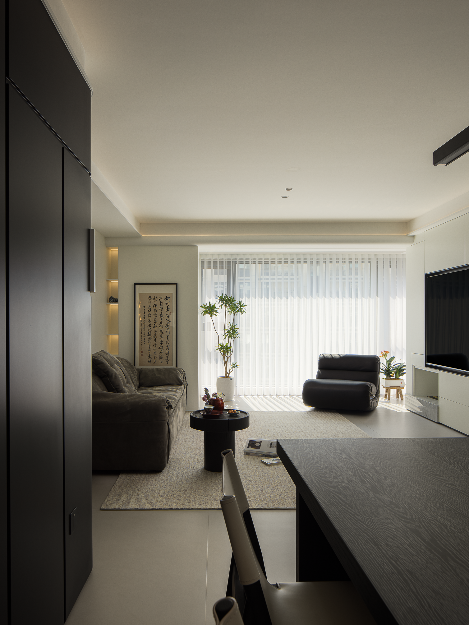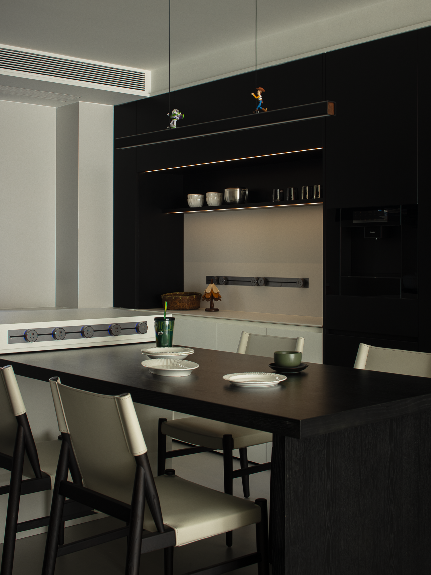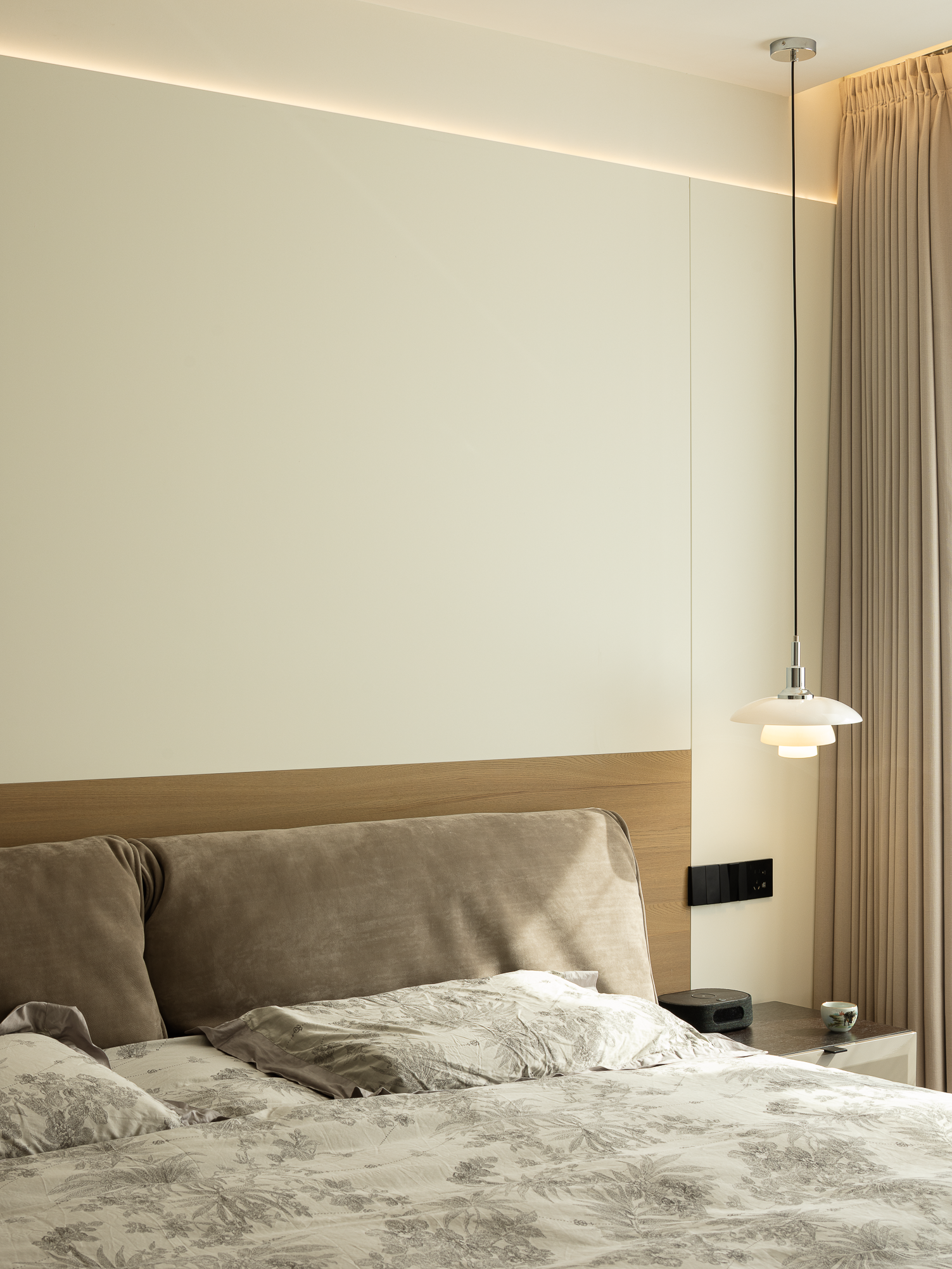 空间意境:公共区采用无主灯设计,搭建流畅的一体化结构,以此修饰层高。设计在生活功能的考量中,布局了高效的收纳体系:电视机柜、餐边柜、转角柜体互相搭配,将不同区域和不同类型的生活用品进行便捷归类,保障公共区干净整洁。业主喜欢将收藏的字画、器皿、插花作为装饰品,安置在家的各个角落,营造专属的气质氛围。在某个闲暇的午后,安静地坐在沙发前阅读、喝茶,独享宁静时刻。原始餐厨分隔独立,设计将这里打通开放,以餐桌为中心点产生洄游流动,与客厅兼容交互。烹饪、用餐、聚会都能在这里串联一体,成为了一家人的主要活动区域。过道的转角处,巧妙设置了一个「黑色盒子」,作为日常生活的辅助收纳,同时牵引场景过渡,功能与美学一举两得。餐厅和厨房互相包裹、内嵌,共生一体,打破了平铺直叙的功能规划。此番布局也强化了收纳体系,柴米油盐与厨余用品都能安置在更合适的区域,通过暗柜、抽屉的组合设计,极致优化空间利用率。业主只需转身就能快速拿取想要的物品,一举一动间保障了操作的便捷性。厨房调度过道的比例关系,在岛台嵌入烤箱,搭配餐边柜的吧台使用,延伸了中西厨的功能应用。家人们一起制作料理,深入日常与三餐四季,细细品味这场可持续的生活品质。屋主对于主卧的居住体验和收纳的要求比较高,独立衣帽间、宽阔的卫生间、舒适的阳光氛围,都必不可少。朝南的两个卧室合并为主卧套房,于是拥有了一个非常宽阔的衣帽间。卫生间摒弃了门的隔离,打通后形成更柔和的区域过渡。原始的飘窗占据了较多的面积且缺少实用性,直接拆除后让渡了一部分空间,可以放一把单人椅,在这里沐光落座,独享慢节奏生活。