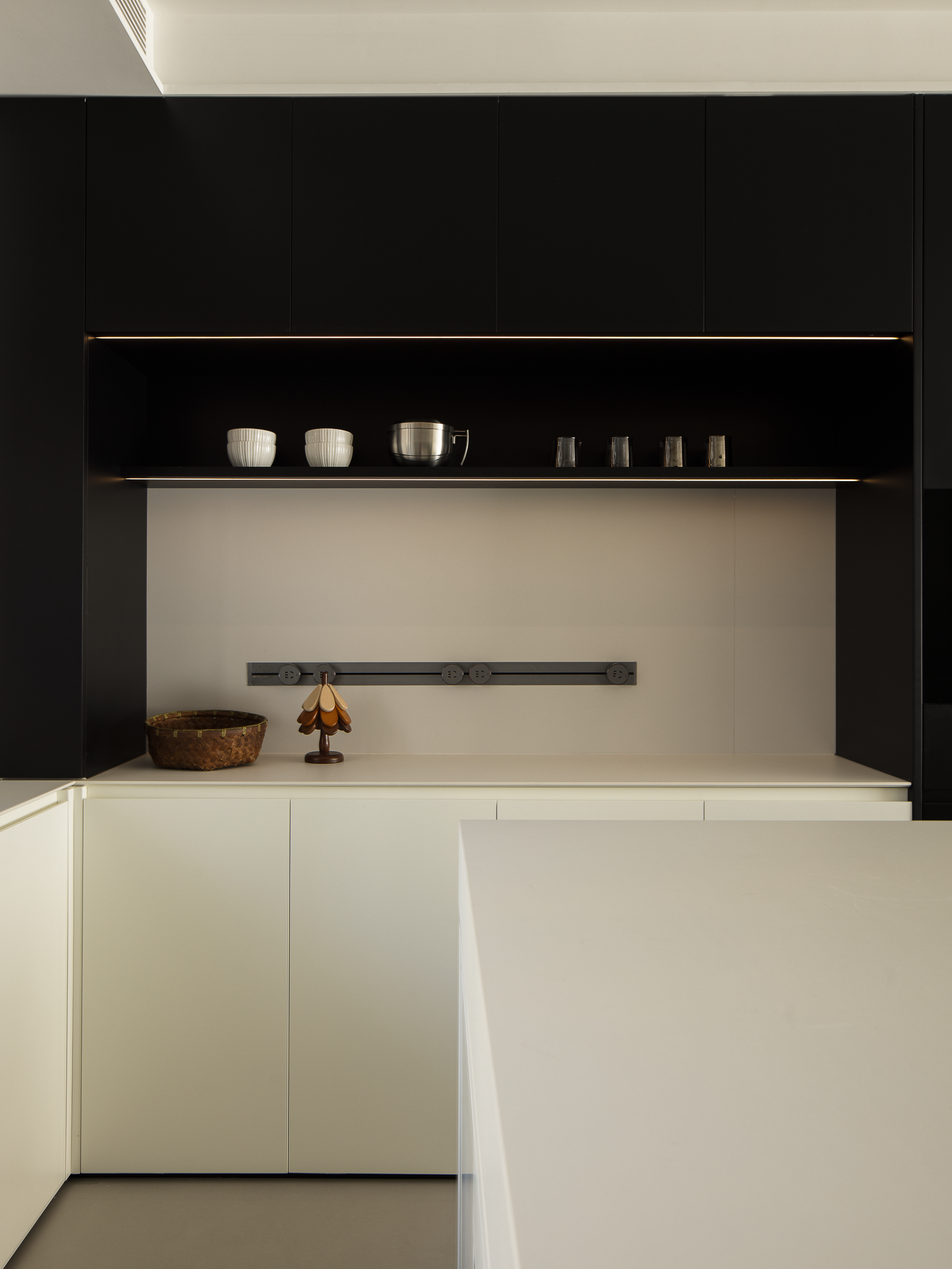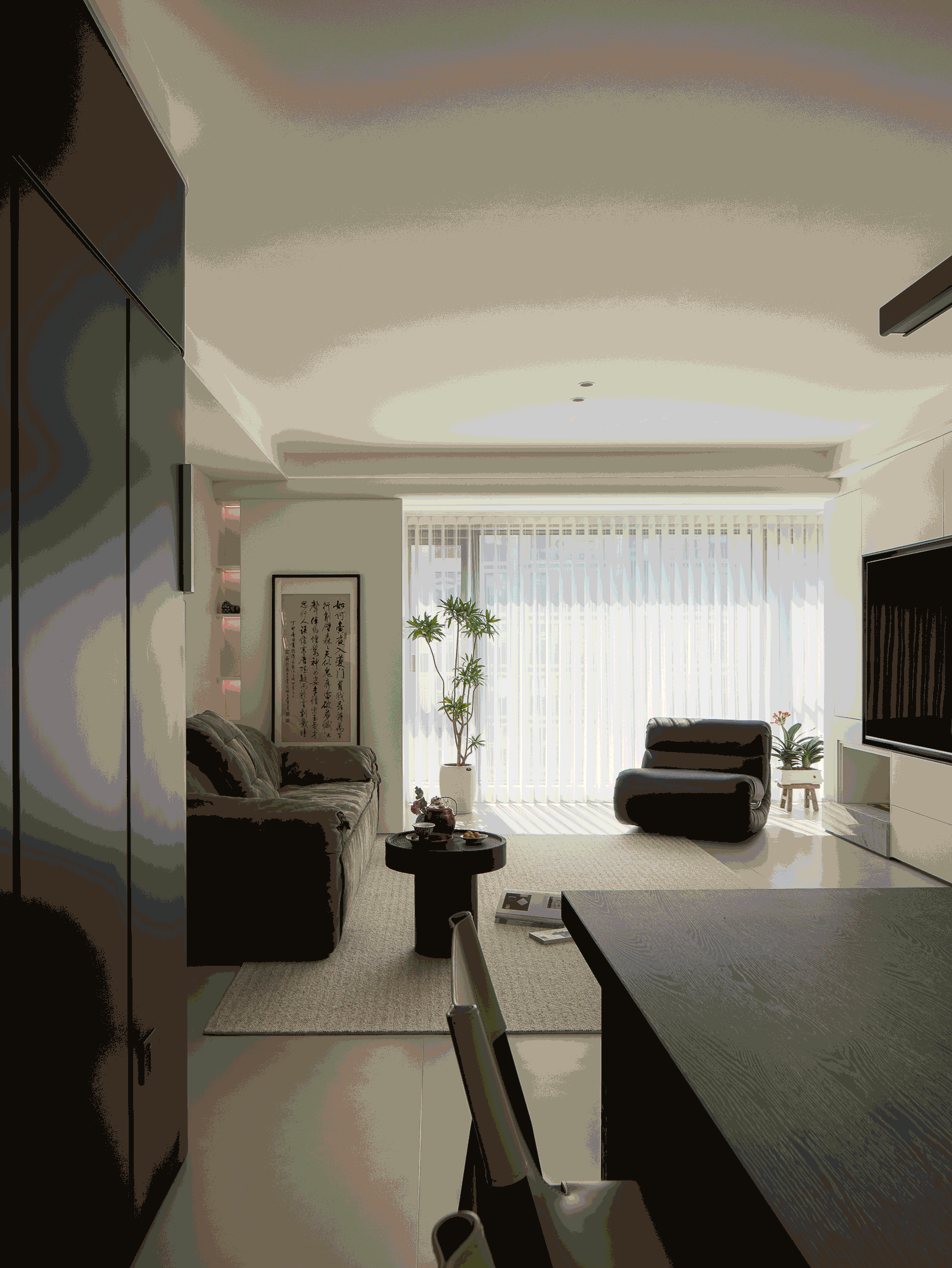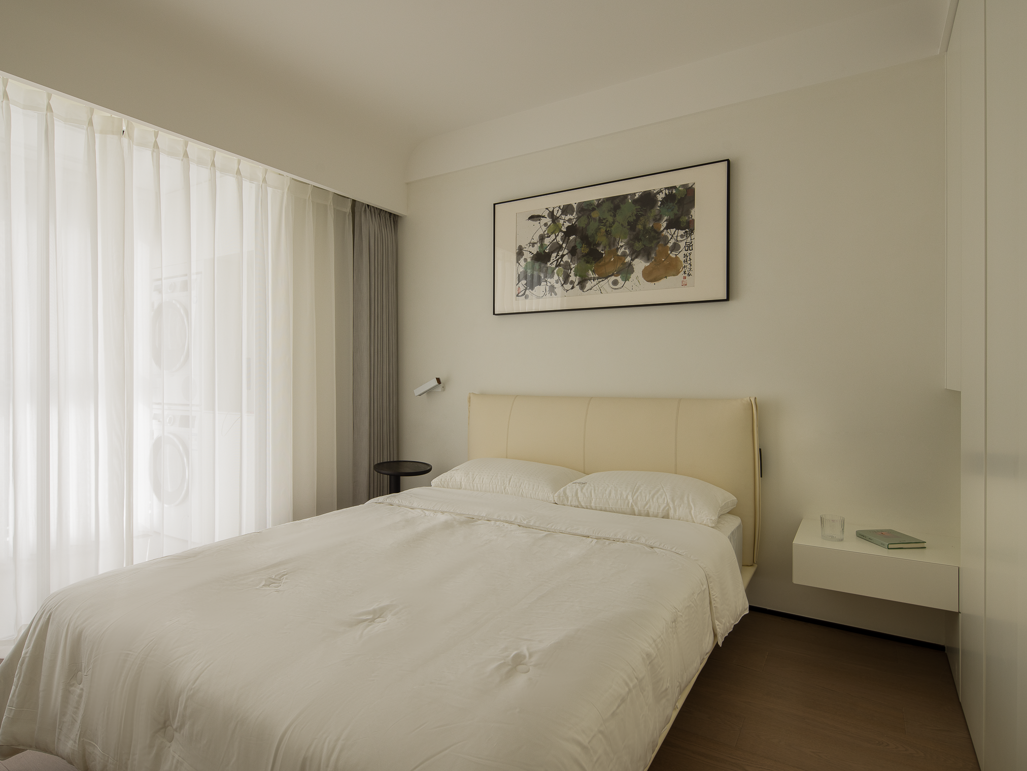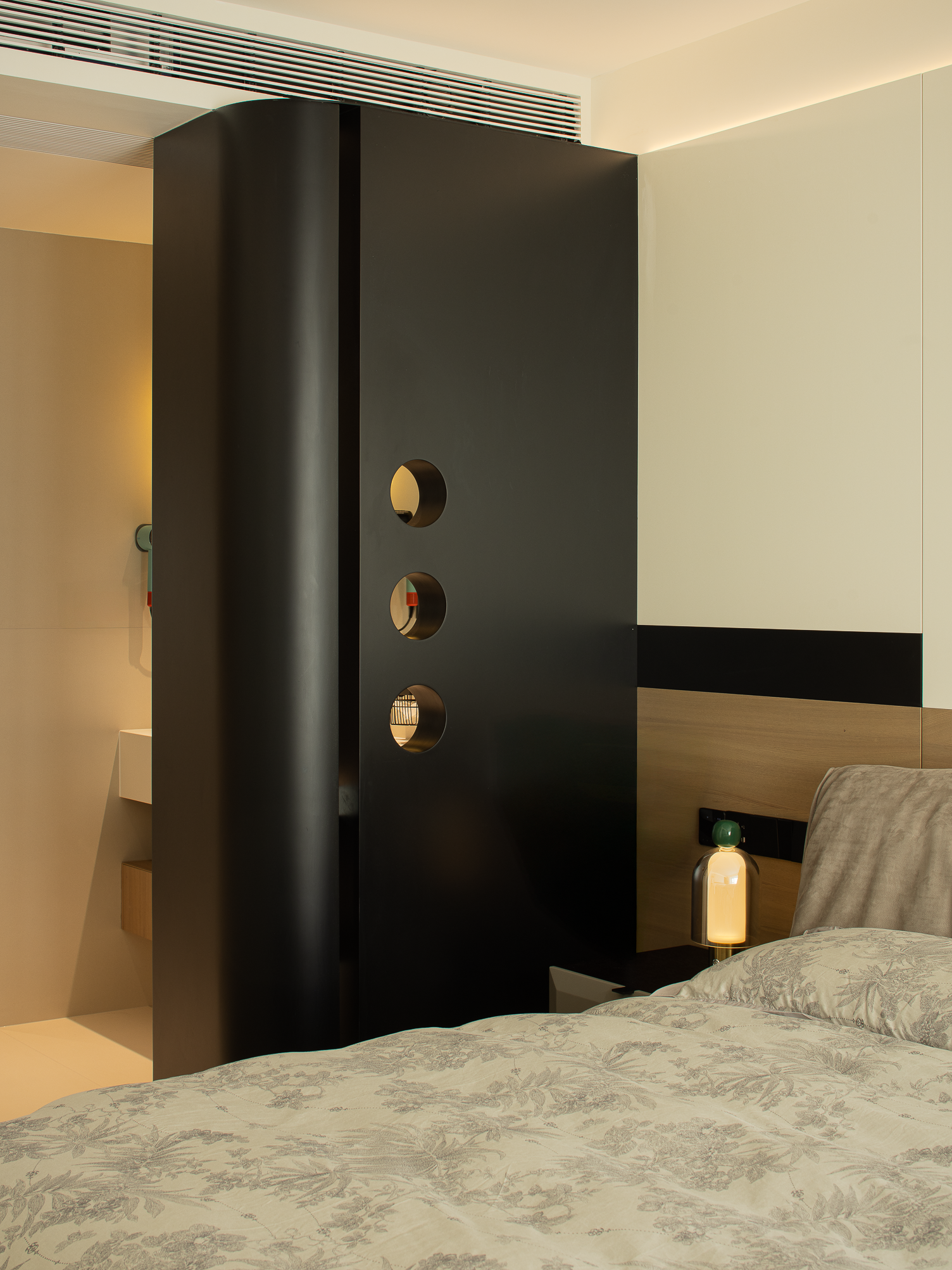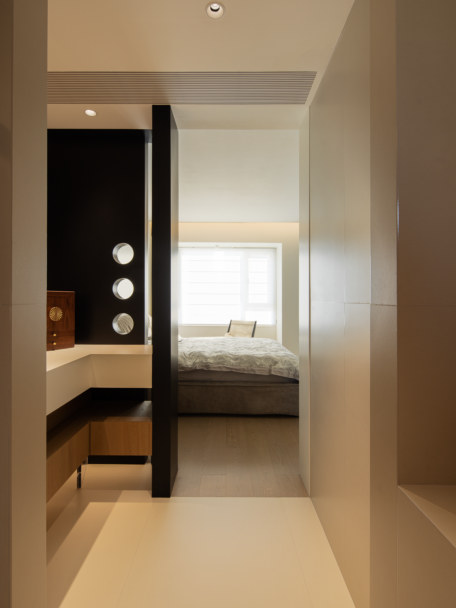 空间意境:公共区采用无主灯设计,搭建流畅的一体化结构,以此修饰层高。设计在生活功能的考量中,布局了高效的收纳体系:电视机柜、餐边柜、转角柜体互相搭配,将不同区域和不同类型的生活用品进行便捷归类,保障公共区干净整洁。业主喜欢将收藏的字画、器皿、插花作为装饰品,安置在家的各个角落,营造专属的气质氛围。在某个闲暇的午后,安静地坐在沙发前阅读、喝茶,独享宁静时刻。原始餐厨分隔独立,设计将这里打通开放,以餐桌为中心点产生洄游流动,与客厅兼容交互。烹饪、用餐、聚会都能在这里串联一体,成为了一家人的主要活动区域。过道的转角处,巧妙设置了一个「黑色盒子」,作为日常生活的辅助收纳,同时牵引场景过渡,功能与美学一举两得。餐厅和厨房互相包裹、内嵌,共生一体,打破了平铺直叙的功能规划。此番布局也强化了收纳体系,柴米油盐与厨余用品都能安置在更合适的区域,通过暗柜、抽屉的组合设计,极致优化空间利用率。业主只需转身就能快速拿取想要的物品,一举一动间保障了操作的便捷性。厨房调度过道的比例关系,在岛台嵌入烤箱,搭配餐边柜的吧台使用,延伸了中西厨的功能应用。家人们一起制作料理,深入日常与三餐四季,细细品味这场可持续的生活品质。屋主对于主卧的居住体验和收纳的要求比较高,独立衣帽间、宽阔的卫生间、舒适的阳光氛围,都必不可少。朝南的两个卧室合并为主卧套房,于是拥有了一个非常宽阔的衣帽间。卫生间摒弃了门的隔离,打通后形成更柔和的区域过渡。原始的飘窗占据了较多的面积且缺少实用性,直接拆除后让渡了一部分空间,可以放一把单人椅,在这里沐光落座,独享慢节奏生活。