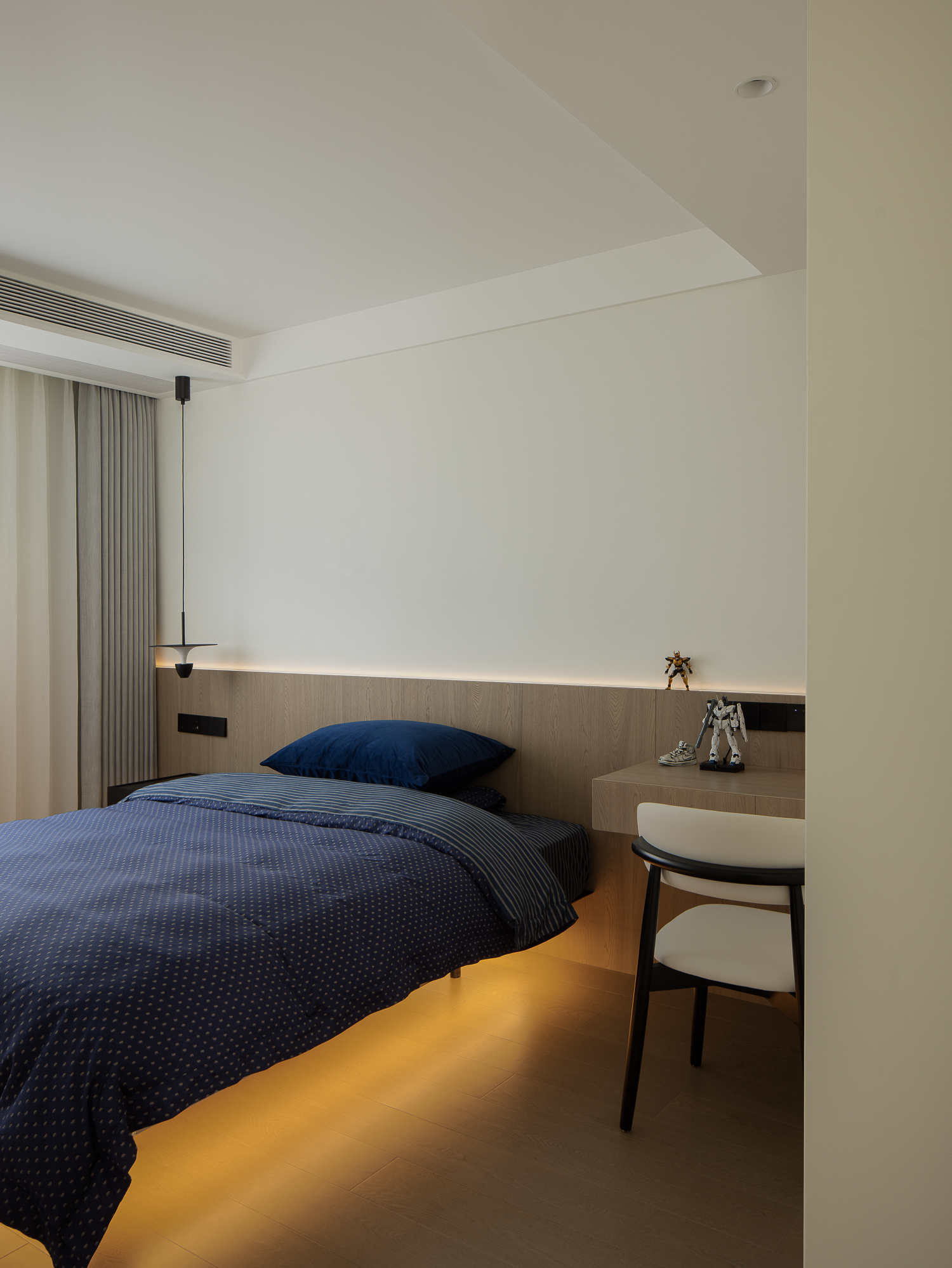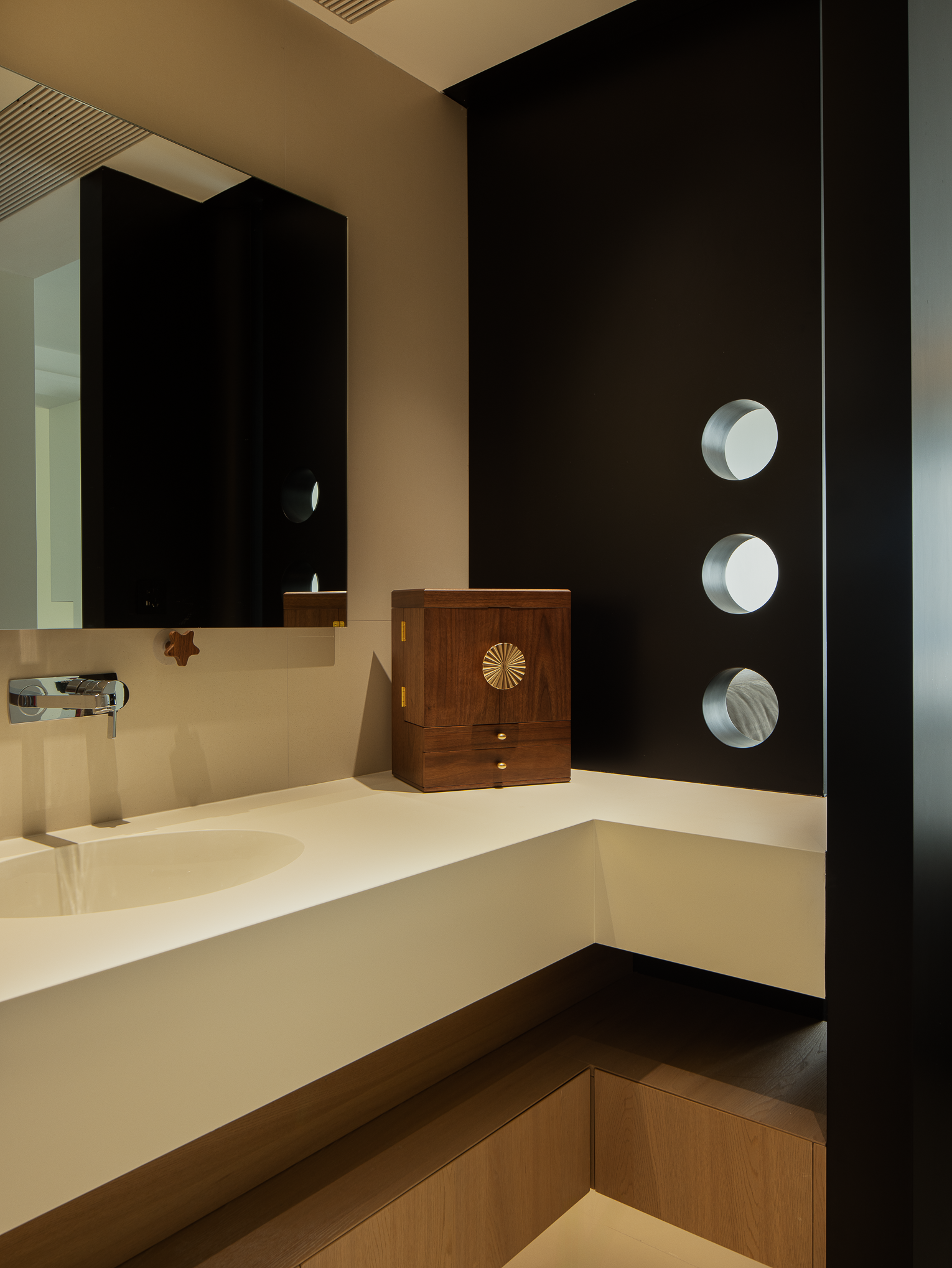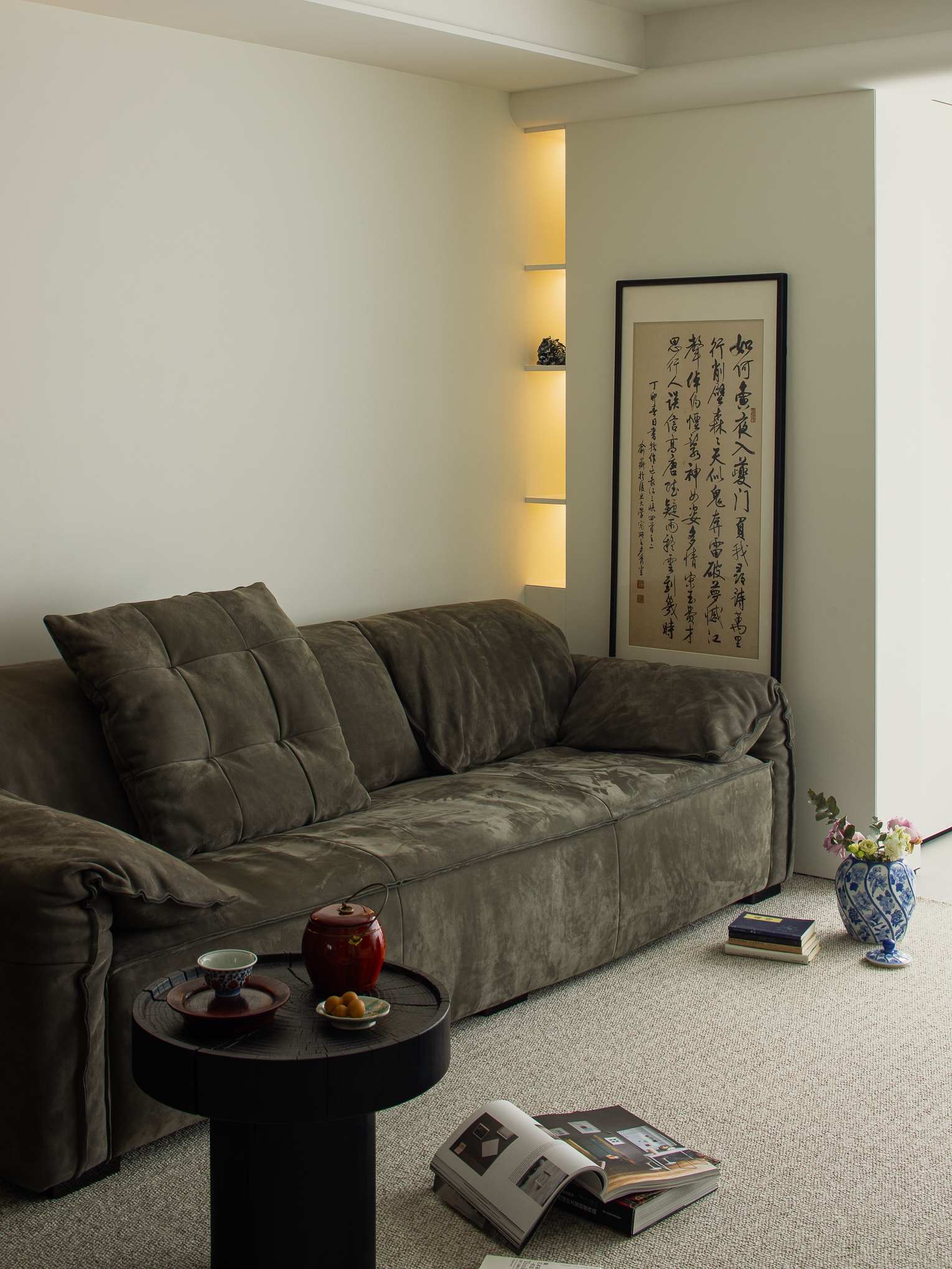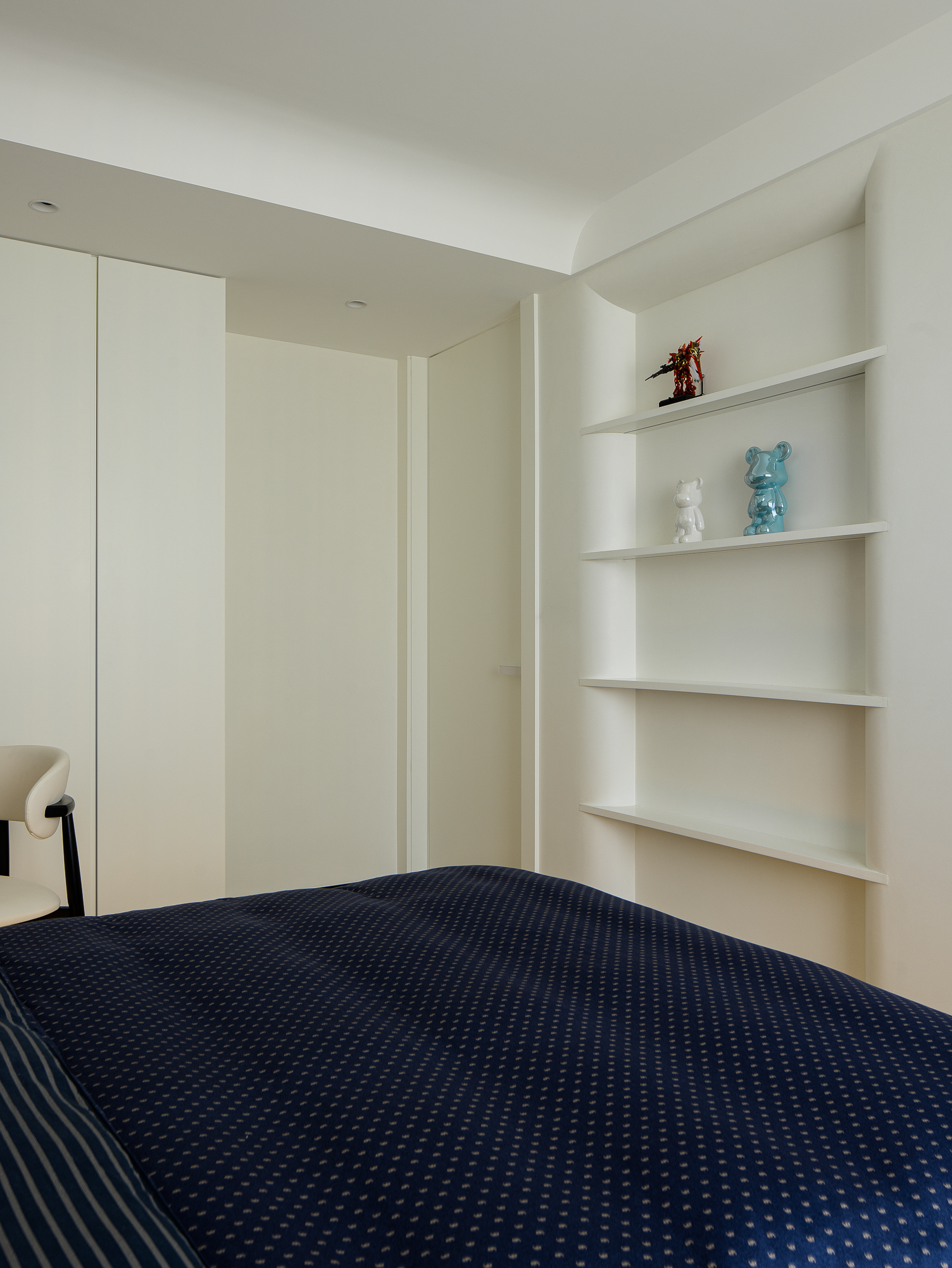 空间意境:公共区采用无主灯设计,搭建流畅的一体化结构,以此修饰层高。设计在生活功能的考量中,布局了高效的收纳体系:电视机柜、餐边柜、转角柜体互相搭配,将不同区域和不同类型的生活用品进行便捷归类,保障公共区干净整洁。业主喜欢将收藏的字画、器皿、插花作为装饰品,安置在家的各个角落,营造专属的气质氛围。在某个闲暇的午后,安静地坐在沙发前阅读、喝茶,独享宁静时刻。原始餐厨分隔独立,设计将这里打通开放,以餐桌为中心点产生洄游流动,与客厅兼容交互。烹饪、用餐、聚会都能在这里串联一体,成为了一家人的主要活动区域。过道的转角处,巧妙设置了一个「黑色盒子」,作为日常生活的辅助收纳,同时牵引场景过渡,功能与美学一举两得。餐厅和厨房互相包裹、内嵌,共生一体,打破了平铺直叙的功能规划。此番布局也强化了收纳体系,柴米油盐与厨余用品都能安置在更合适的区域,通过暗柜、抽屉的组合设计,极致优化空间利用率。业主只需转身就能快速拿取想要的物品,一举一动间保障了操作的便捷性。厨房调度过道的比例关系,在岛台嵌入烤箱,搭配餐边柜的吧台使用,延伸了中西厨的功能应用。家人们一起制作料理,深入日常与三餐四季,细细品味这场可持续的生活品质。屋主对于主卧的居住体验和收纳的要求比较高,独立衣帽间、宽阔的卫生间、舒适的阳光氛围,都必不可少。朝南的两个卧室合并为主卧套房,于是拥有了一个非常宽阔的衣帽间。卫生间摒弃了门的隔离,打通后形成更柔和的区域过渡。原始的飘窗占据了较多的面积且缺少实用性,直接拆除后让渡了一部分空间,可以放一把单人椅,在这里沐光落座,独享慢节奏生活。