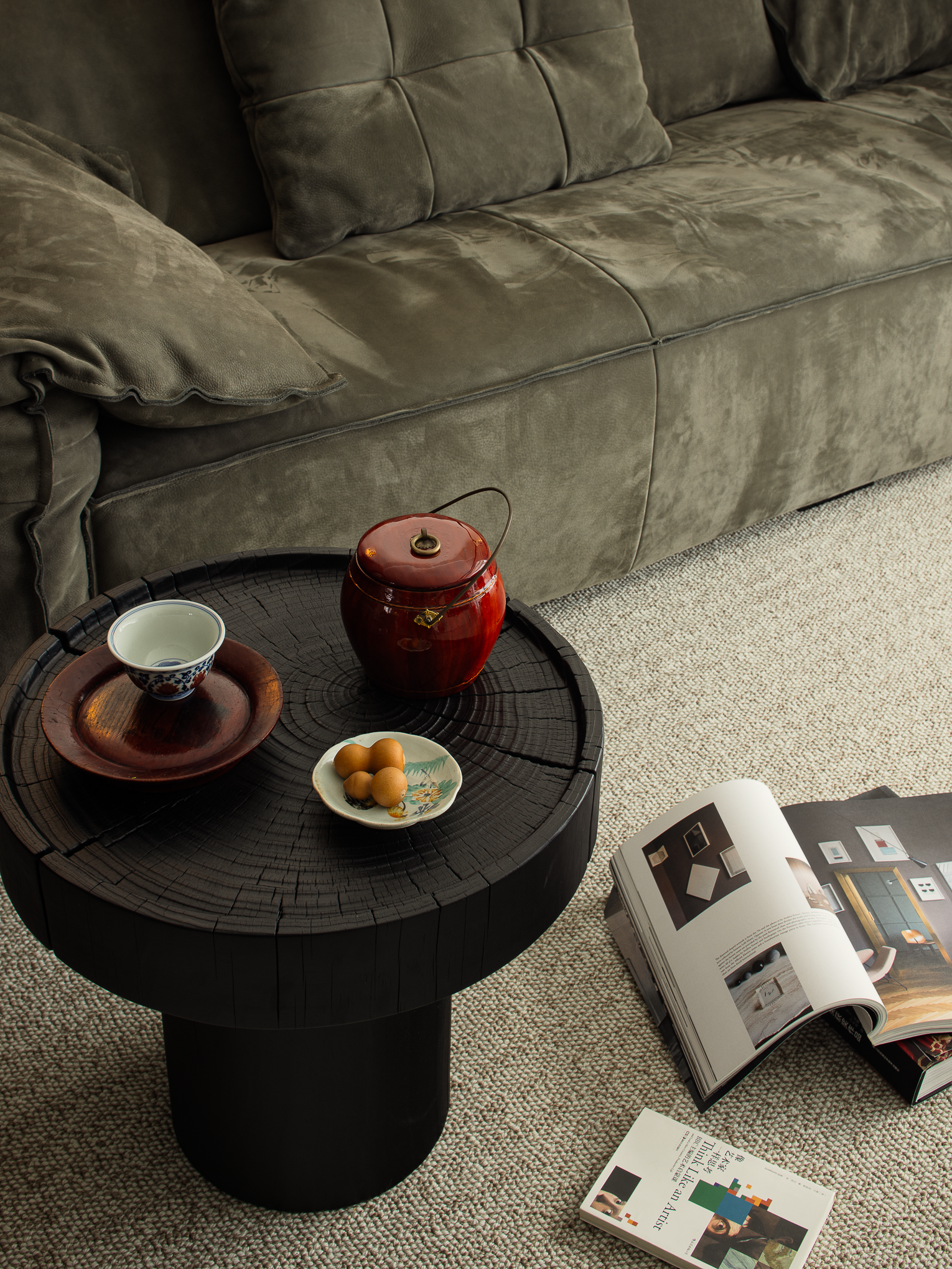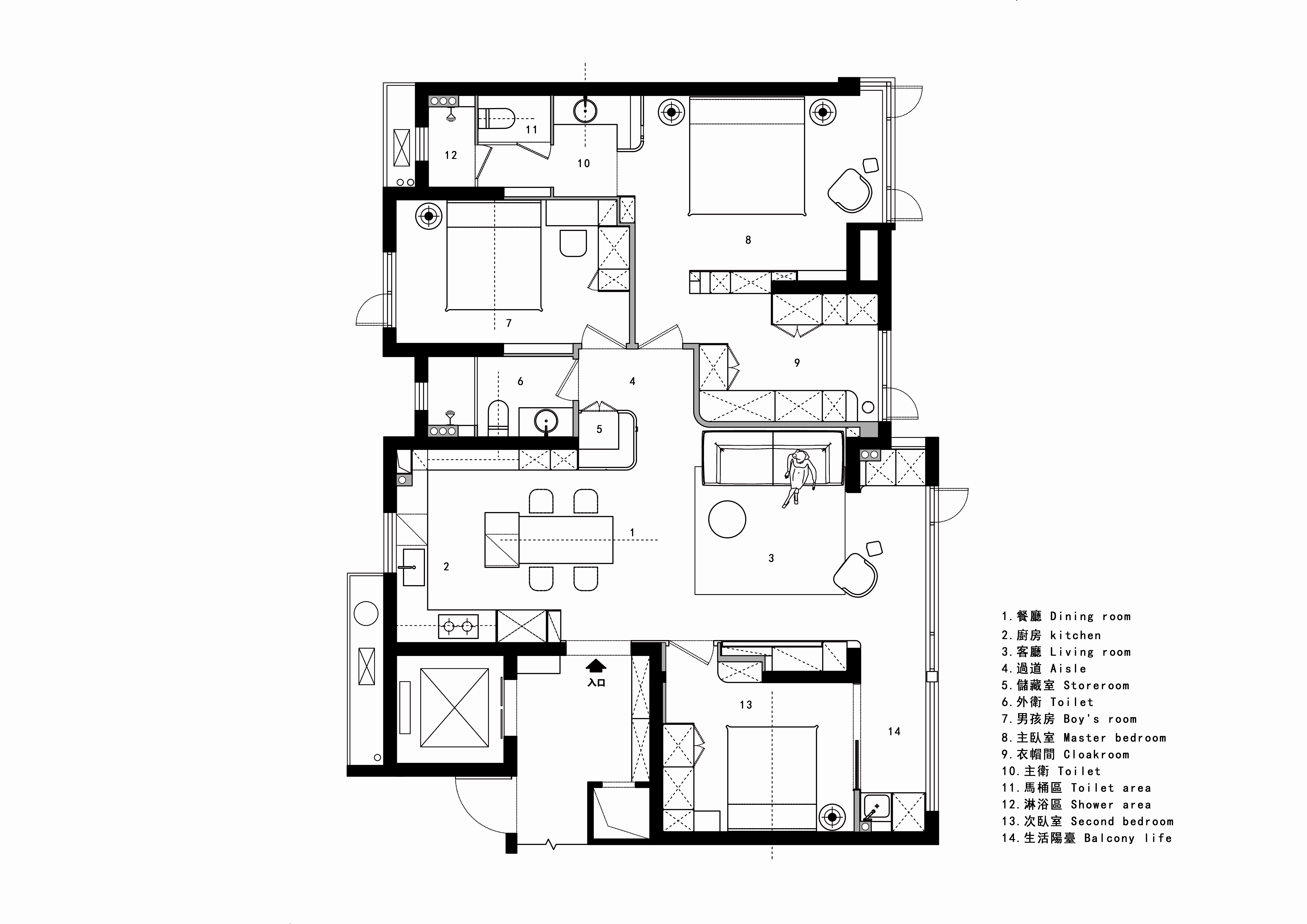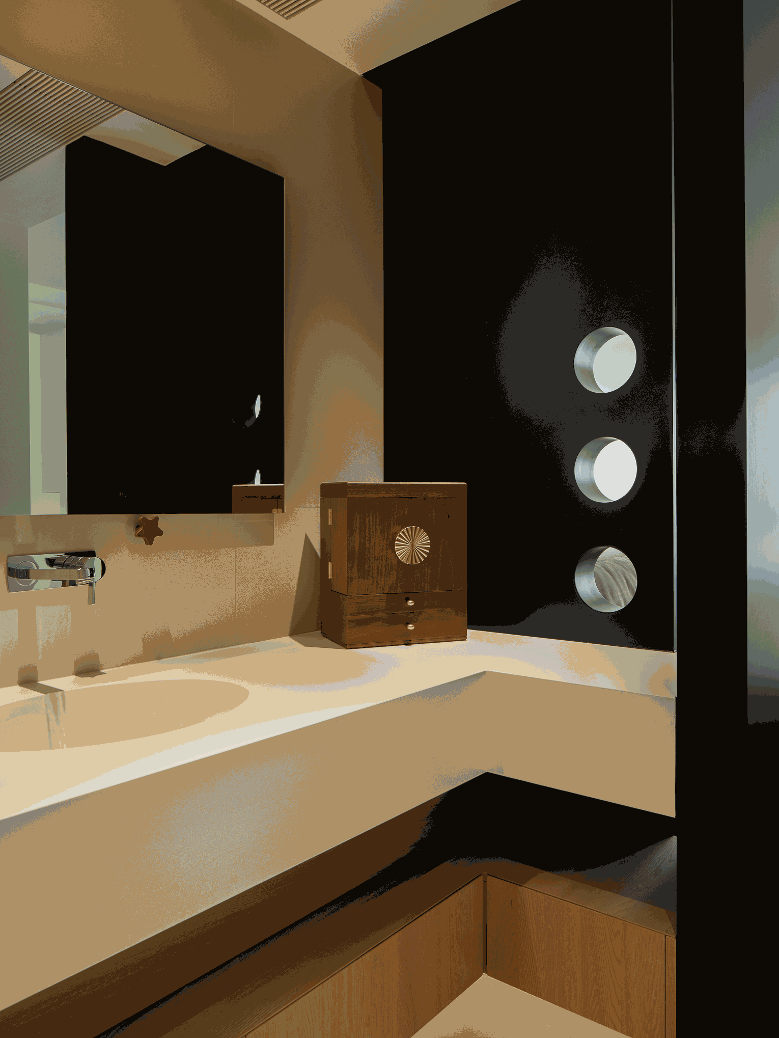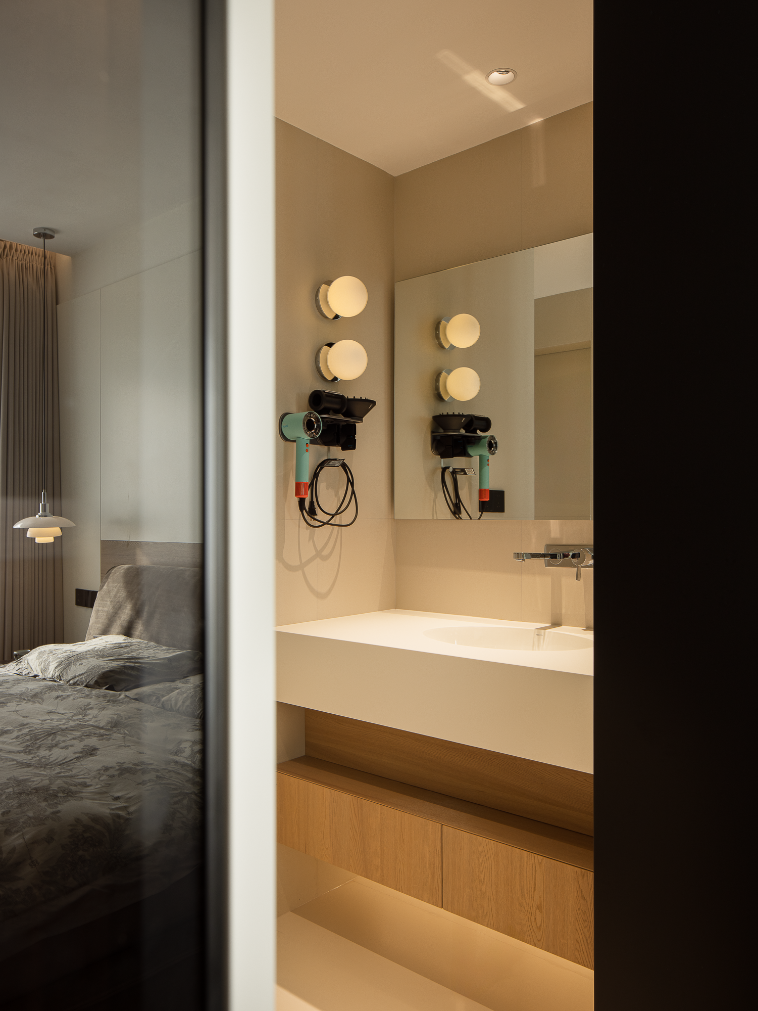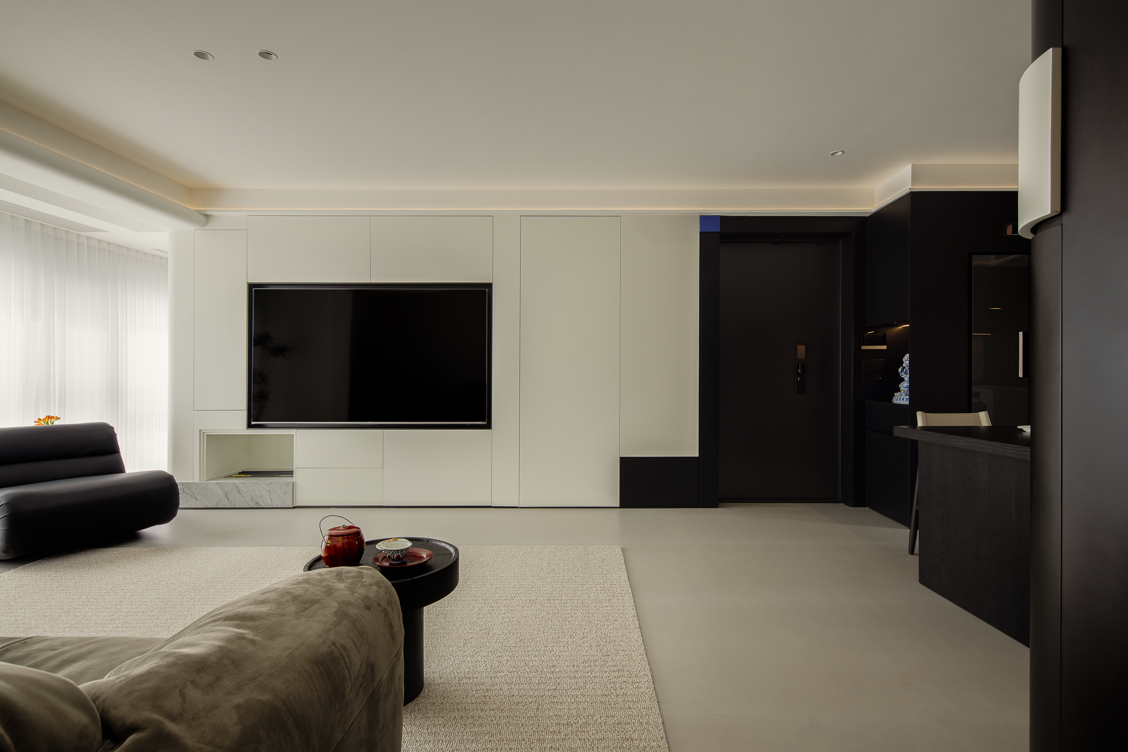 空间意境:公共区采用无主灯设计,搭建流畅的一体化结构,以此修饰层高。设计在生活功能的考量中,布局了高效的收纳体系:电视机柜、餐边柜、转角柜体互相搭配,将不同区域和不同类型的生活用品进行便捷归类,保障公共区干净整洁。业主喜欢将收藏的字画、器皿、插花作为装饰品,安置在家的各个角落,营造专属的气质氛围。在某个闲暇的午后,安静地坐在沙发前阅读、喝茶,独享宁静时刻。原始餐厨分隔独立,设计将这里打通开放,以餐桌为中心点产生洄游流动,与客厅兼容交互。烹饪、用餐、聚会都能在这里串联一体,成为了一家人的主要活动区域。过道的转角处,巧妙设置了一个「黑色盒子」,作为日常生活的辅助收纳,同时牵引场景过渡,功能与美学一举两得。餐厅和厨房互相包裹、内嵌,共生一体,打破了平铺直叙的功能规划。此番布局也强化了收纳体系,柴米油盐与厨余用品都能安置在更合适的区域,通过暗柜、抽屉的组合设计,极致优化空间利用率。业主只需转身就能快速拿取想要的物品,一举一动间保障了操作的便捷性。厨房调度过道的比例关系,在岛台嵌入烤箱,搭配餐边柜的吧台使用,延伸了中西厨的功能应用。家人们一起制作料理,深入日常与三餐四季,细细品味这场可持续的生活品质。屋主对于主卧的居住体验和收纳的要求比较高,独立衣帽间、宽阔的卫生间、舒适的阳光氛围,都必不可少。朝南的两个卧室合并为主卧套房,于是拥有了一个非常宽阔的衣帽间。卫生间摒弃了门的隔离,打通后形成更柔和的区域过渡。原始的飘窗占据了较多的面积且缺少实用性,直接拆除后让渡了一部分空间,可以放一把单人椅,在这里沐光落座,独享慢节奏生活。