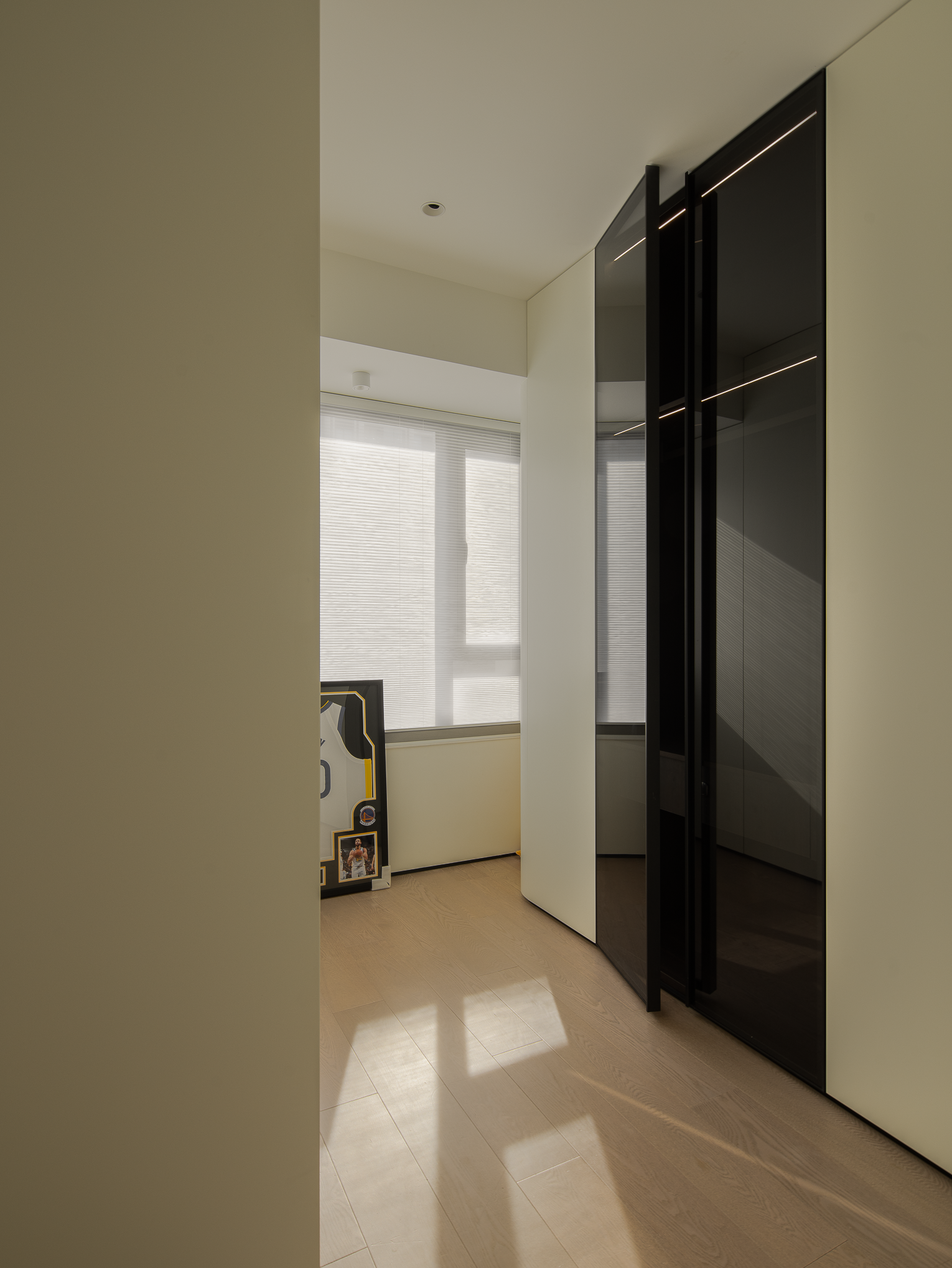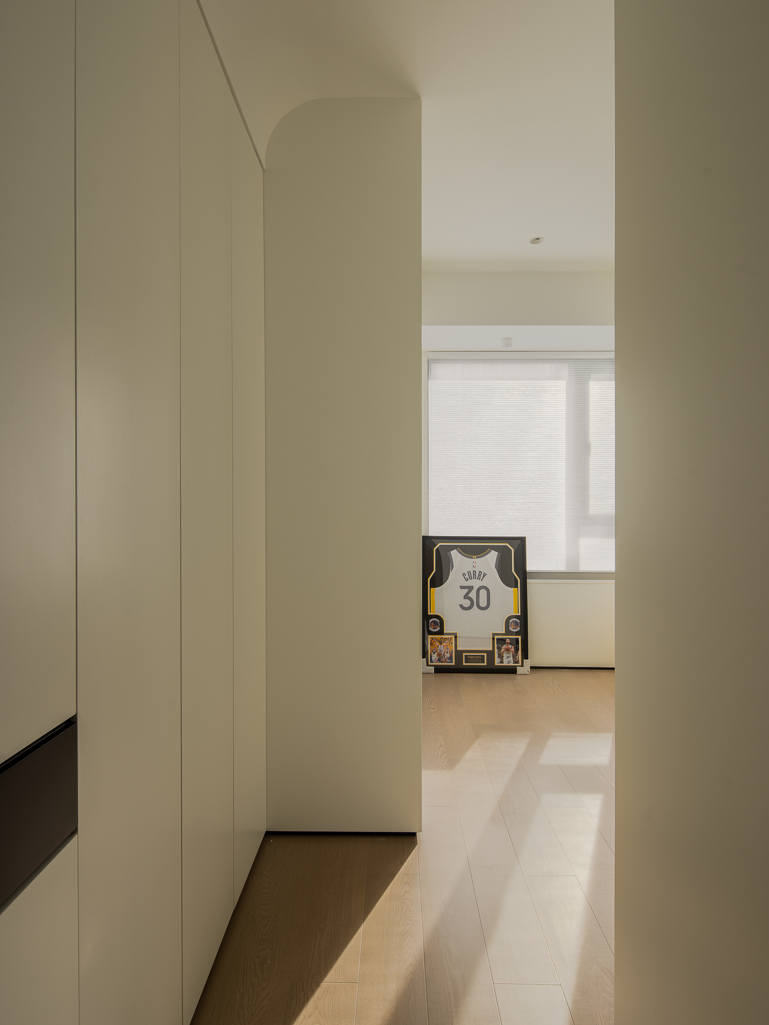 全屋重新规整收纳布局,将不同区域、不同类别的生活物品进行秩序规划;在走廊转角处增设收纳柜,强化整屋的收纳体系。 -