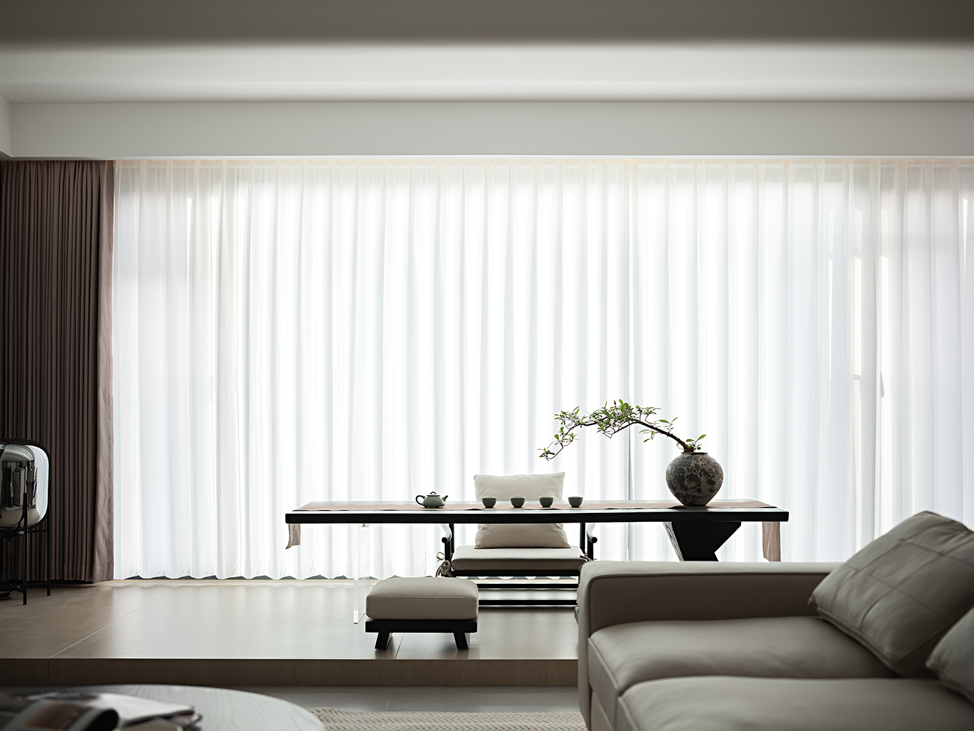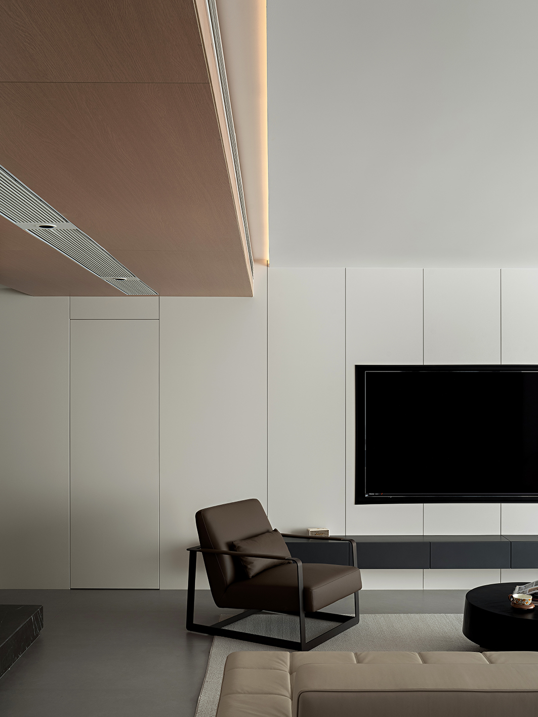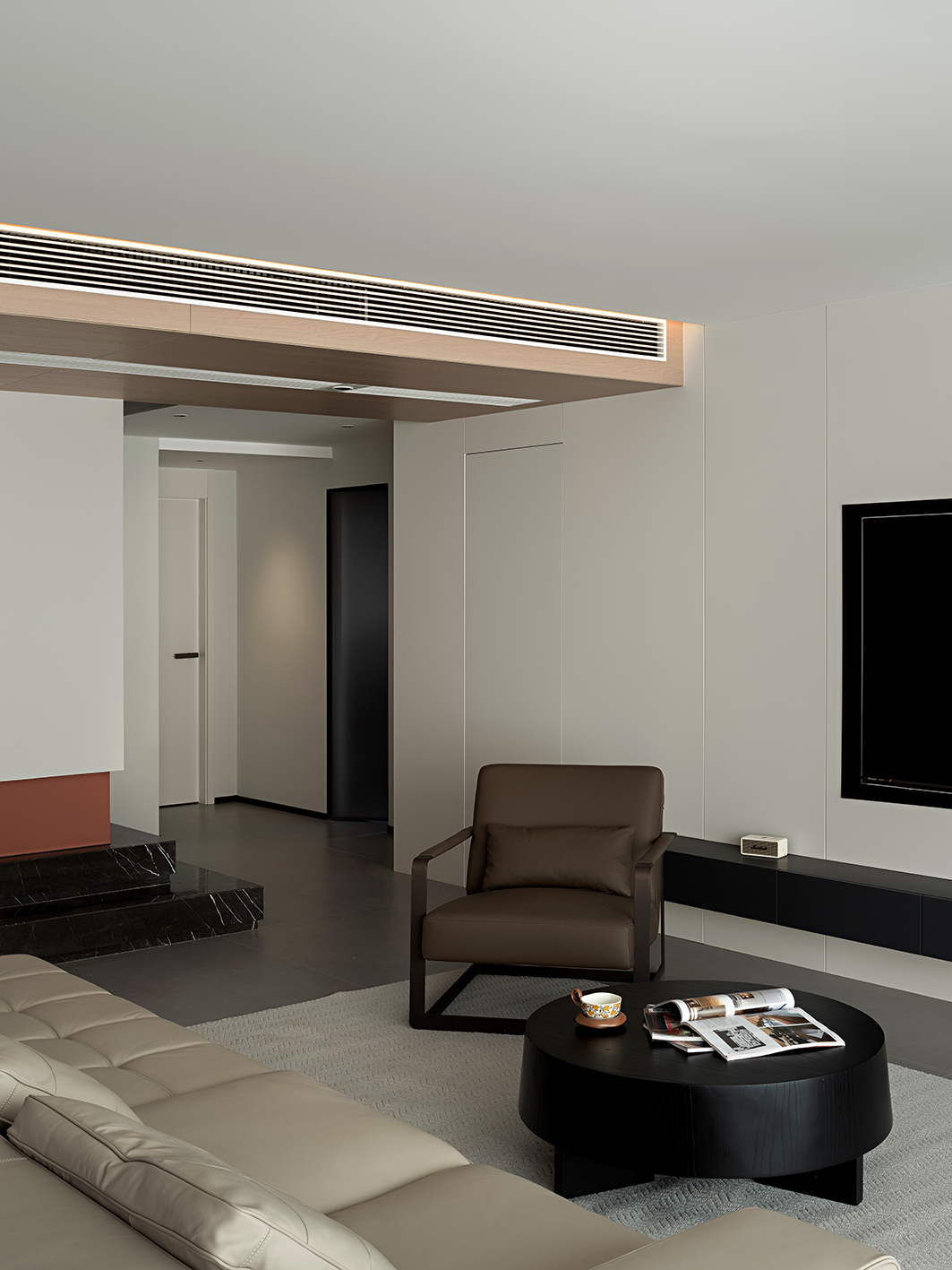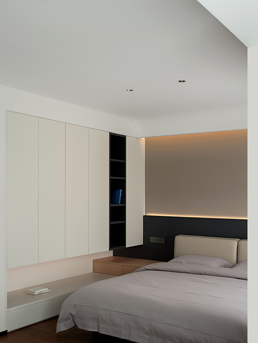 设计选材:材质选择上,以米白哑光板材、浅棕木饰面为基底,搭配深黑石材与皮革软包,冷暖材质的调和消解了极简设计的疏离感;茶室区域的禅意造景、卧室的柔和氛围灯,又在细节处注入生活的温度与情感的归属感。从公共空间的利落叙事,到私密区域的温情表达,设计始终在“减”的克制与“满”的情感之间寻找平衡,最终让居所成为身心栖居的理想之地。