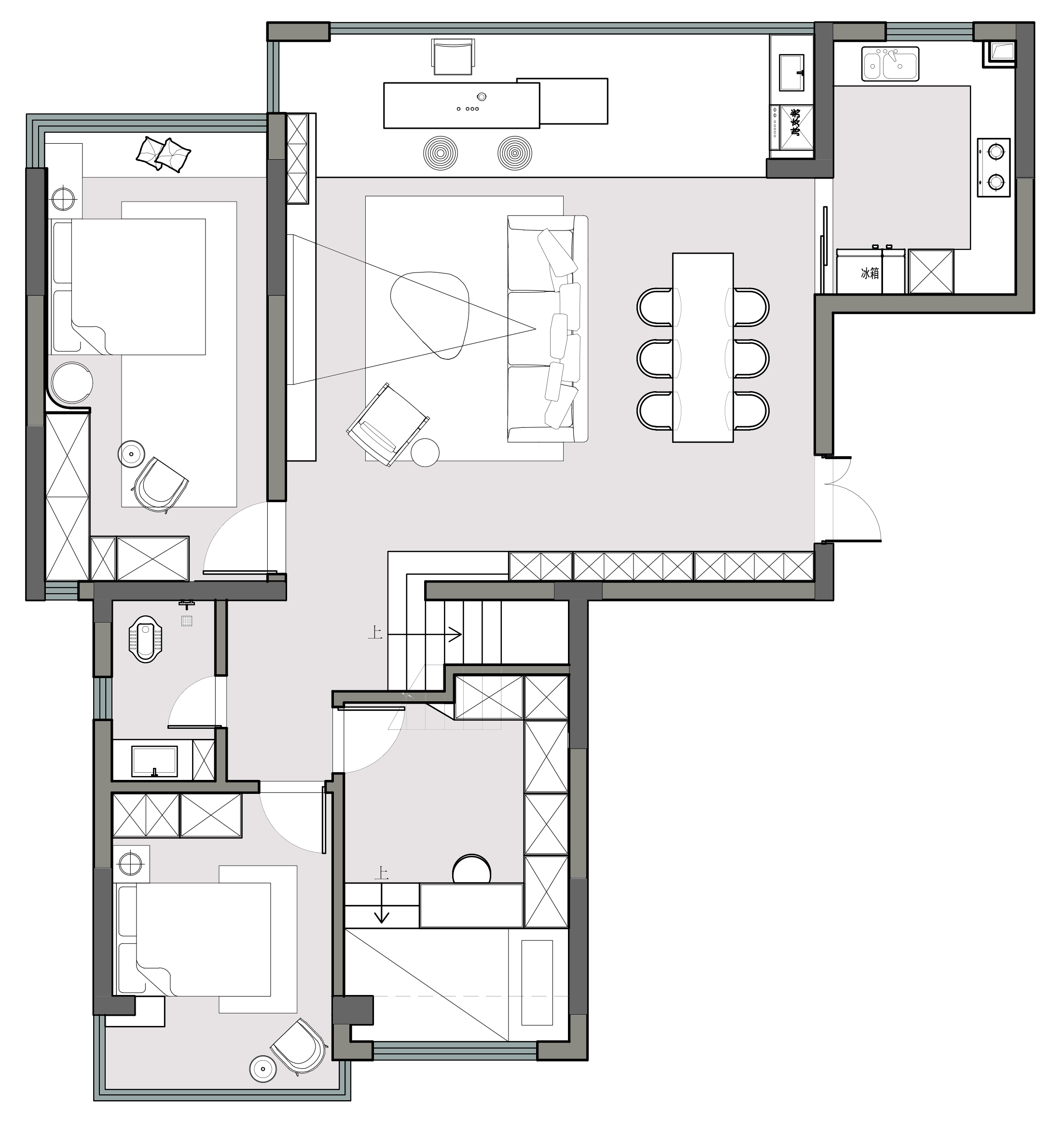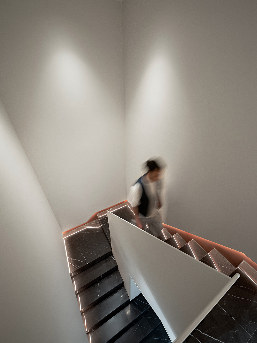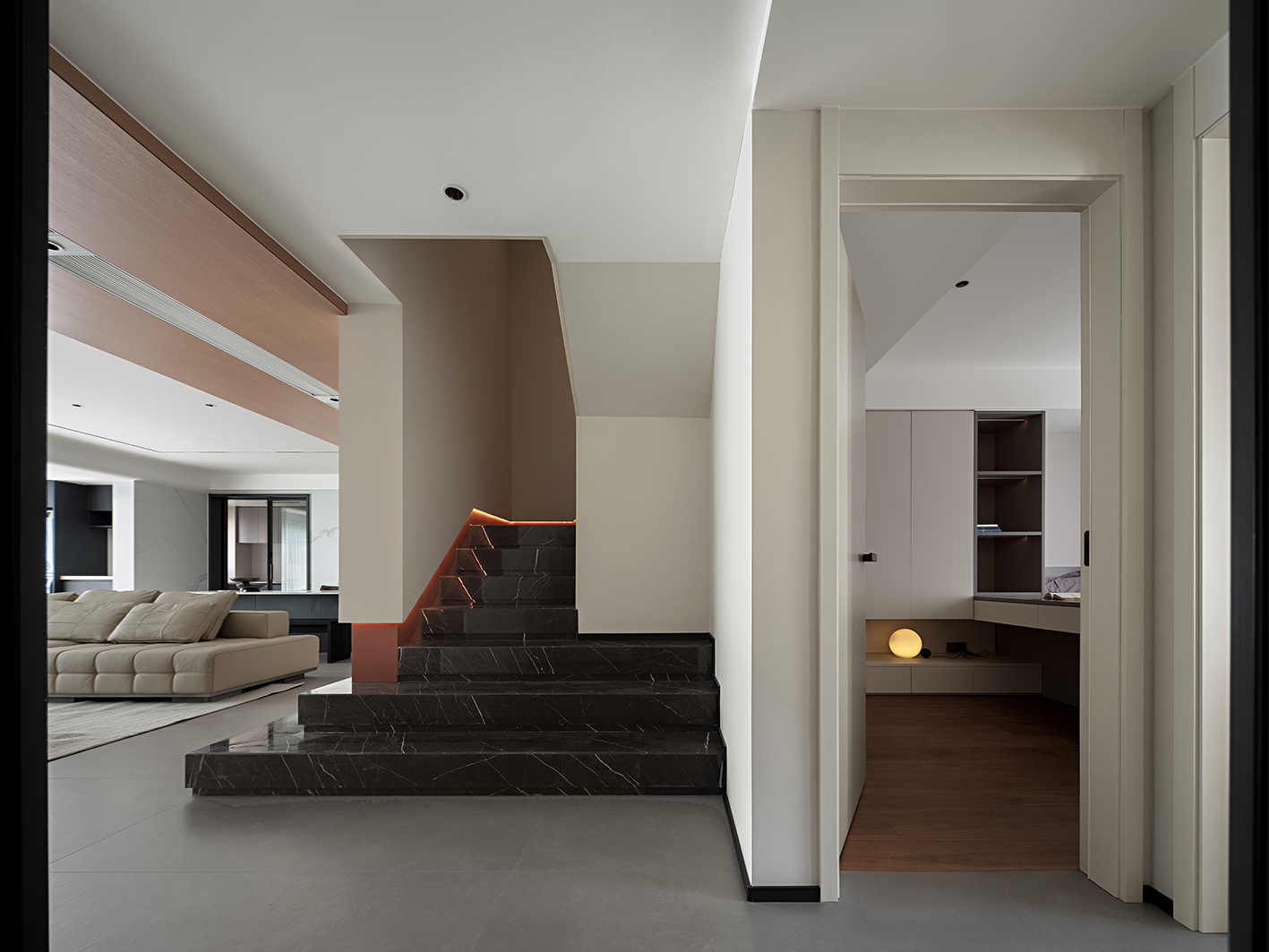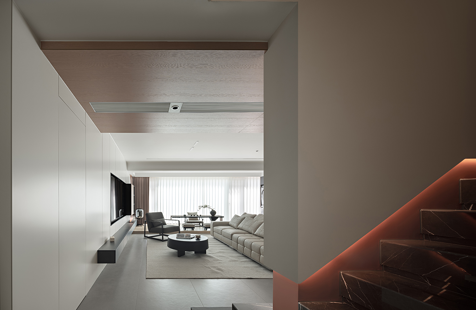 空间布局:在空间形制上,摒弃繁复装饰,以直线条与块面感构建整体秩序,无主灯设计结合线性灯带、点式筒灯形成层次化光影,大理石楼梯的冷峻质感与木饰面的温润纹理形成碰撞与平衡,勾勒出都市居所的干练气质。客厅、楼梯间等公共区域的开放式布局,既保证了空间的通透感,又通过软装的尺度与布局划分出功能边界,实现“减形而不減用”。