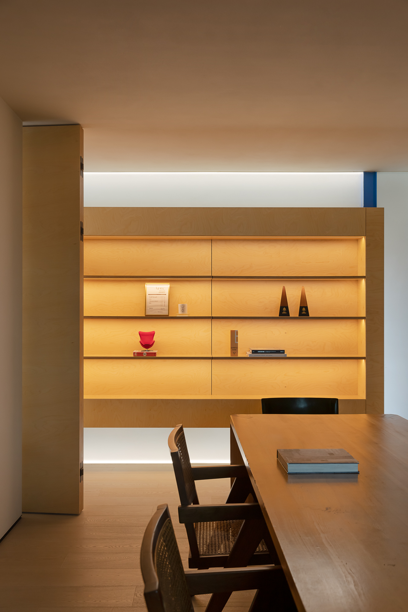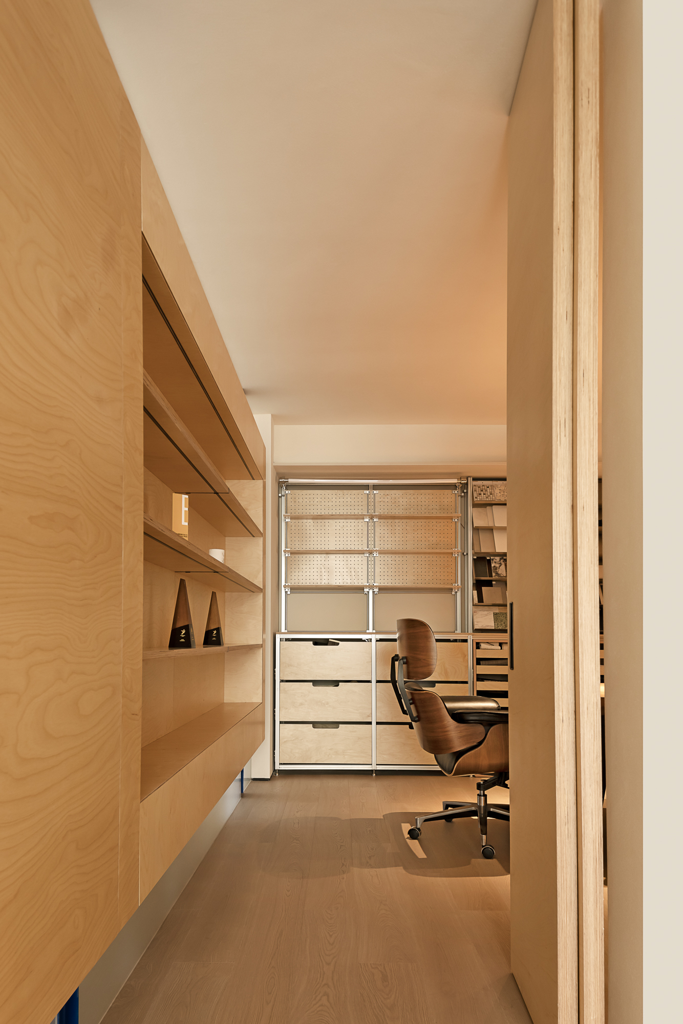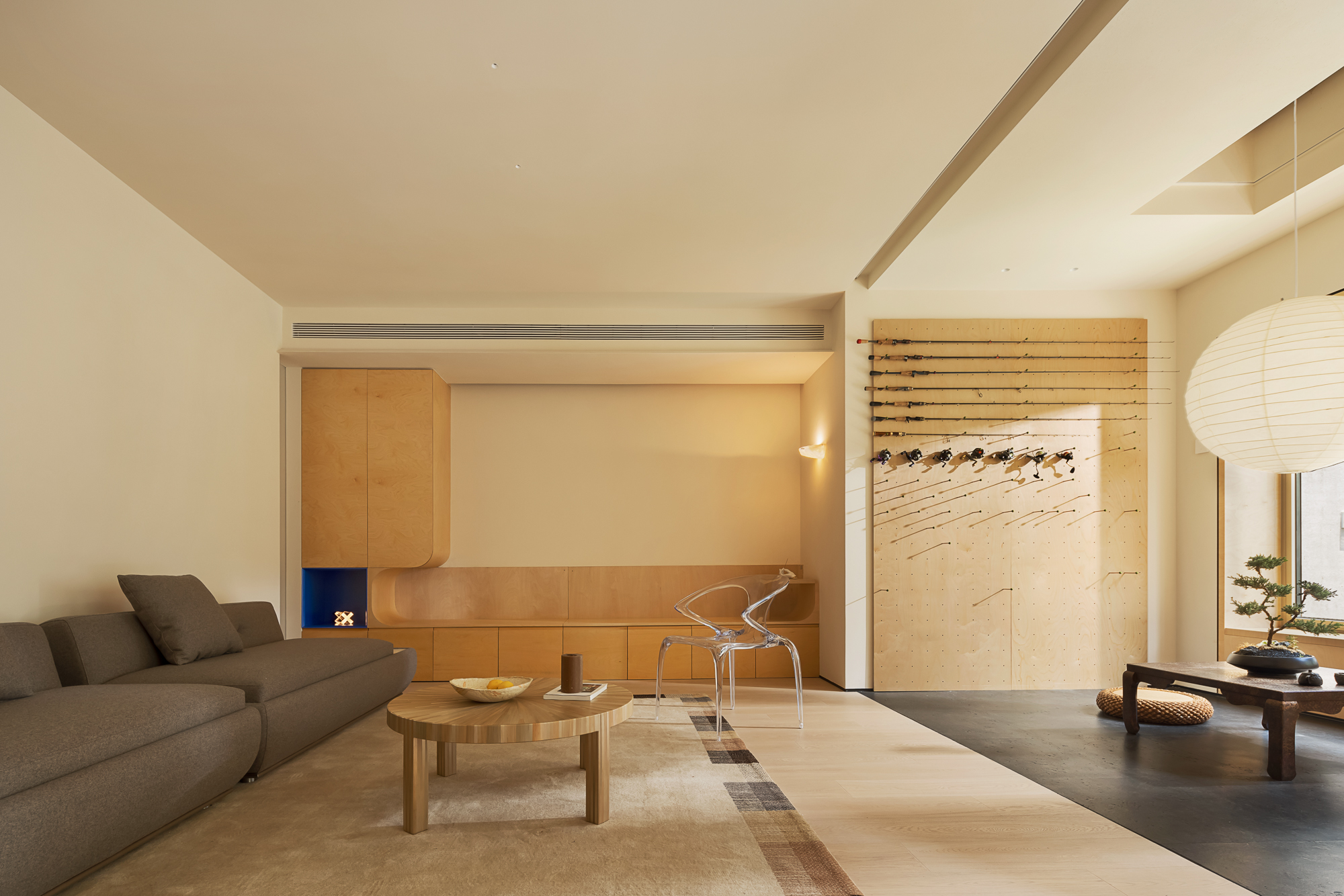 设计选材:工作室一共规划了三个主要区域:接待休闲区,会议展示区以及工区。每一个空间都兼顾了多种功能。整体以米色和黄色的格调,选用海洋板、软木地板等原始材料,既体现了环保健康,又让人直接感触到自然材质的本身,彰显温和质朴空间气质与极简的设计主义。接待区融入了一个禅意茶室,通过大落地窗和户外庭院创造了一个无缝的过渡。人们席地而坐,在品茗的时候顺手可以喂鱼,欣赏美景。窗台不仅可以用来放置一些物品,里面收纳了鱼池的过滤装置,软木地板的防潮防腐,在这里体现了设计的精妙。办公区紧凑而高效,设计师将最好的南向空间给予了员工,希望他们始终有一个通透而敞亮的舒适环境。案台的灯光进行了重新设计,有多种角度可以自由调节,设计工作加班是常态,这就满足了办公对灯光的日常所需。毗邻庭院的墙体,刻意开出一个水平长窗,当工作疲劳的时候,望出去便是绿色的生机。这个巧妙的设计,既确保了办公的隐私,同时保持了与户外的流动关系。