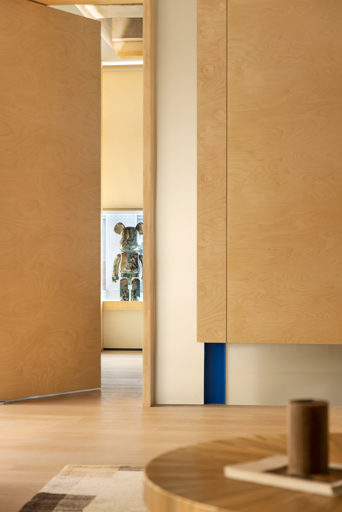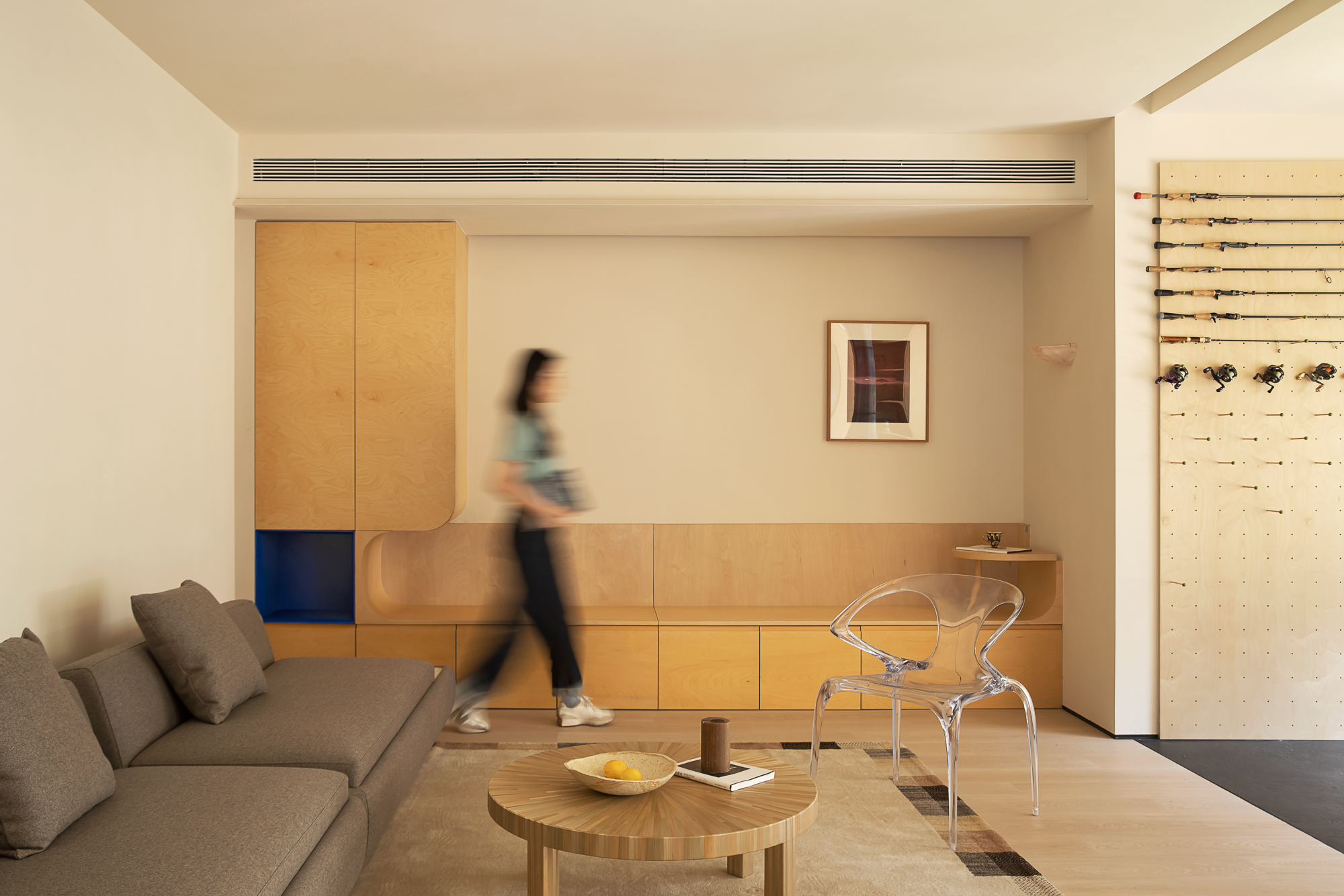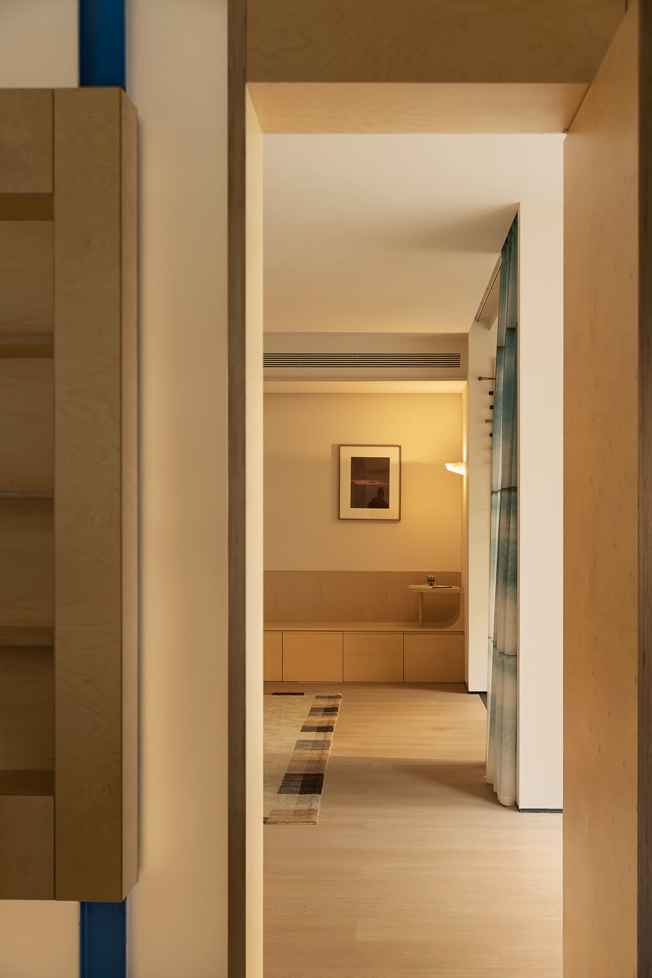 设计选材:工作室一共规划了三个主要区域:接待休闲区,会议展示区以及工区。每一个空间都兼顾了多种功能。整体以米色和黄色的格调,选用海洋板、软木地板等原始材料,既体现了环保健康,又让人直接感触到自然材质的本身,彰显温和质朴空间气质与极简的设计主义。接待区融入了一个禅意茶室,通过大落地窗和户外庭院创造了一个无缝的过渡。人们席地而坐,在品茗的时候顺手可以喂鱼,欣赏美景。窗台不仅可以用来放置一些物品,里面收纳了鱼池的过滤装置,软木地板的防潮防腐,在这里体现了设计的精妙。办公区紧凑而高效,设计师将最好的南向空间给予了员工,希望他们始终有一个通透而敞亮的舒适环境。案台的灯光进行了重新设计,有多种角度可以自由调节,设计工作加班是常态,这就满足了办公对灯光的日常所需。毗邻庭院的墙体,刻意开出一个水平长窗,当工作疲劳的时候,望出去便是绿色的生机。这个巧妙的设计,既确保了办公的隐私,同时保持了与户外的流动关系。
