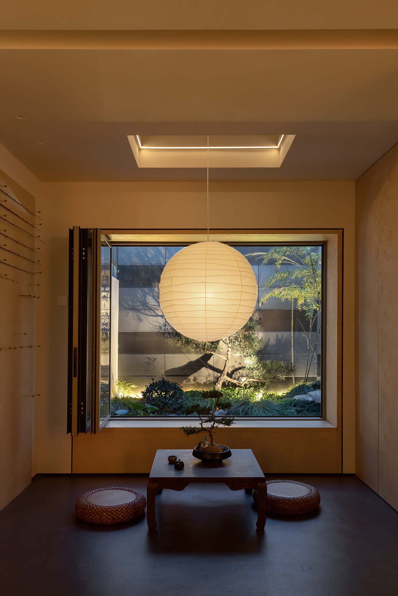 空间意境:工作室坐落于一栋商务楼里,场域的精妙之处在于刚好处于建筑两堵外墙之间,便自然形成了一个【凹】形的区域。这片区域是露天的,被改造为秀美的庭院,赋予了整个工作室阳光、流水、绿植和生命。