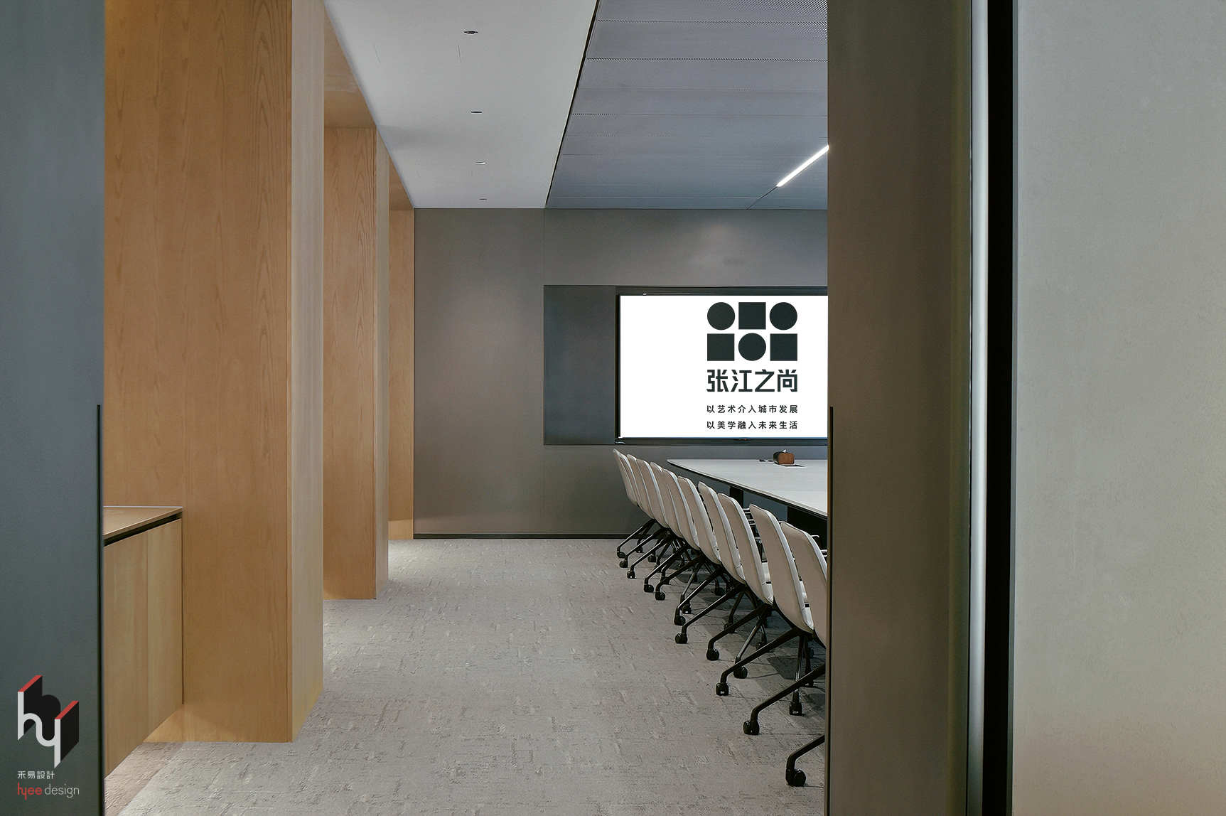多功能会议室,以暖木与浅灰色调平衡,营造温馨而沉稳的氛围。利用长走廊引导视线至内部大屏,形成视觉轴线,增强纵深感与整体连贯性。