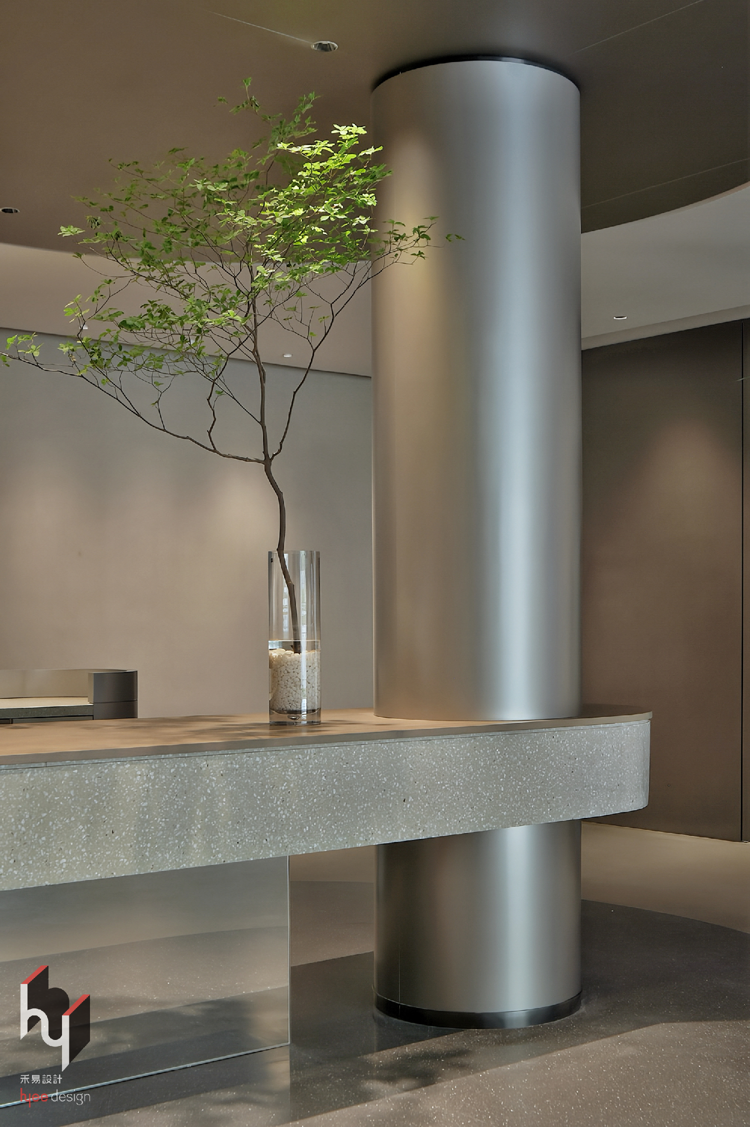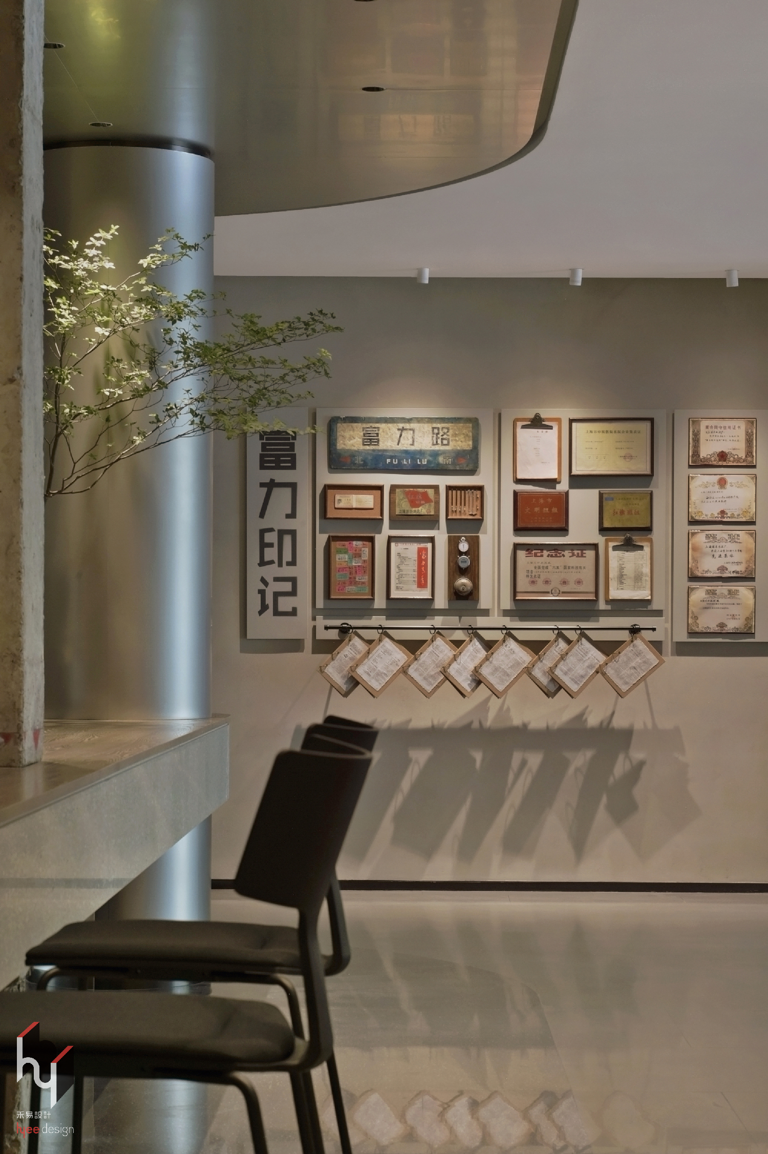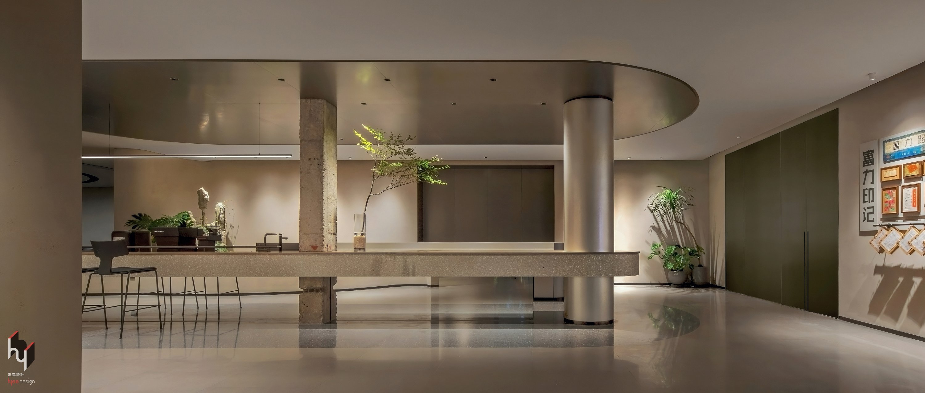 空间意境:设计采用“工业遗存+极简现代”融合的风格语言。空间以银灰为主色调,搭配简约线条与几何形态,营造科技感与纯粹感。同时保留水泥柱、斑驳墙面、老物件等历史印记,通过光影设计与绿植点缀,为冷峻的工业基调注入温度与生机,形成“冷静与温暖、历史与未来”的对话场景。