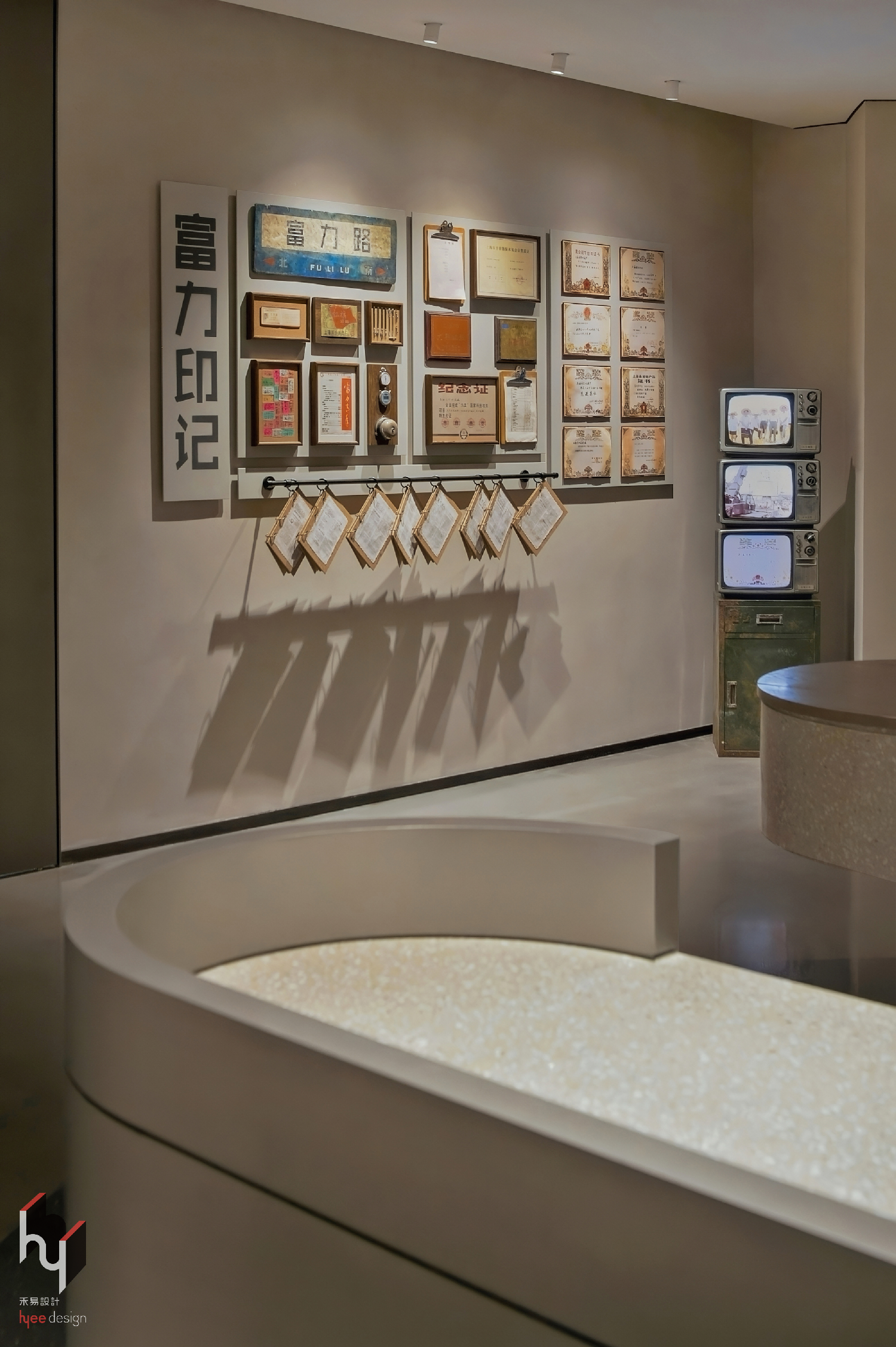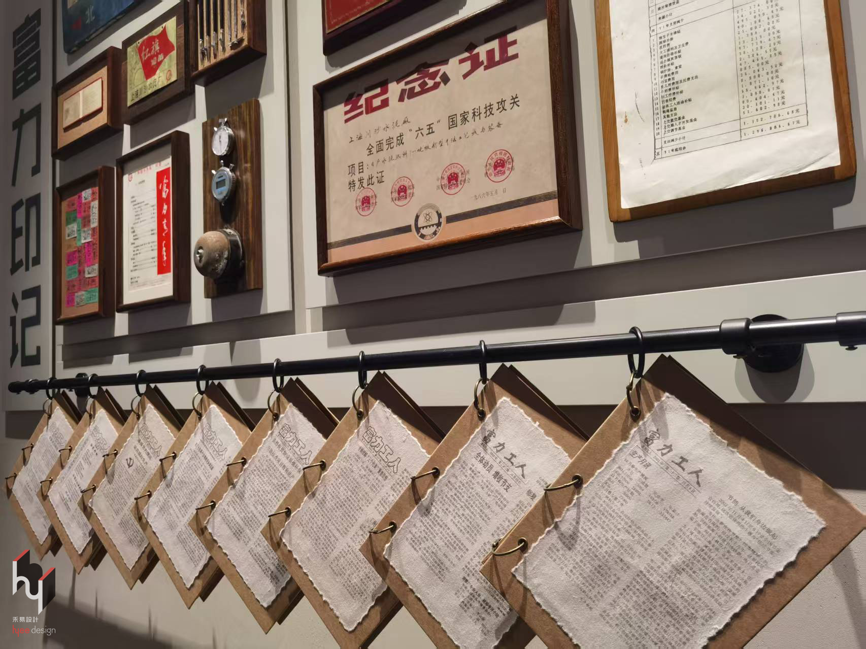 展示接待区展示细节,工厂里回荡的铃铛声,敲击出整个时代的节奏;比赛时分传递的计时器,记录了多少专注与欢笑;工人们亲手绘制的宣传报,印刻着朴素却炽热的热情等等