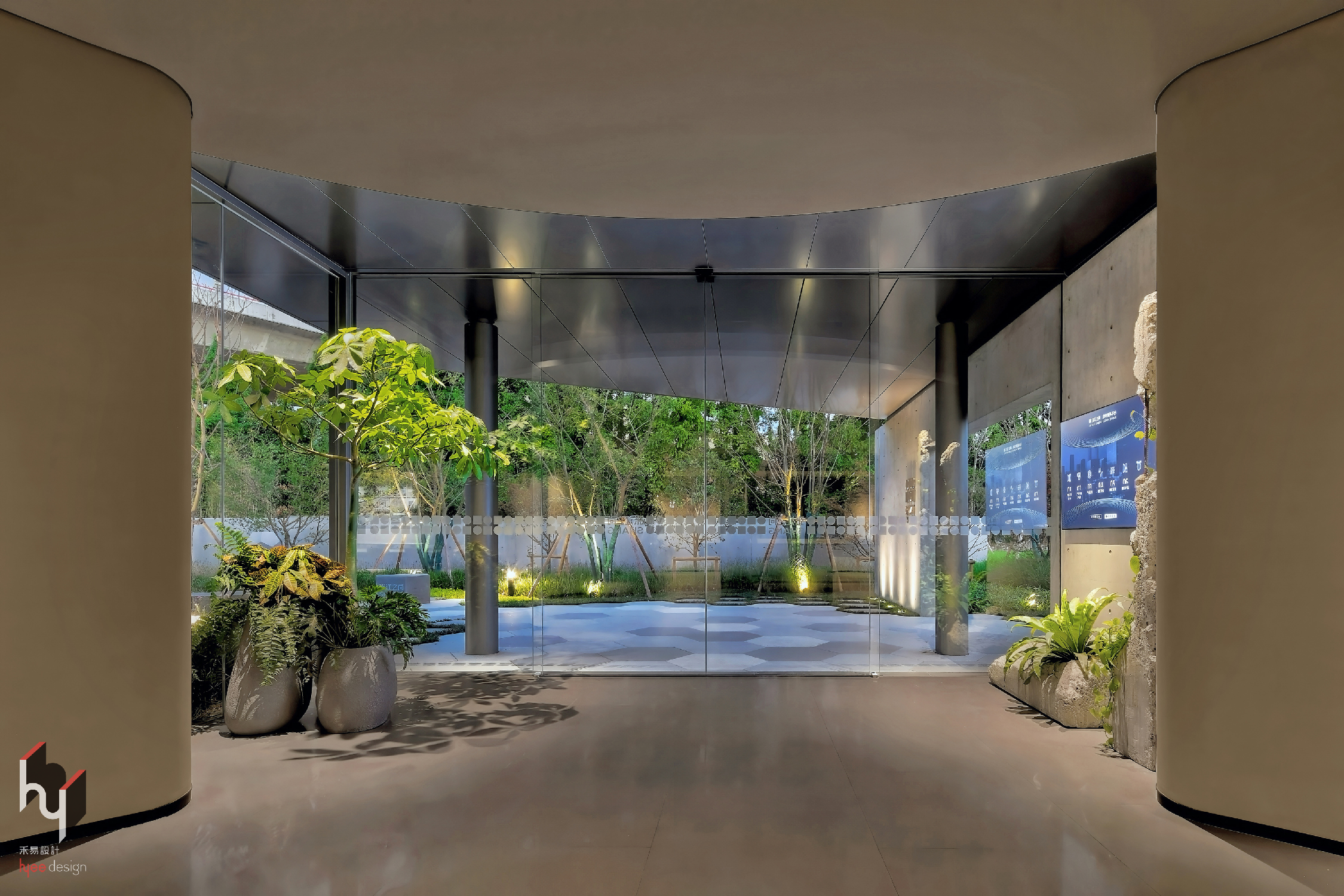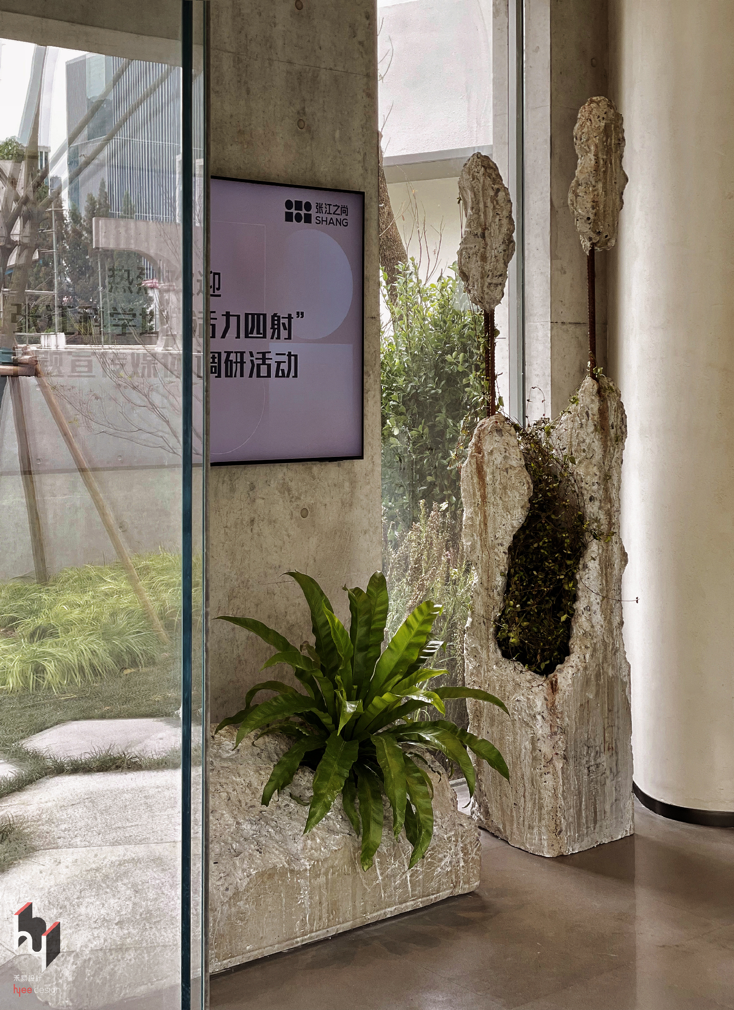 入口序厅,粗犷材质搭配绿植,营造自然氛围。