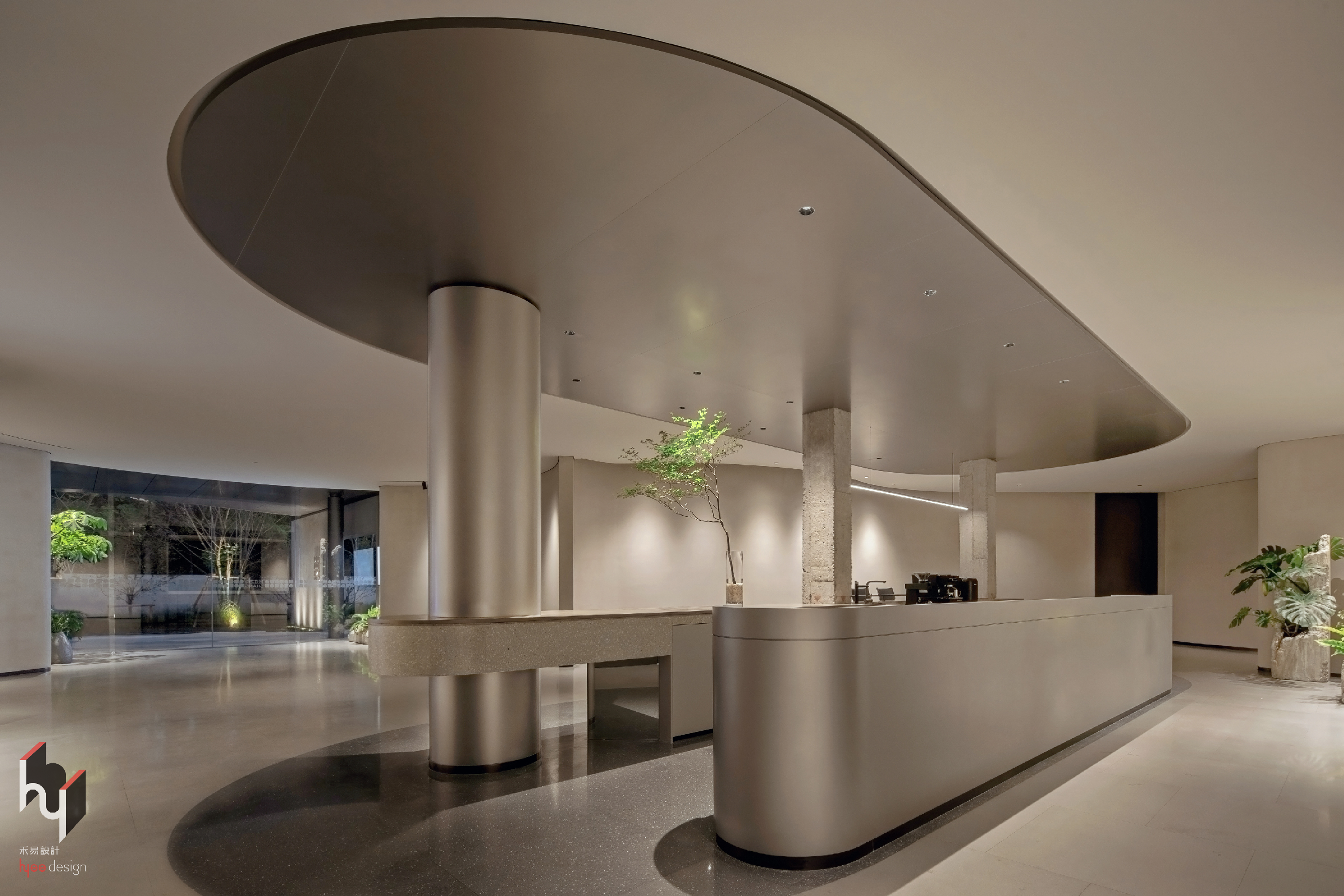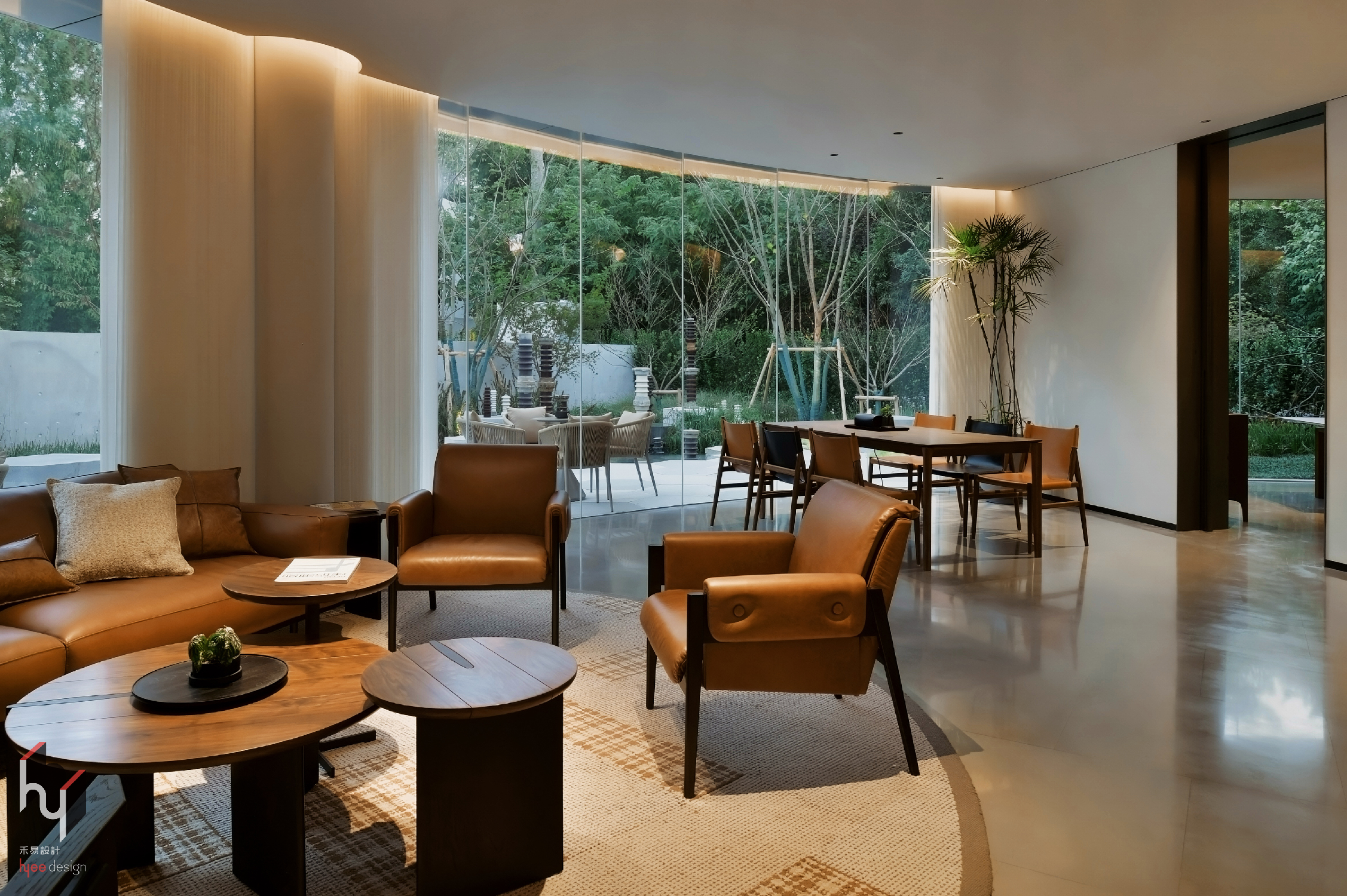 VIP接待区,当访客完成对历史与未来的观览,步入休息洽谈区,便意味着回归当下。空间采用大面积弧形玻璃窗,消融室内外界限,引入自然景观成为室内一景,营造开阔通透的视觉体验。
