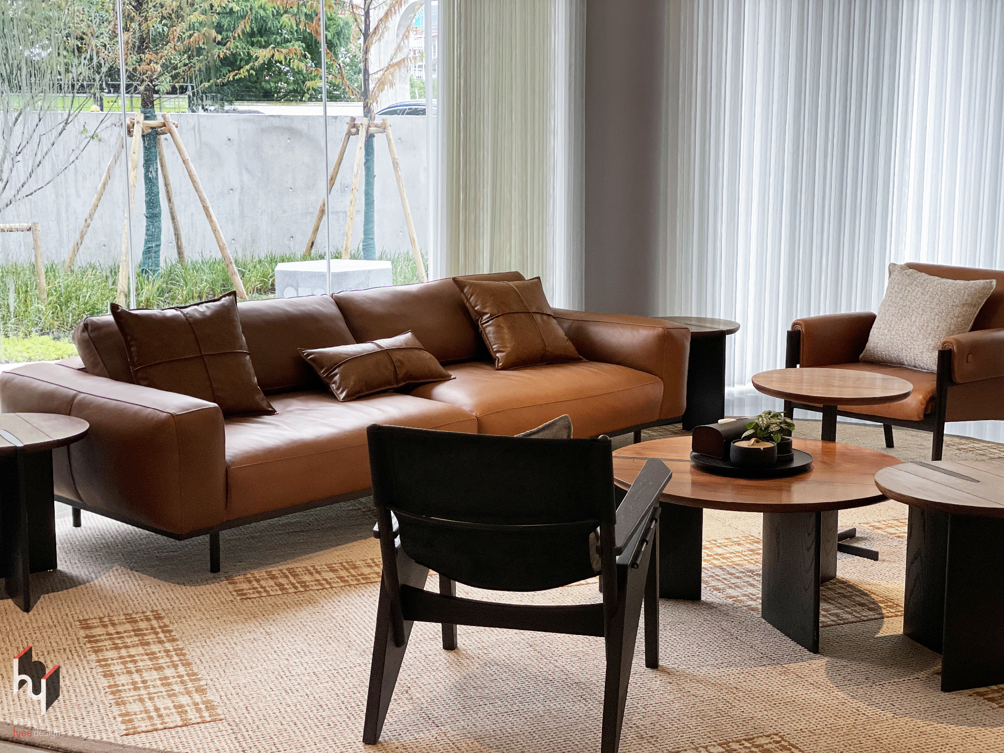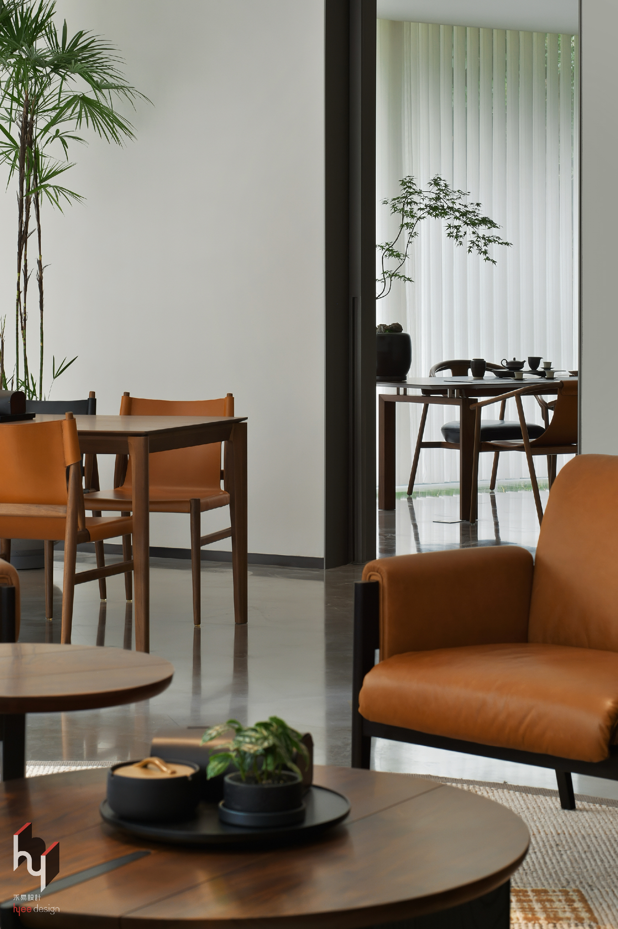茶室,突破传统茶室较为封闭的布局,以大面积通透的垂直纱帘取代实体墙,模糊室内外界限,将自然景观以柔和方式引入,创造独特视觉体验。