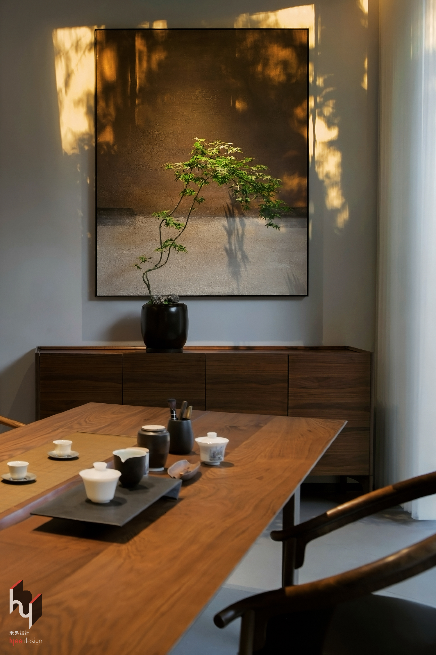 茶室,利用纱帘的透光性,使自然光线经过滤后以均匀、柔和的光影效果洒入室内,营造出动态且富有诗意的光影氛围,随时间变化呈现不同美感。