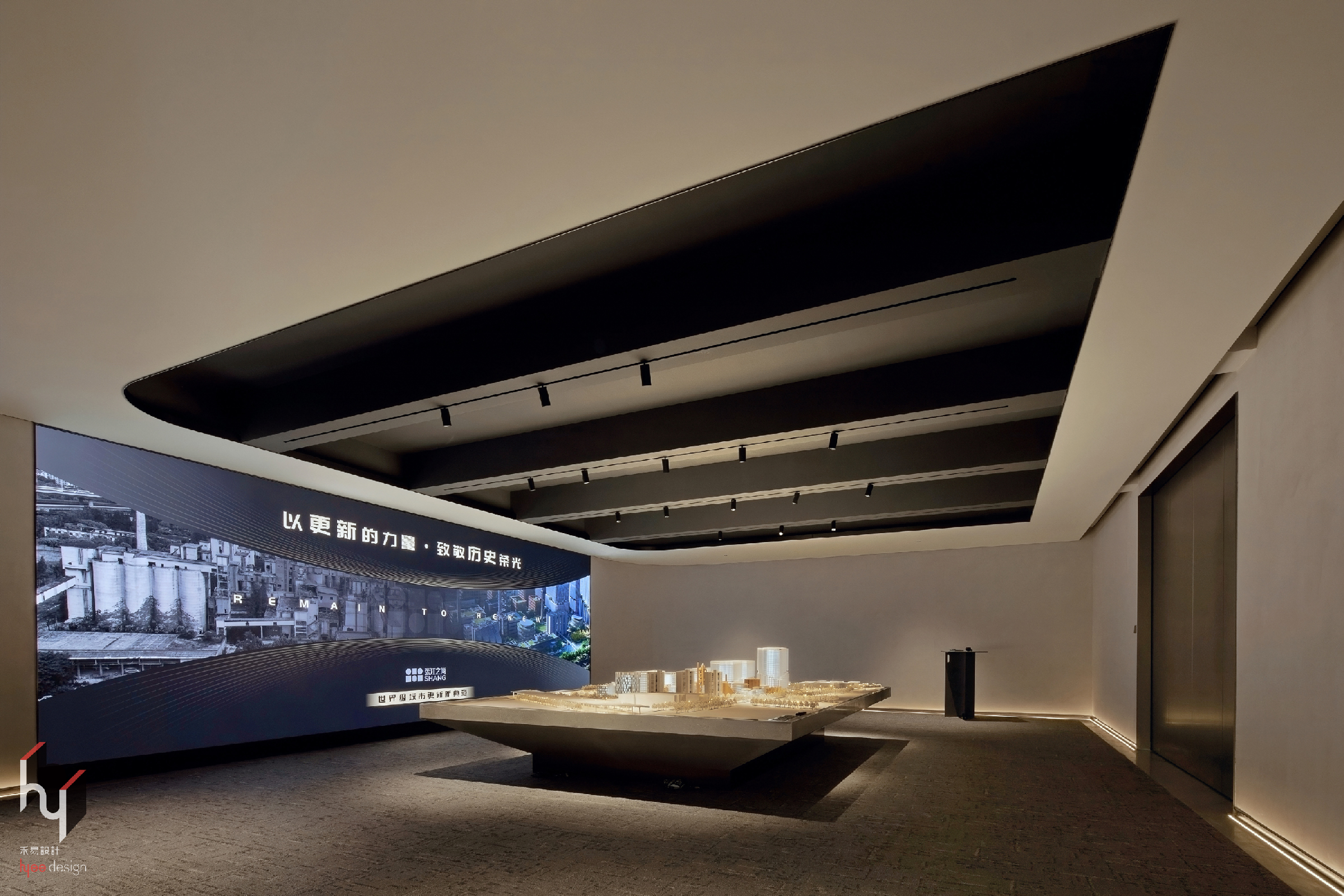 沙盘区(模型展示室),采用曲面天花板打破传统格局,营造流动的未来感;墙面影像与实体模型虚实结合,增强了展示的沉浸感与信息传达效果。