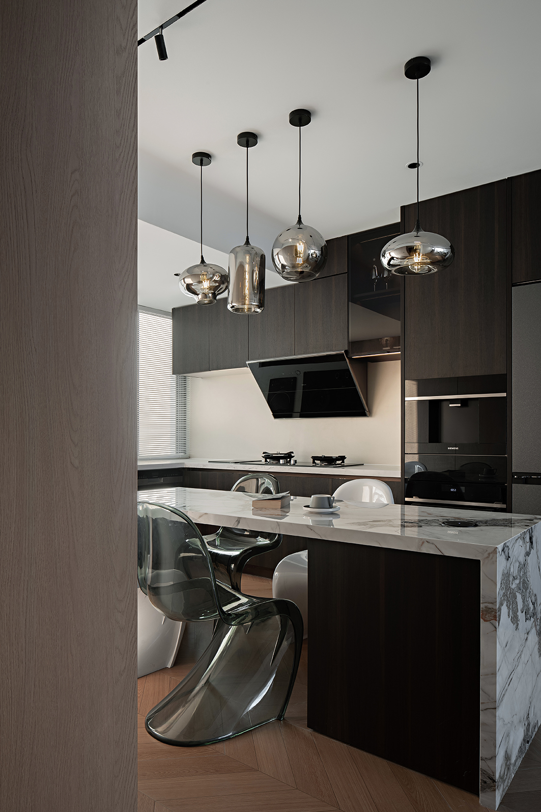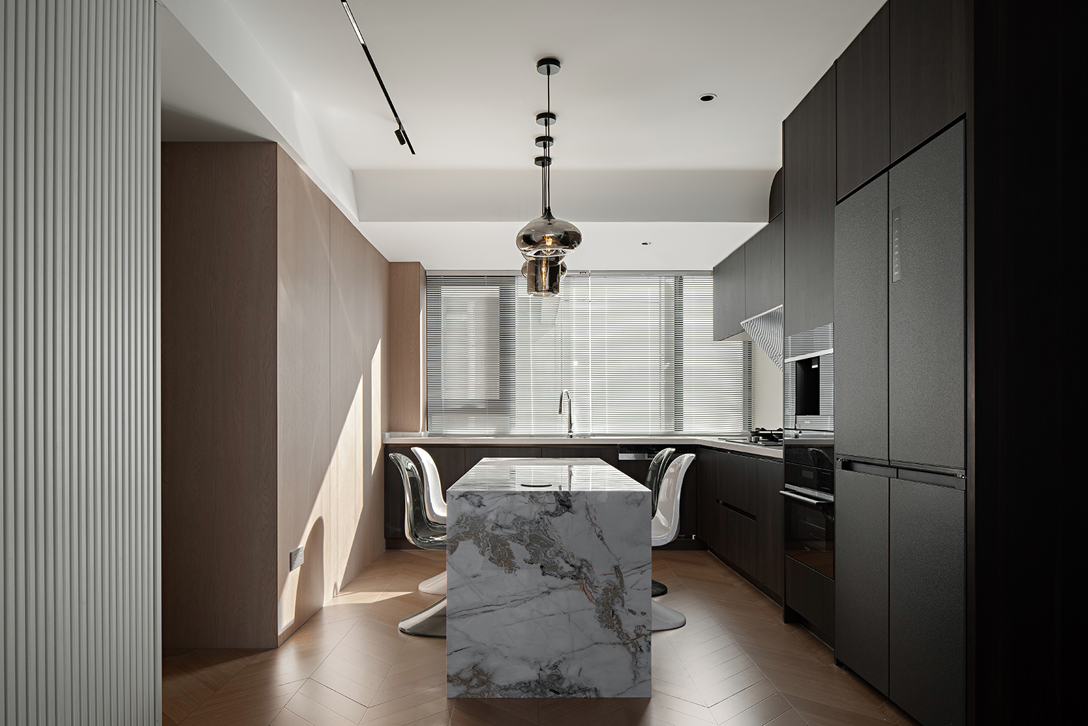 原木地板纵向铺陈延伸视觉,定制胡桃木柜体以几何切割打破单调。藤编单椅、橡木餐桌的天然肌理,在射灯下晕染出时光的温度,中和冷调的高级感。