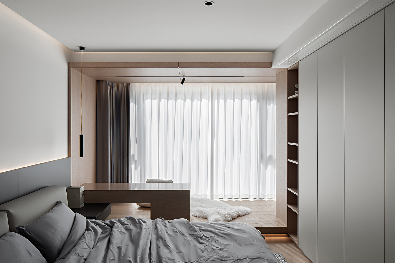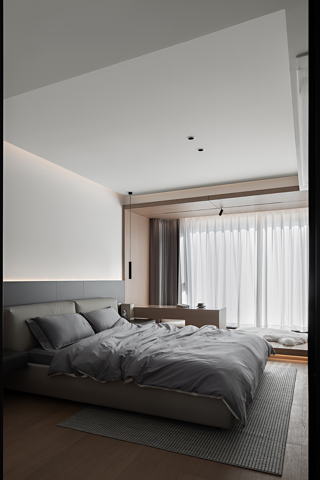 空间意境:以 纯净白为基底,温润木色为脉络,深邃灰为点睛,打造现代极简与自然共生的诗意栖居。克制用色中暗藏层次,理性线条中包裹温度,赋予空间呼吸感与永恒感。