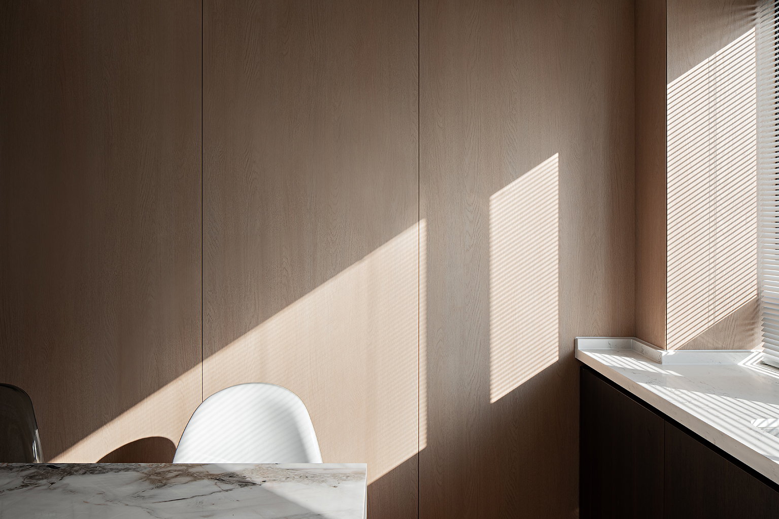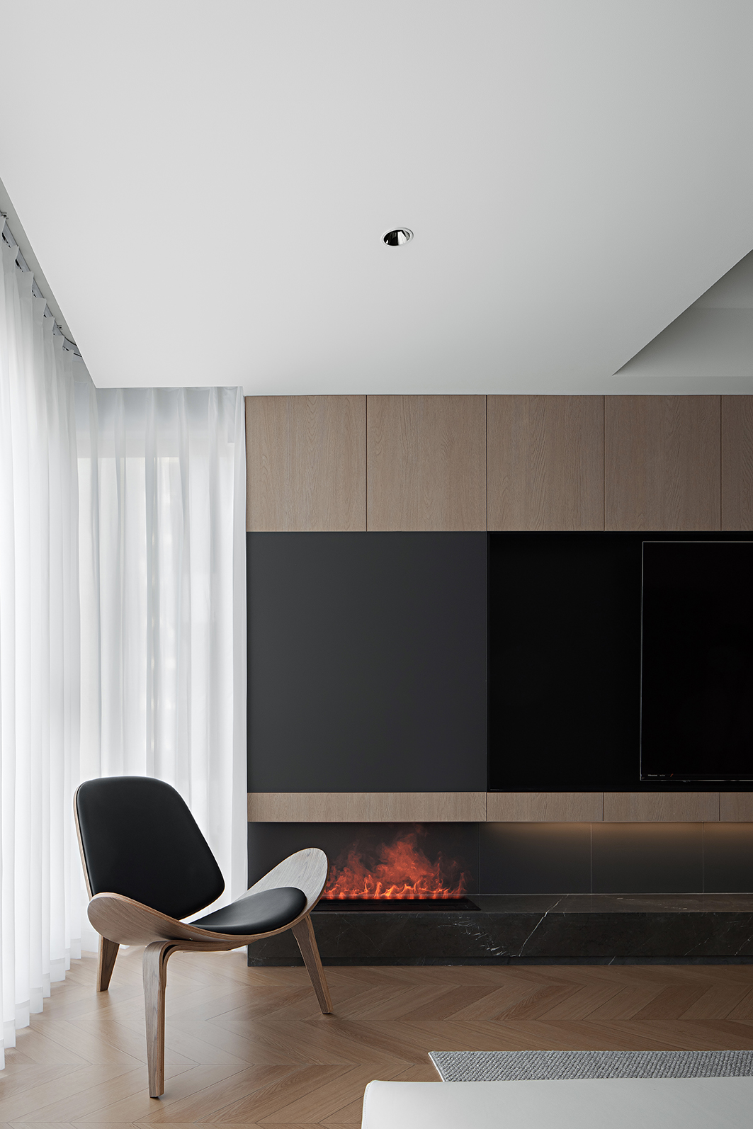 墙面与天花大面积留白,如宣纸般承载光影流动。哑光白漆与微水泥材质弱化边界,营造轻盈通透的基底,让自然光成为空间的第四种色彩。