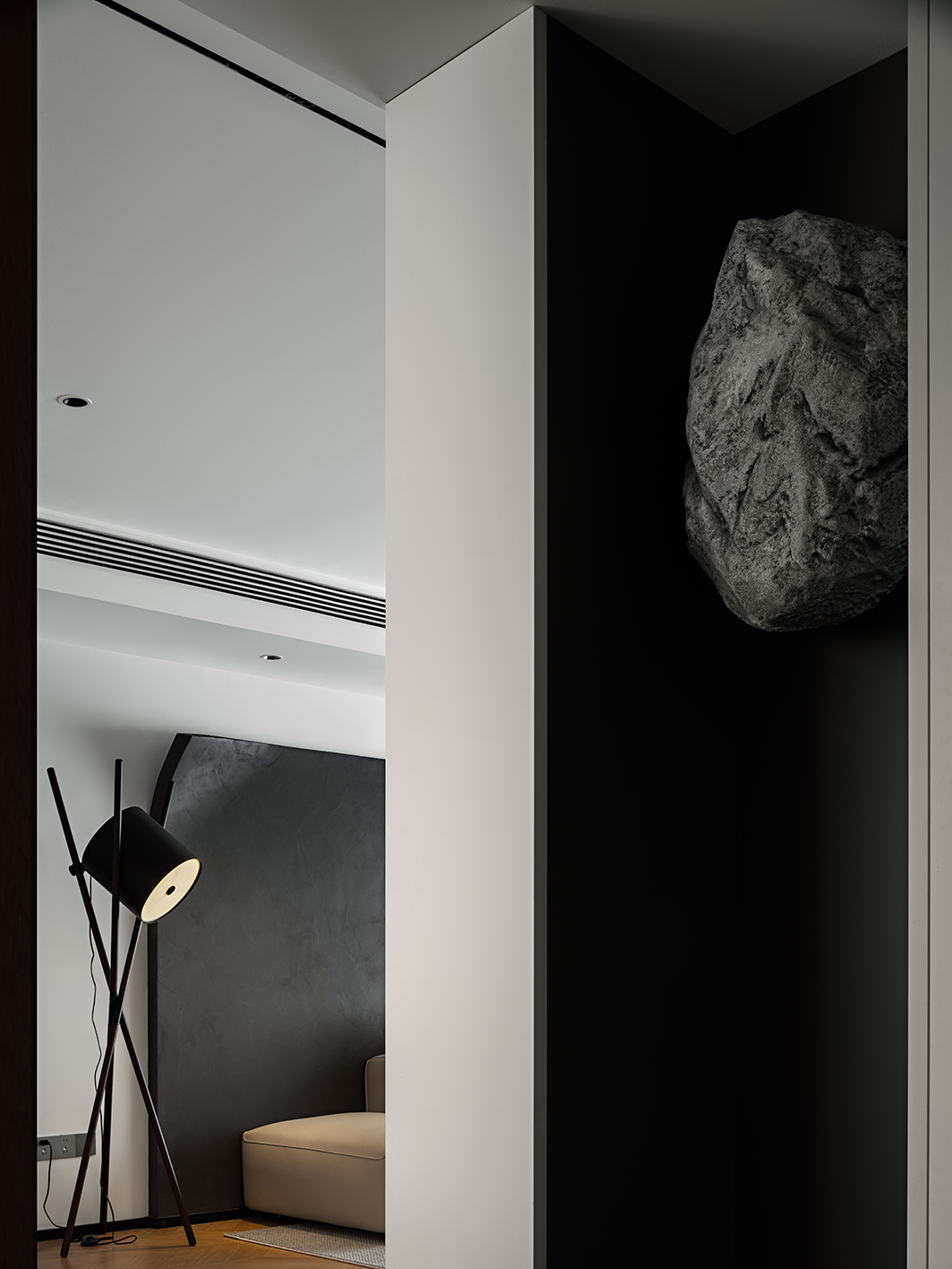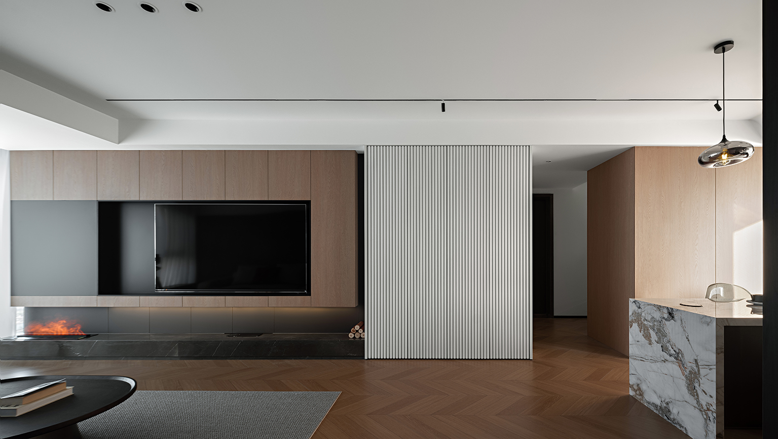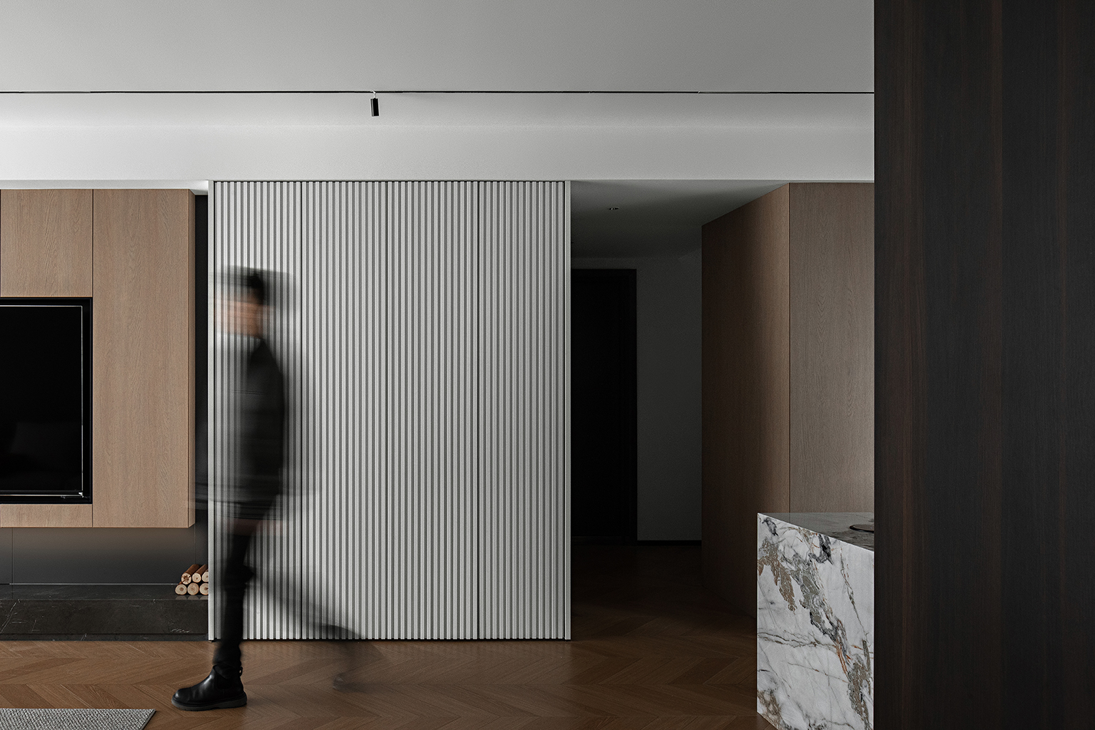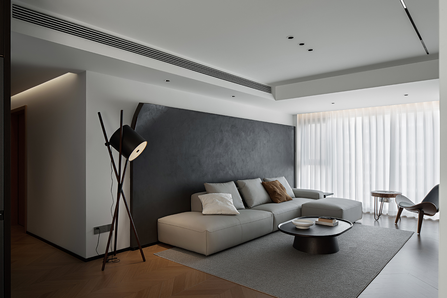 哑光深灰岩板台面、金属框架茶几与线性灯带,勾勒出冷冽的现代轮廓。灰度渐变地毯衔接木与白,如同水墨晕染的过渡,赋予空间视觉重量与稳定感。