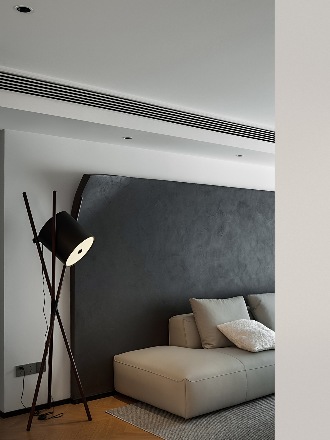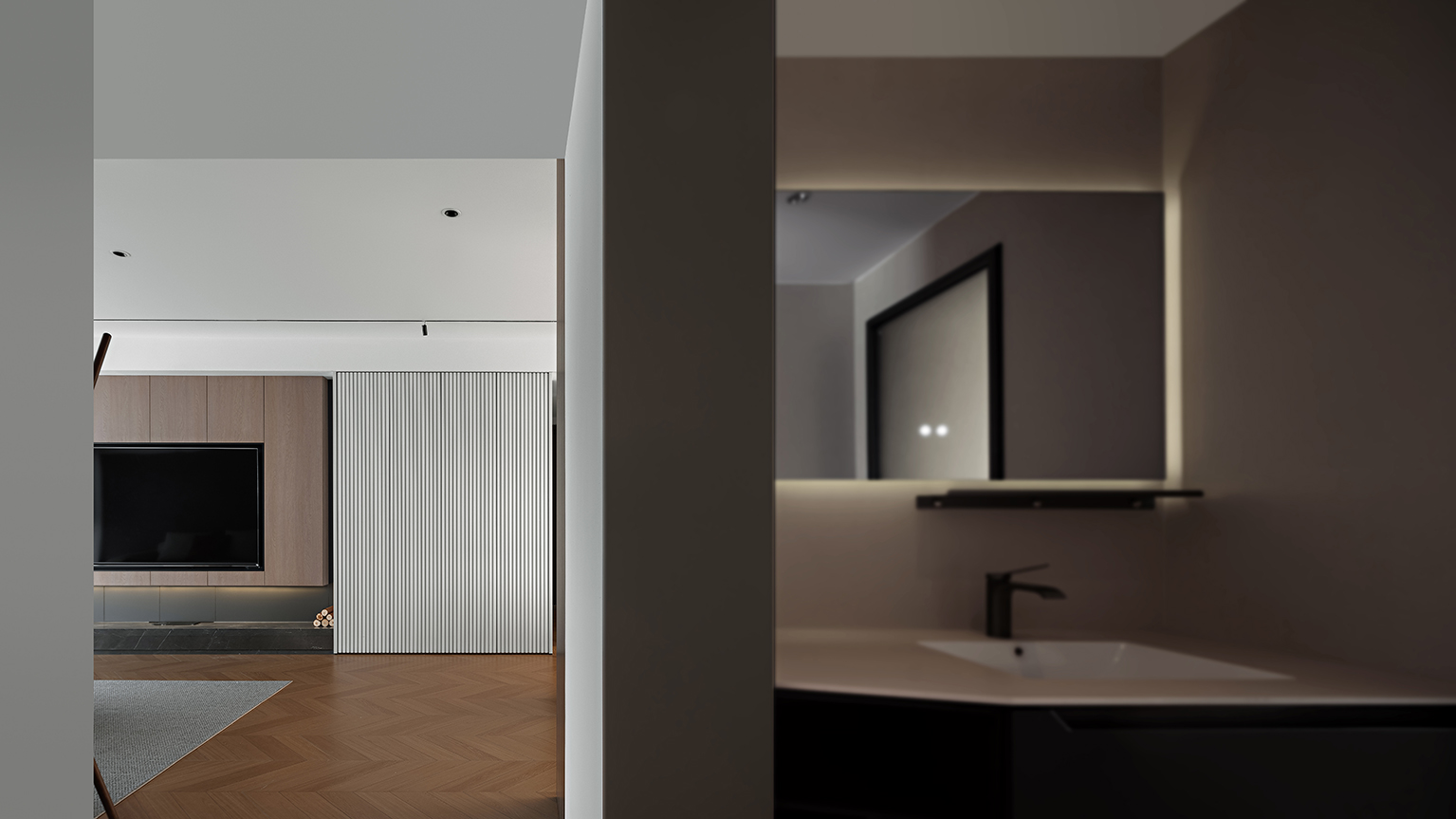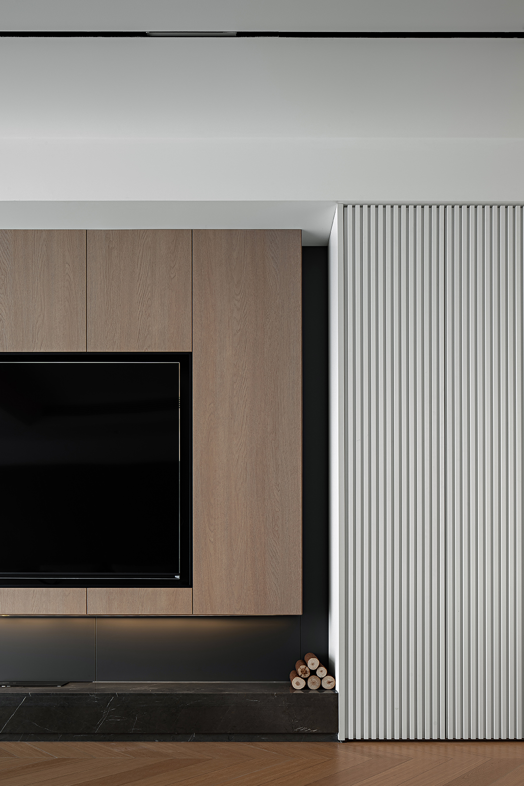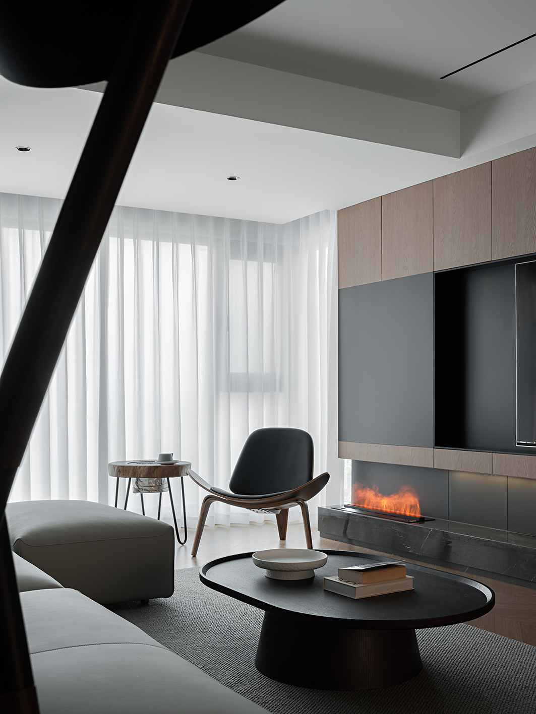 哑光深灰岩板台面、金属框架茶几与线性灯带,勾勒出冷冽的现代轮廓。灰度渐变地毯衔接木与白,如同水墨晕染的过渡,赋予空间视觉重量与稳定感。