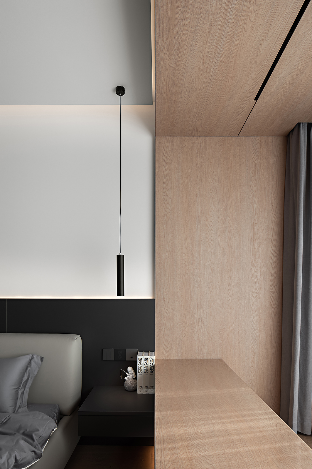 光影游戏:深灰色线性灯槽与木纹壁灯碰撞,冷光与暖光在白墙上交叠出几何戏剧。