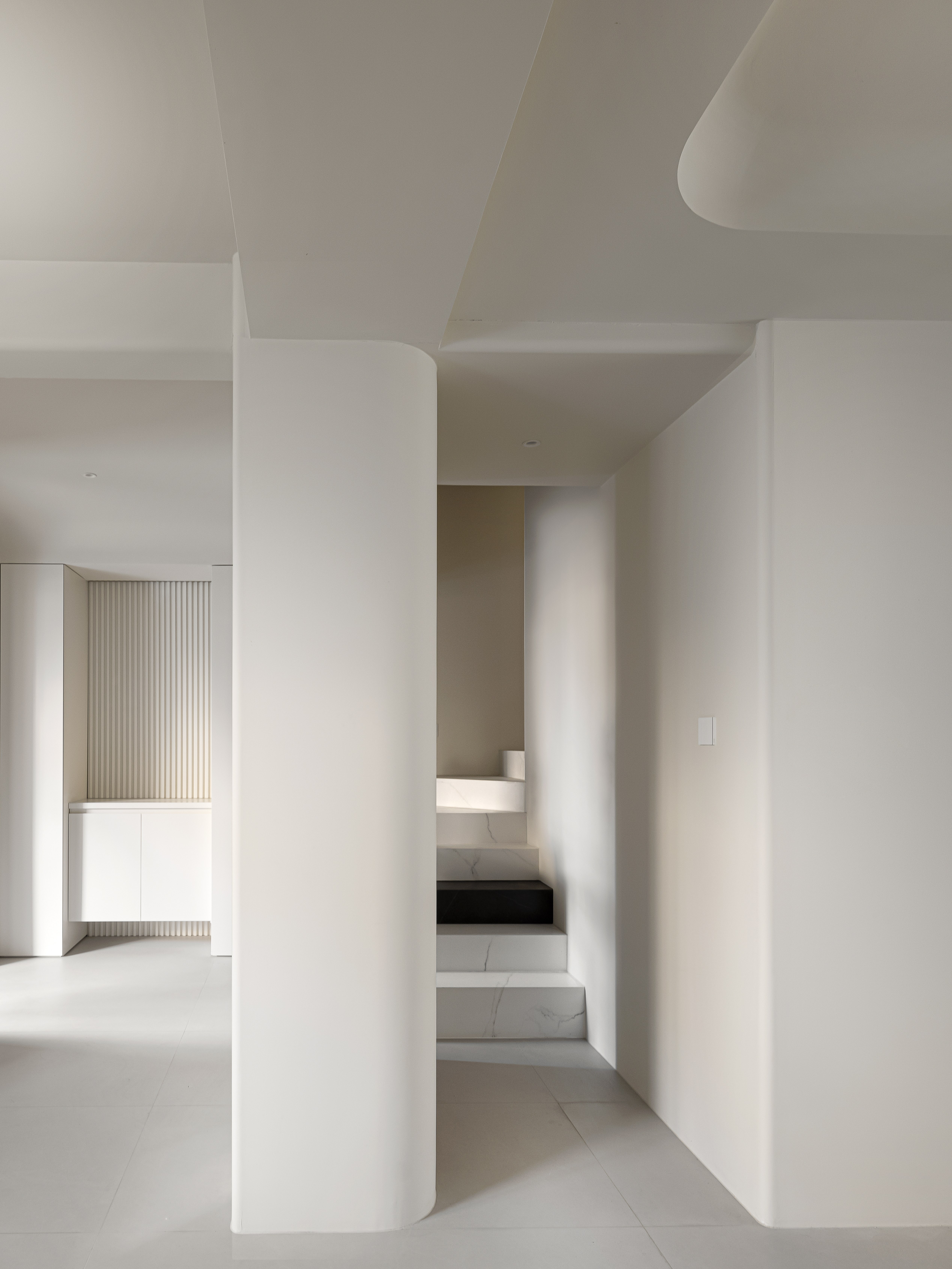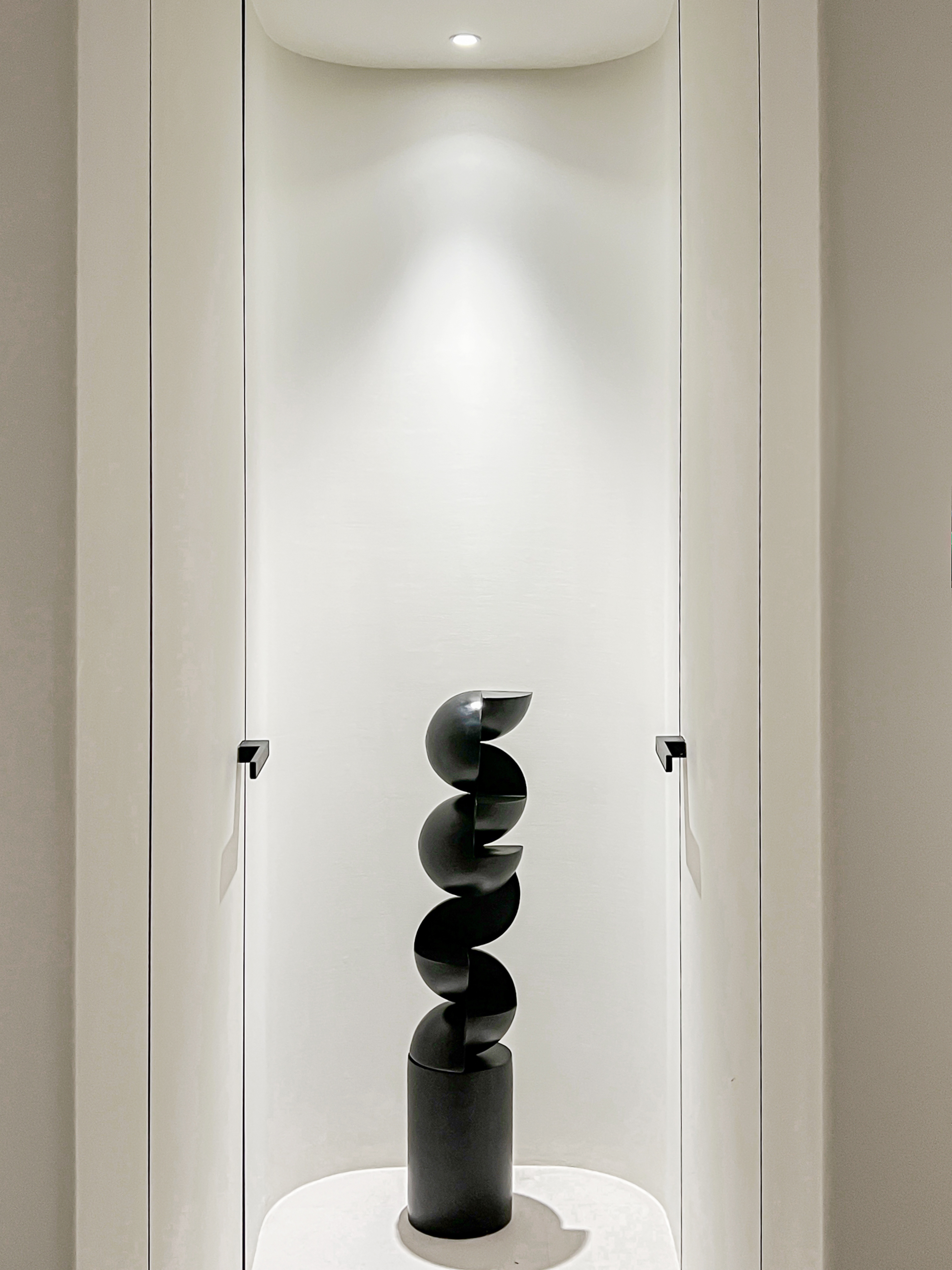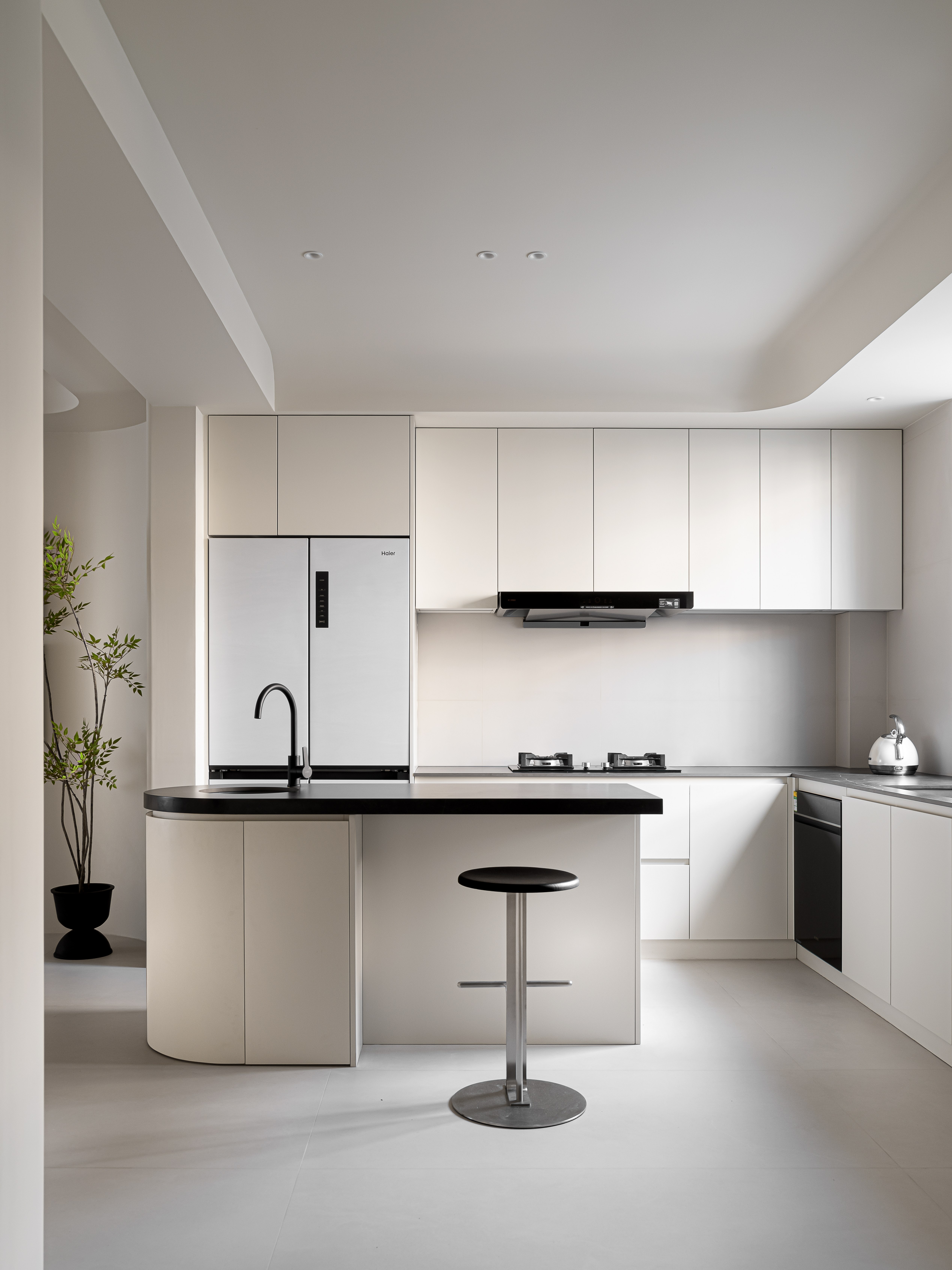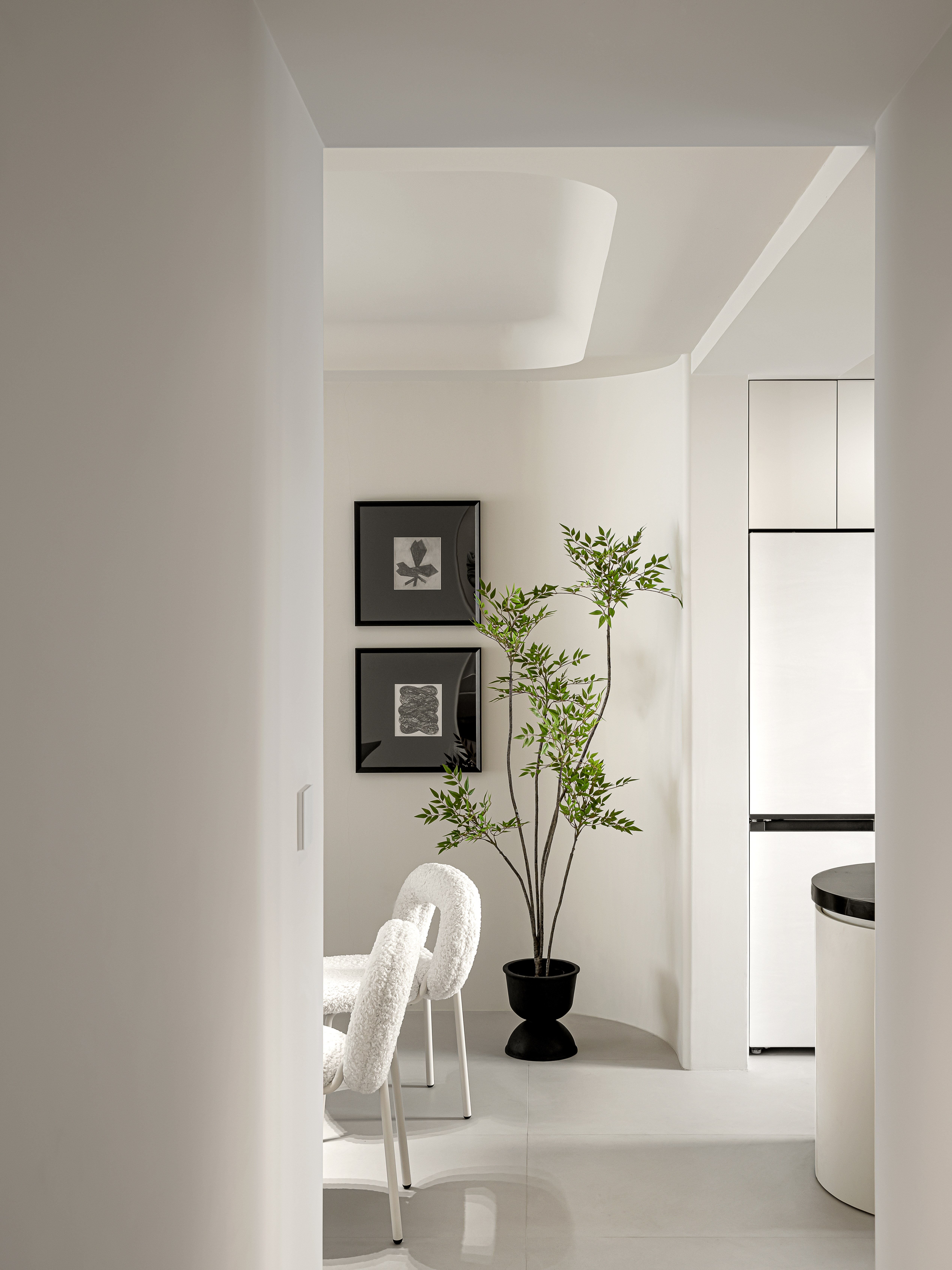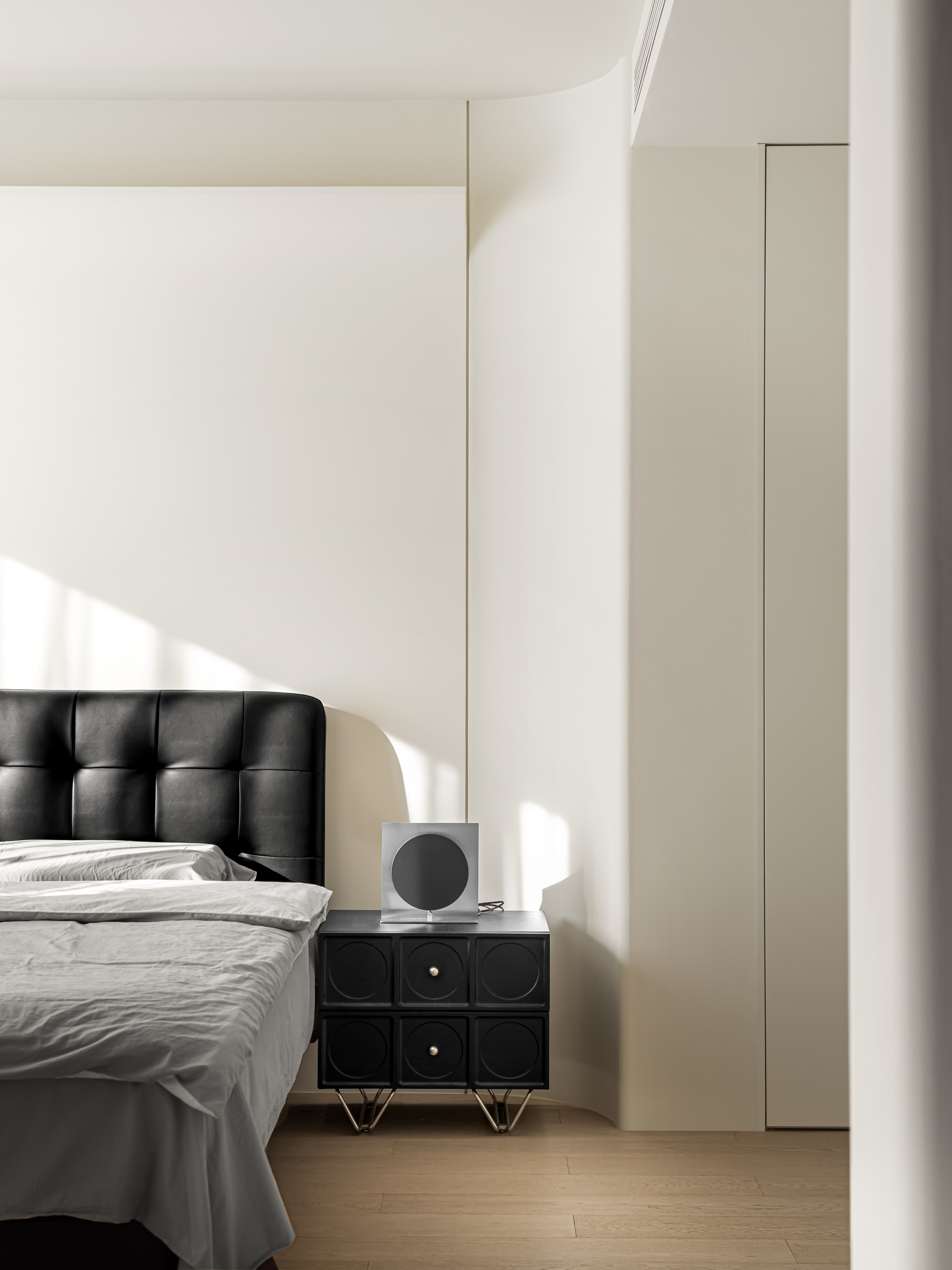 空间意境:全屋用了很多弧形元素,温润的形状可以很好的中和黑白色的硬朗。