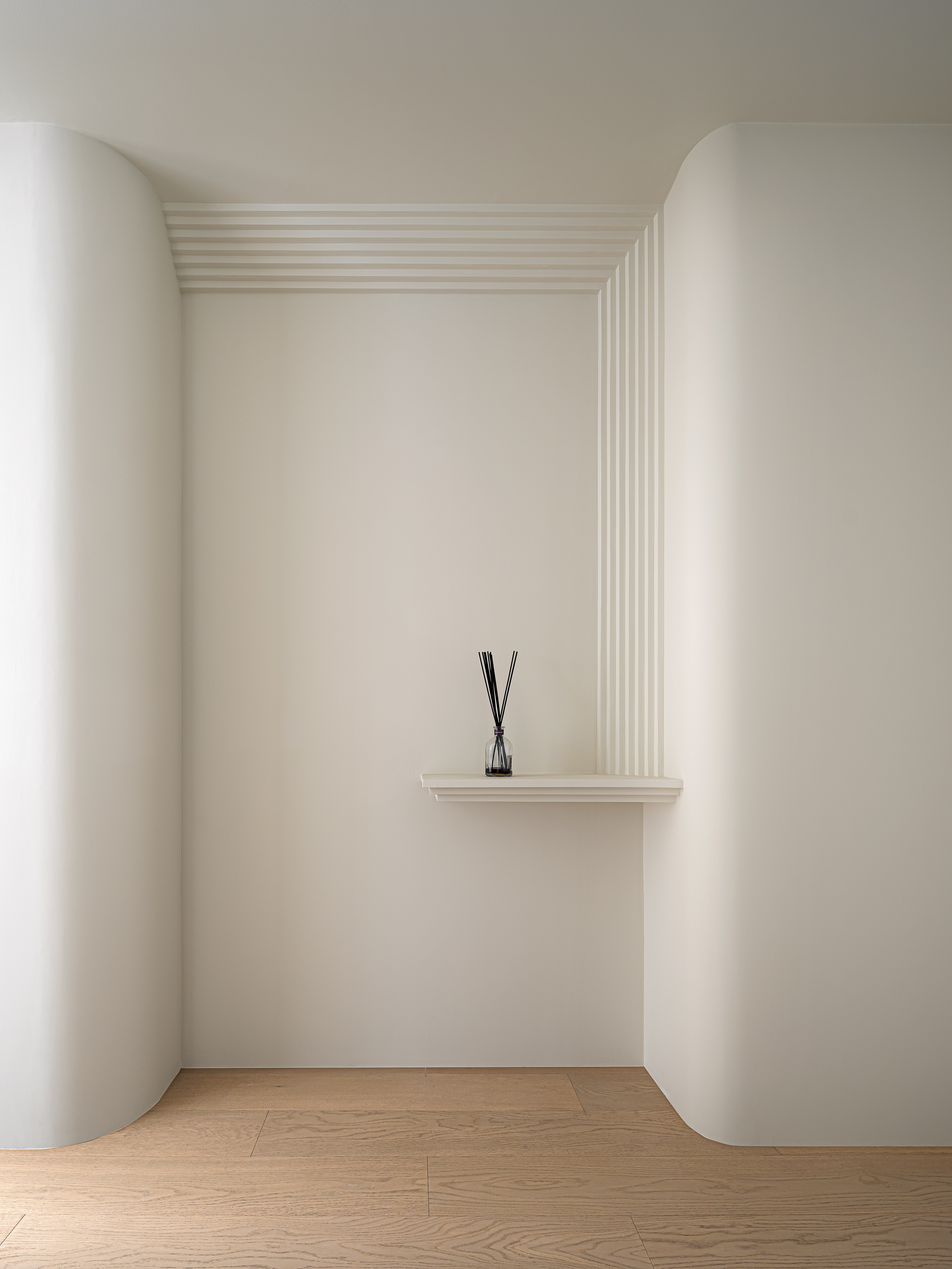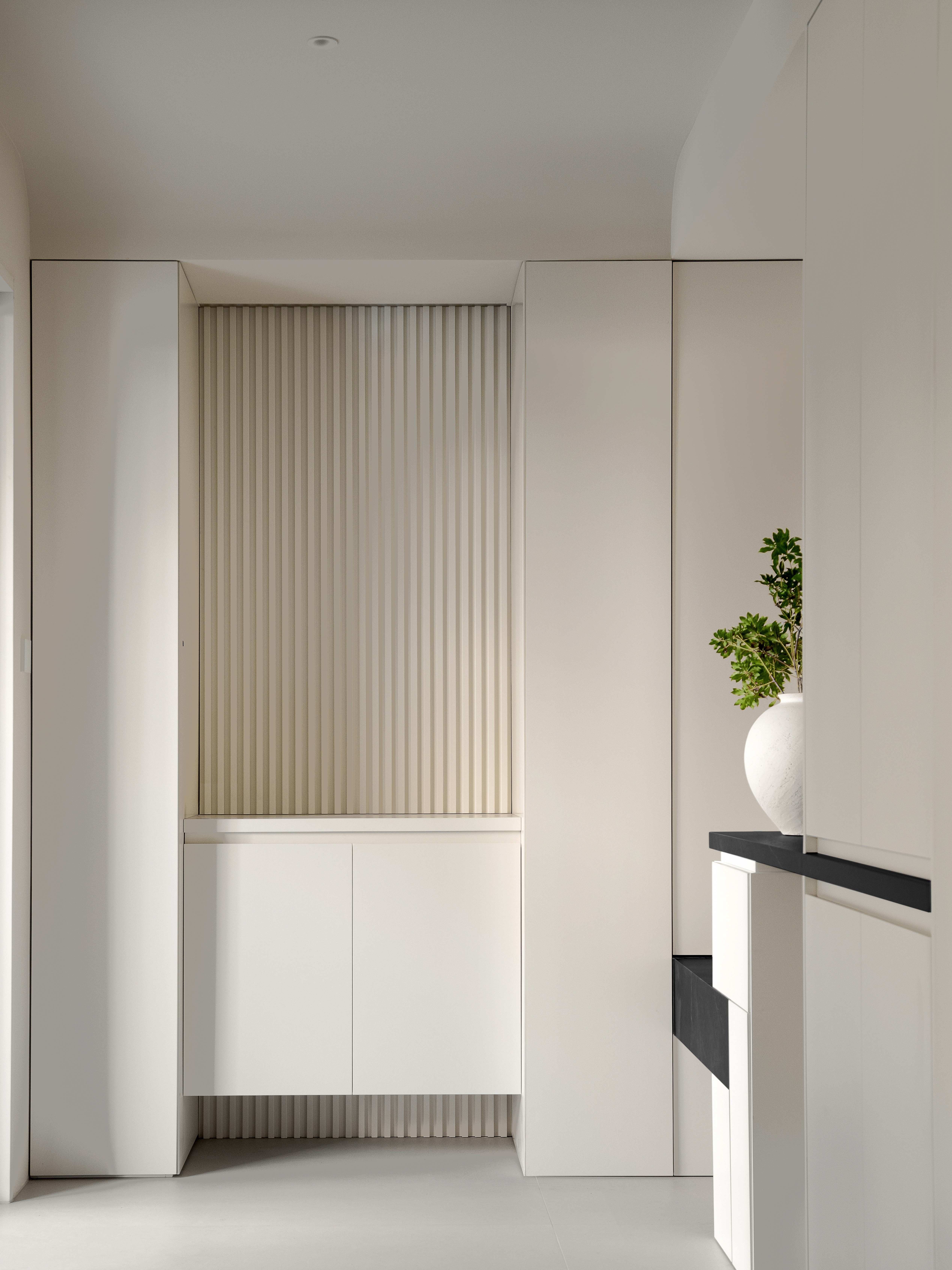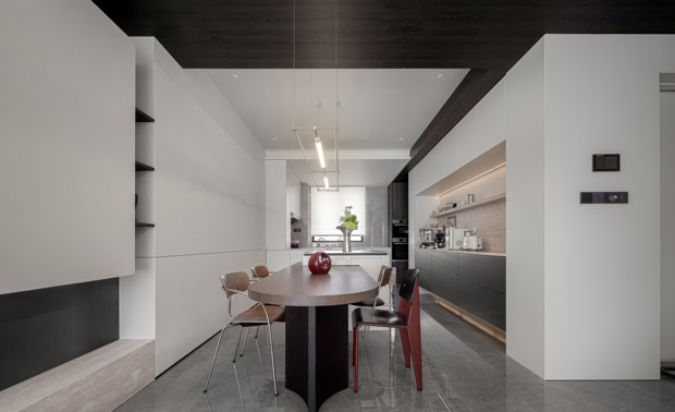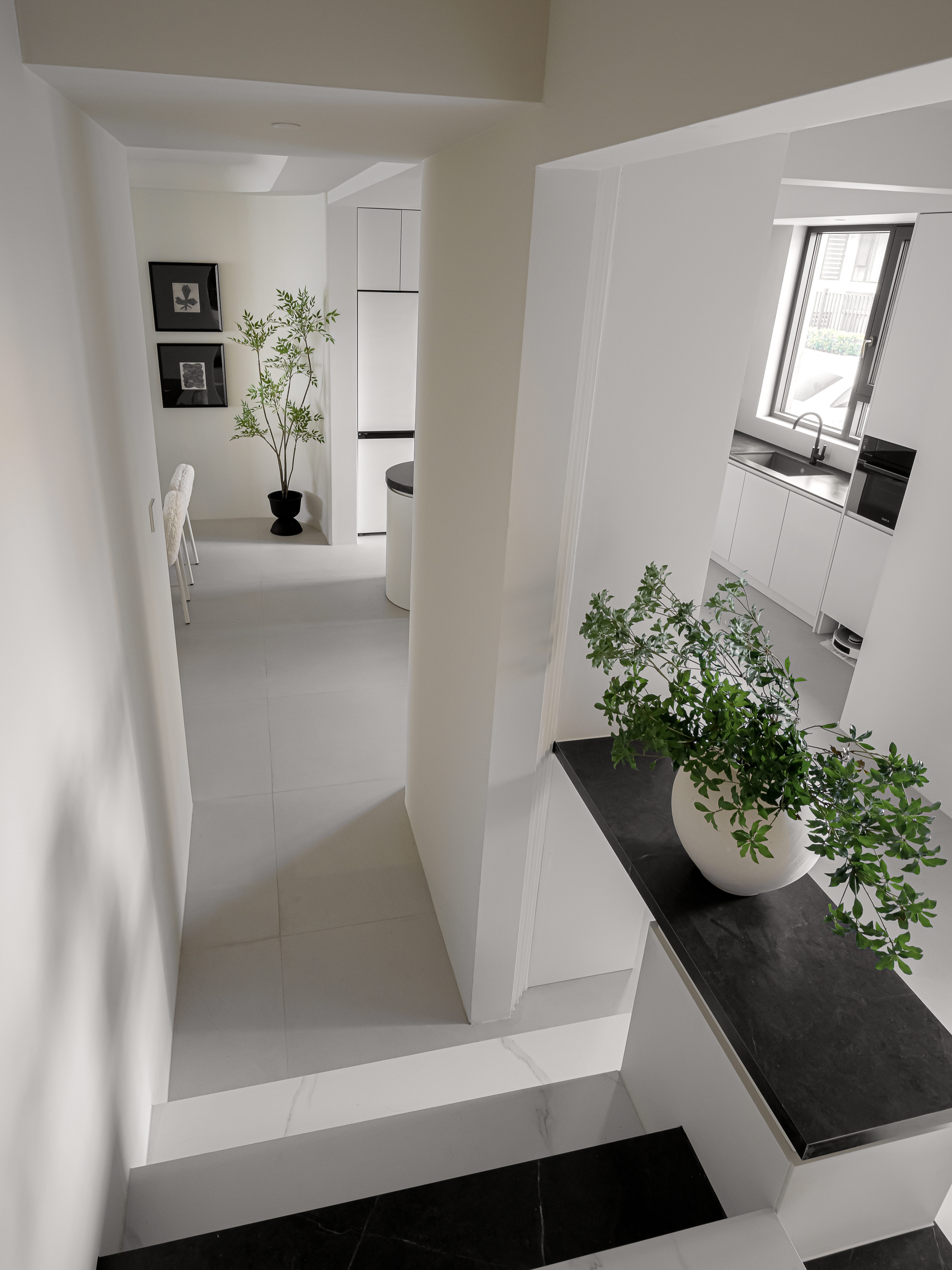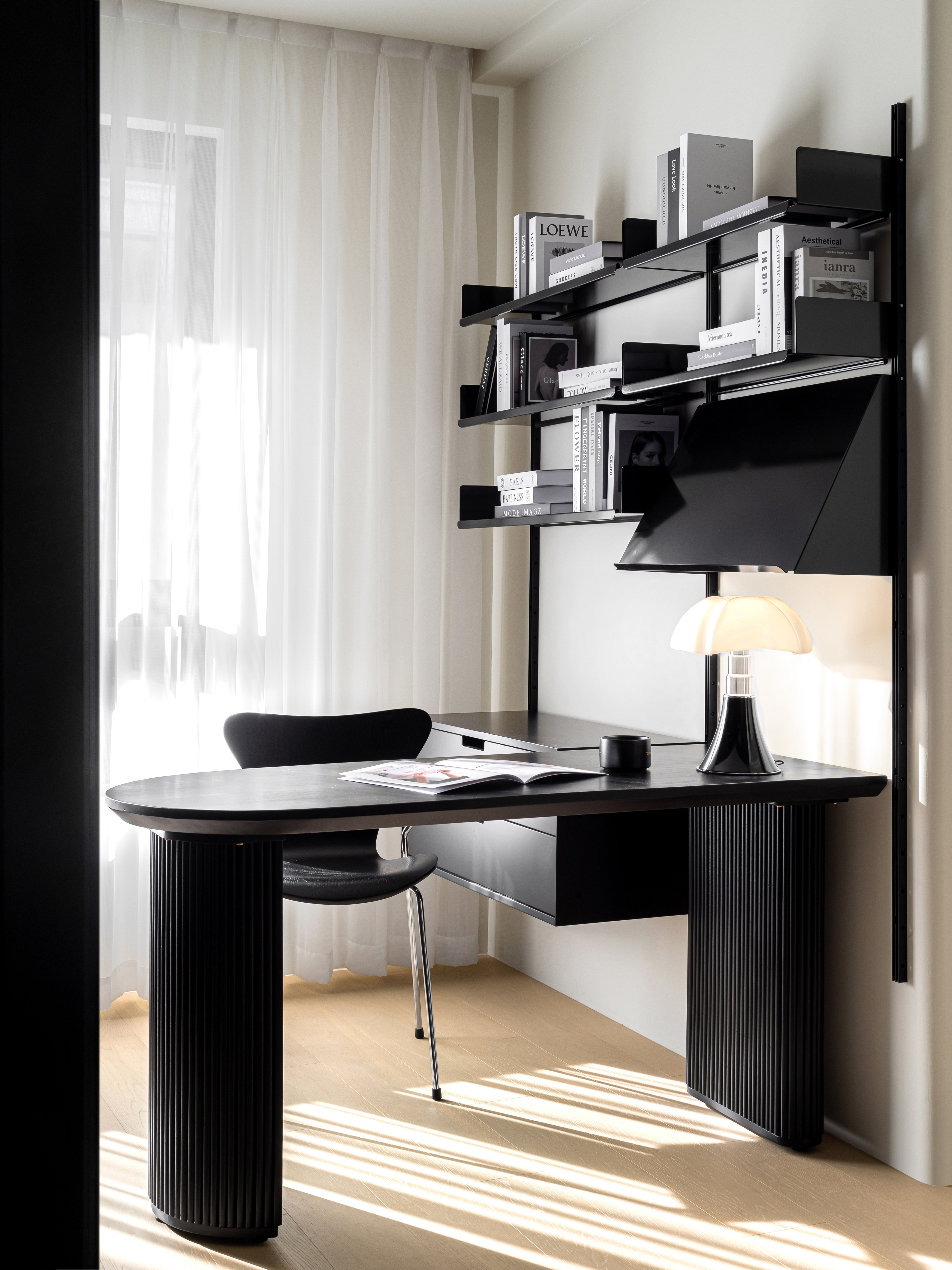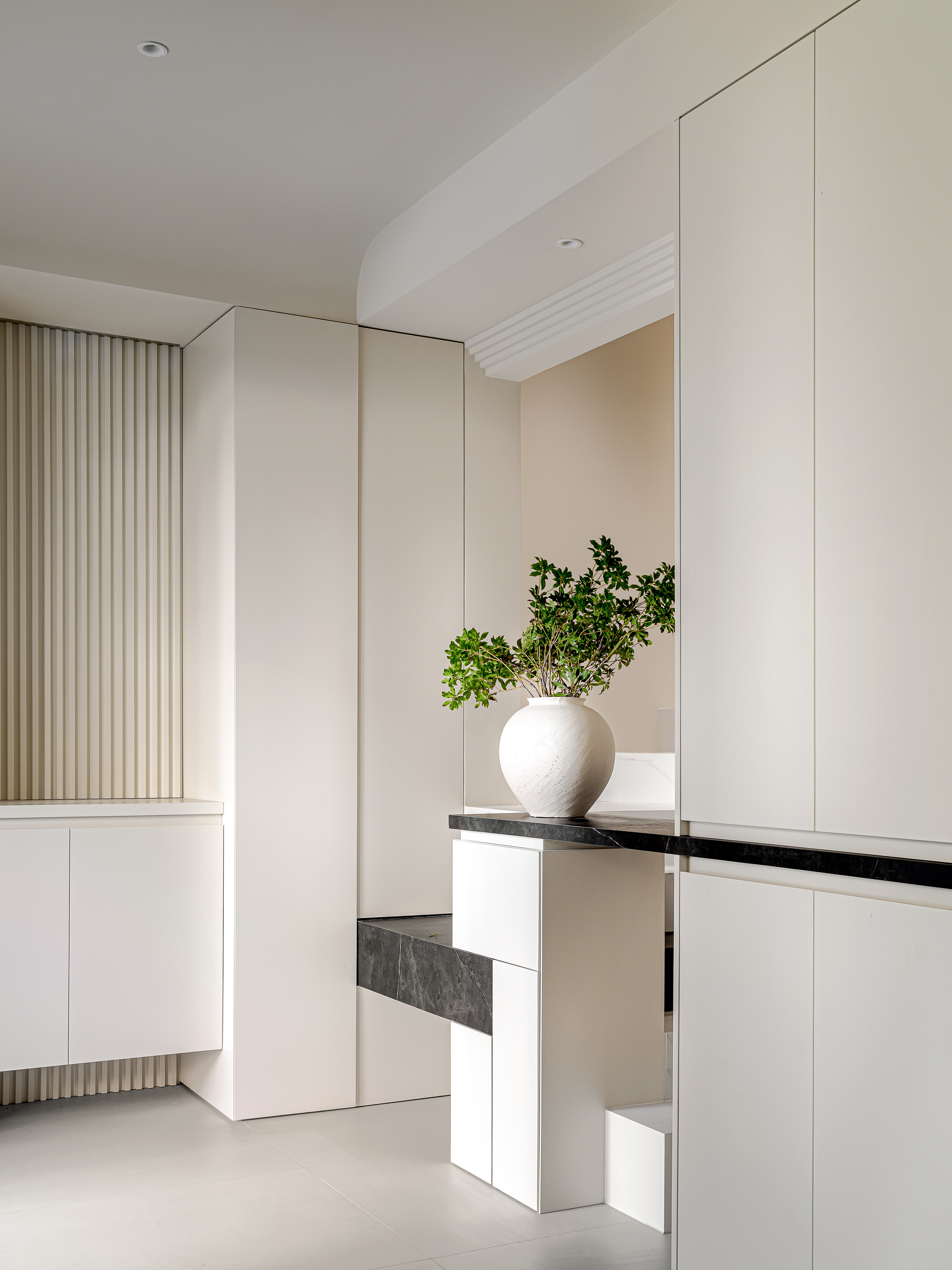 空间意境:全屋用了很多弧形元素,温润的形状可以很好的中和黑白色的硬朗。