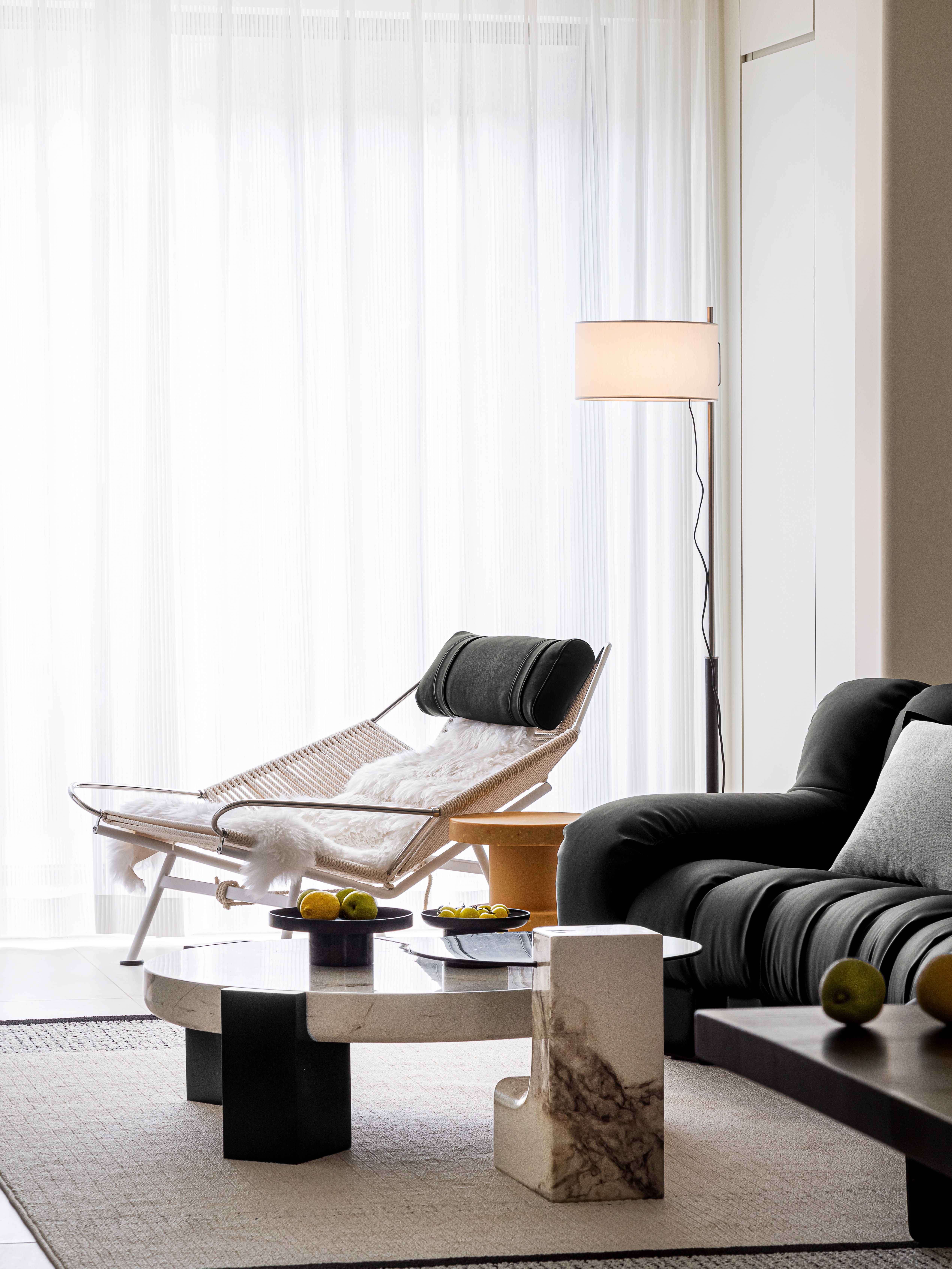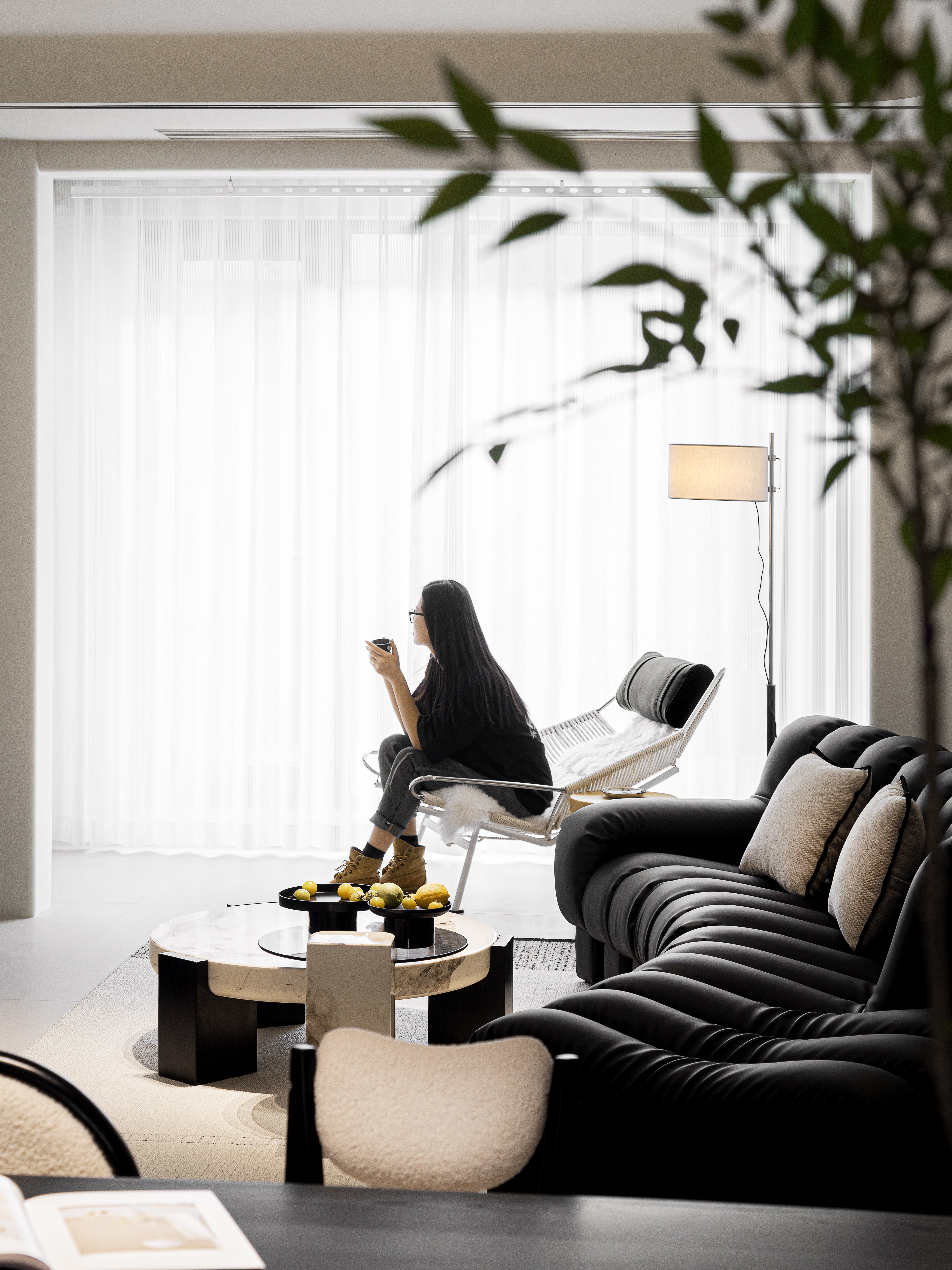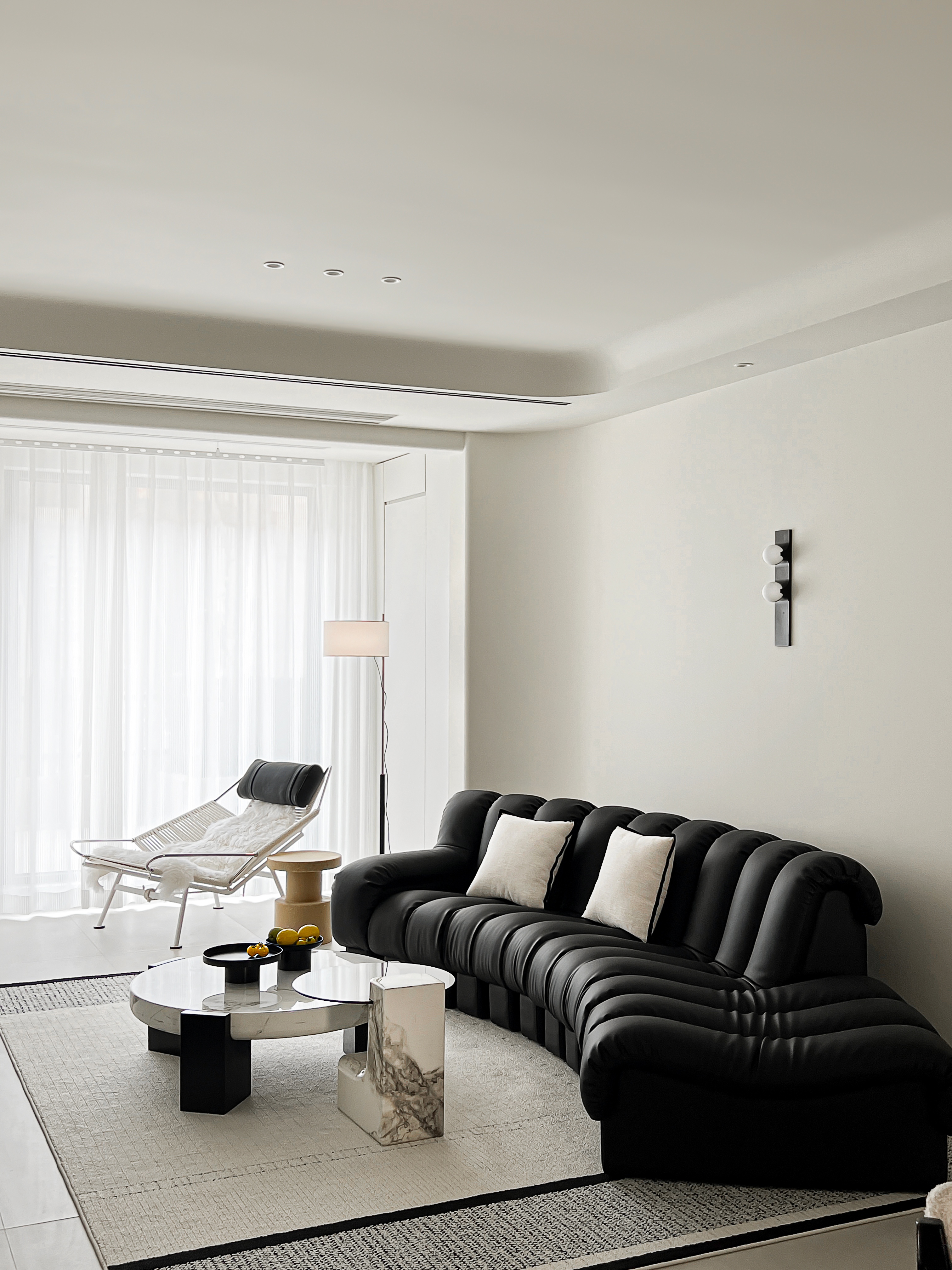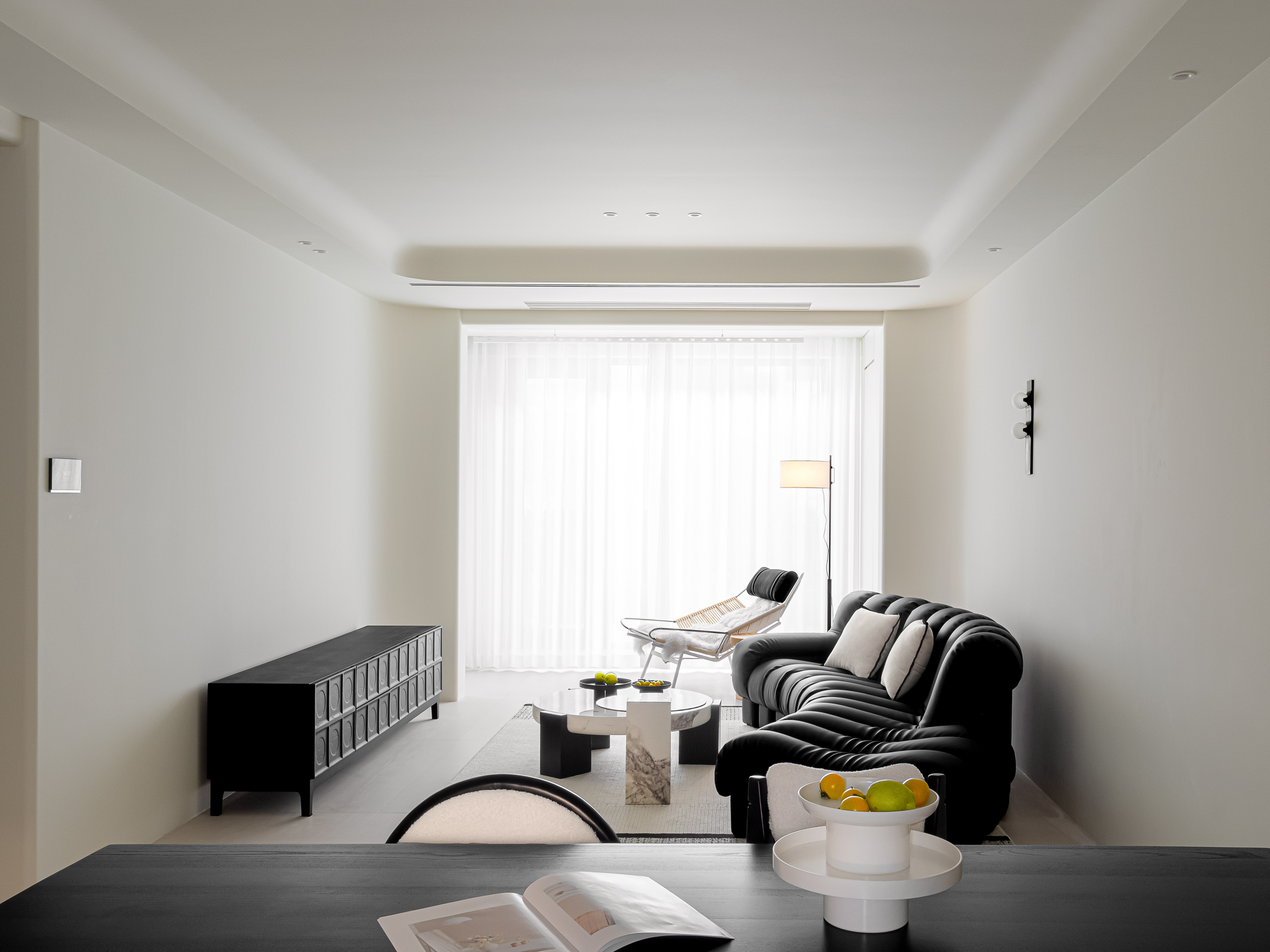 用户体验:投入使用后,洄游动线与开放布局让起居互动高效流畅。用户评价:“弧形元素柔化了黑白对比,家既通透又温馨,重组后的套房与动线让日常生活倍感舒适与便利。”
