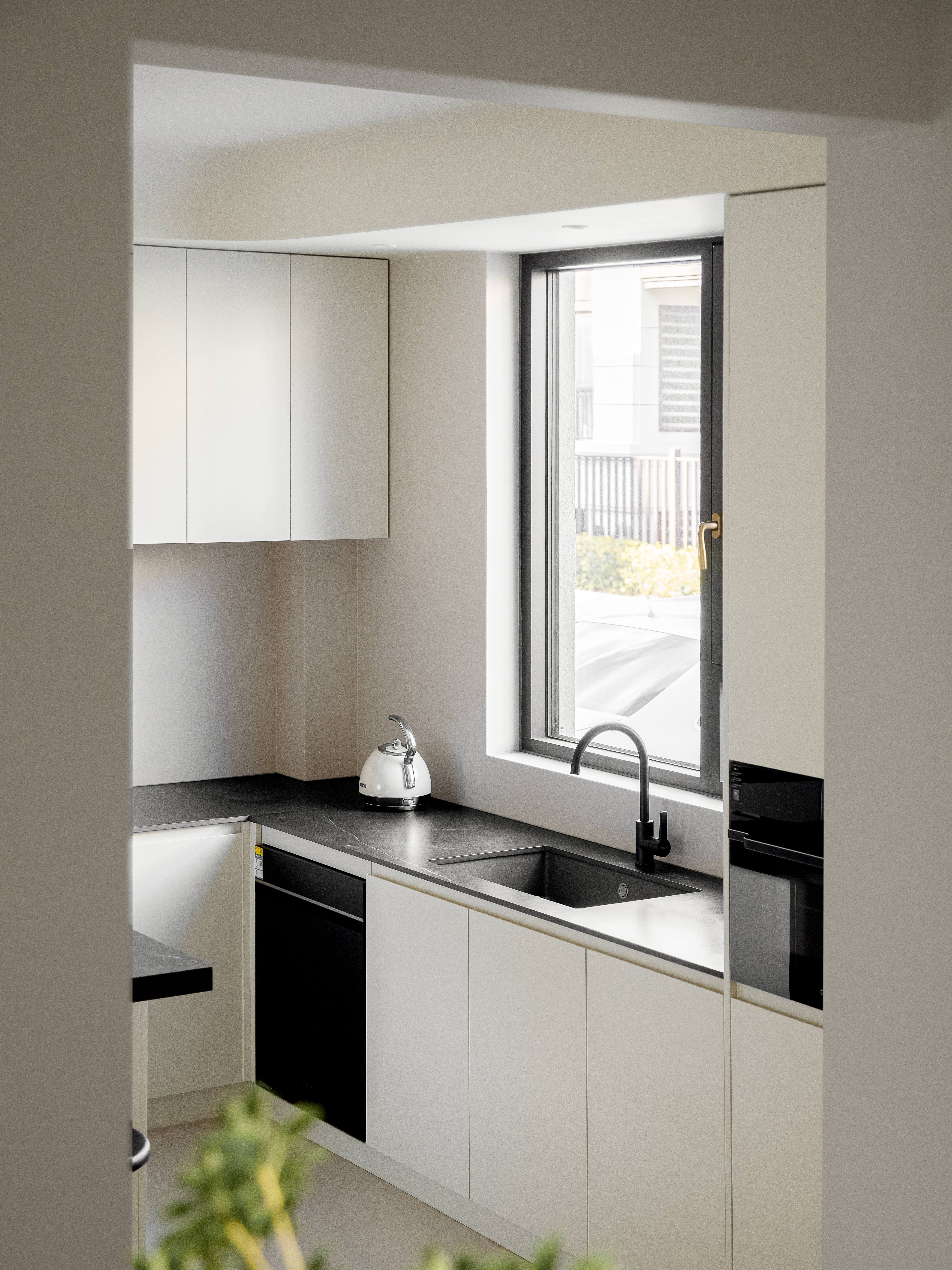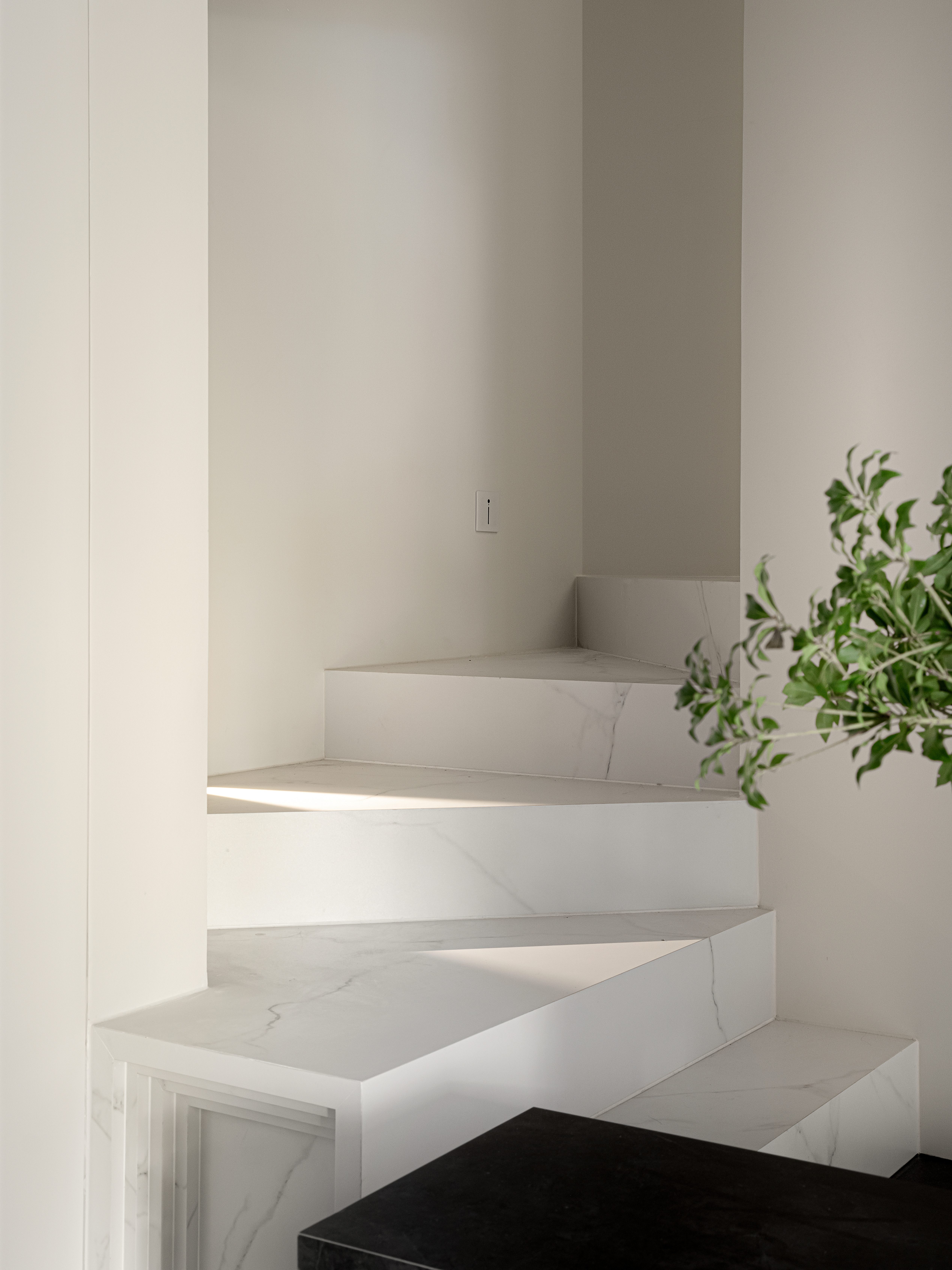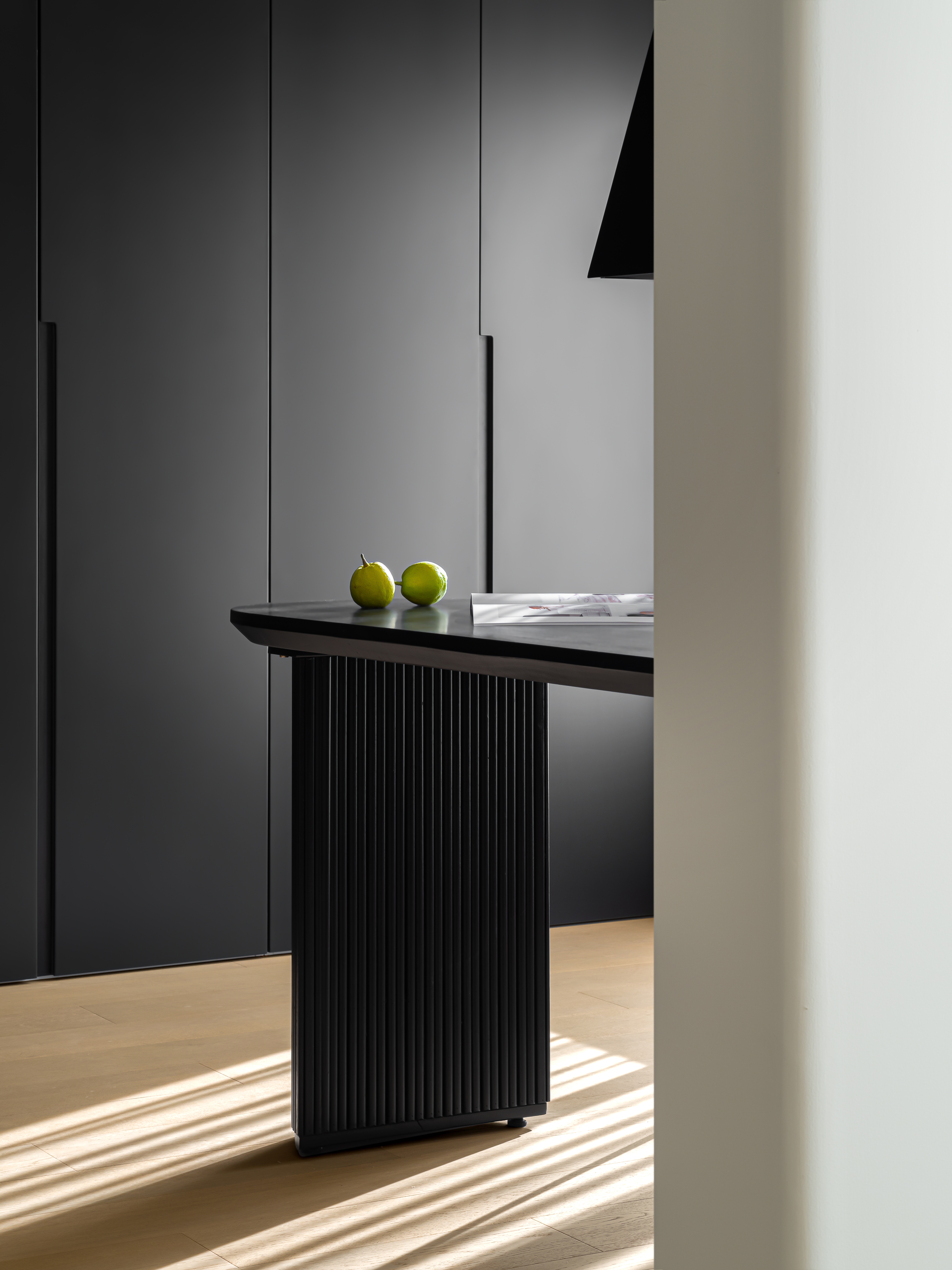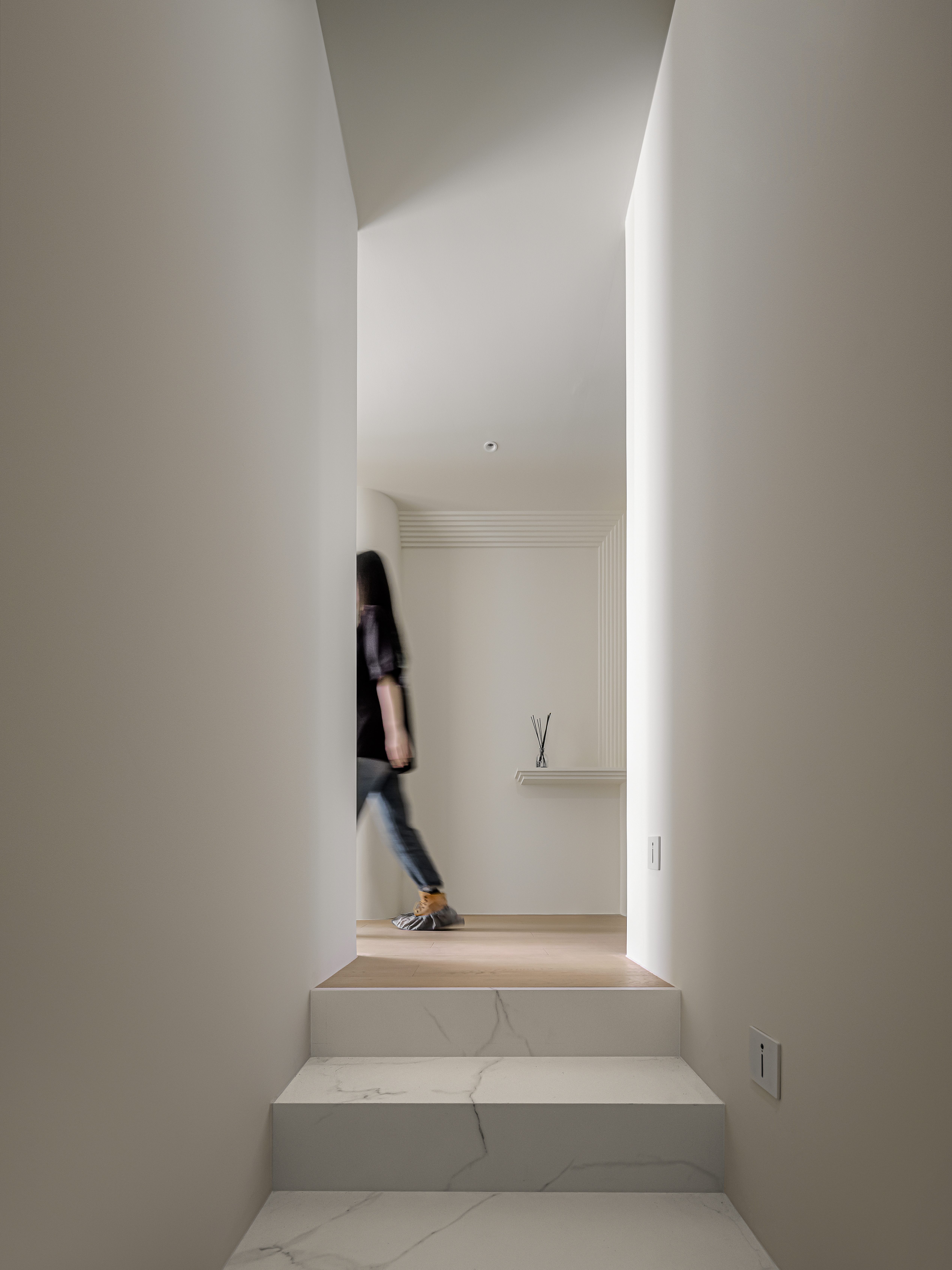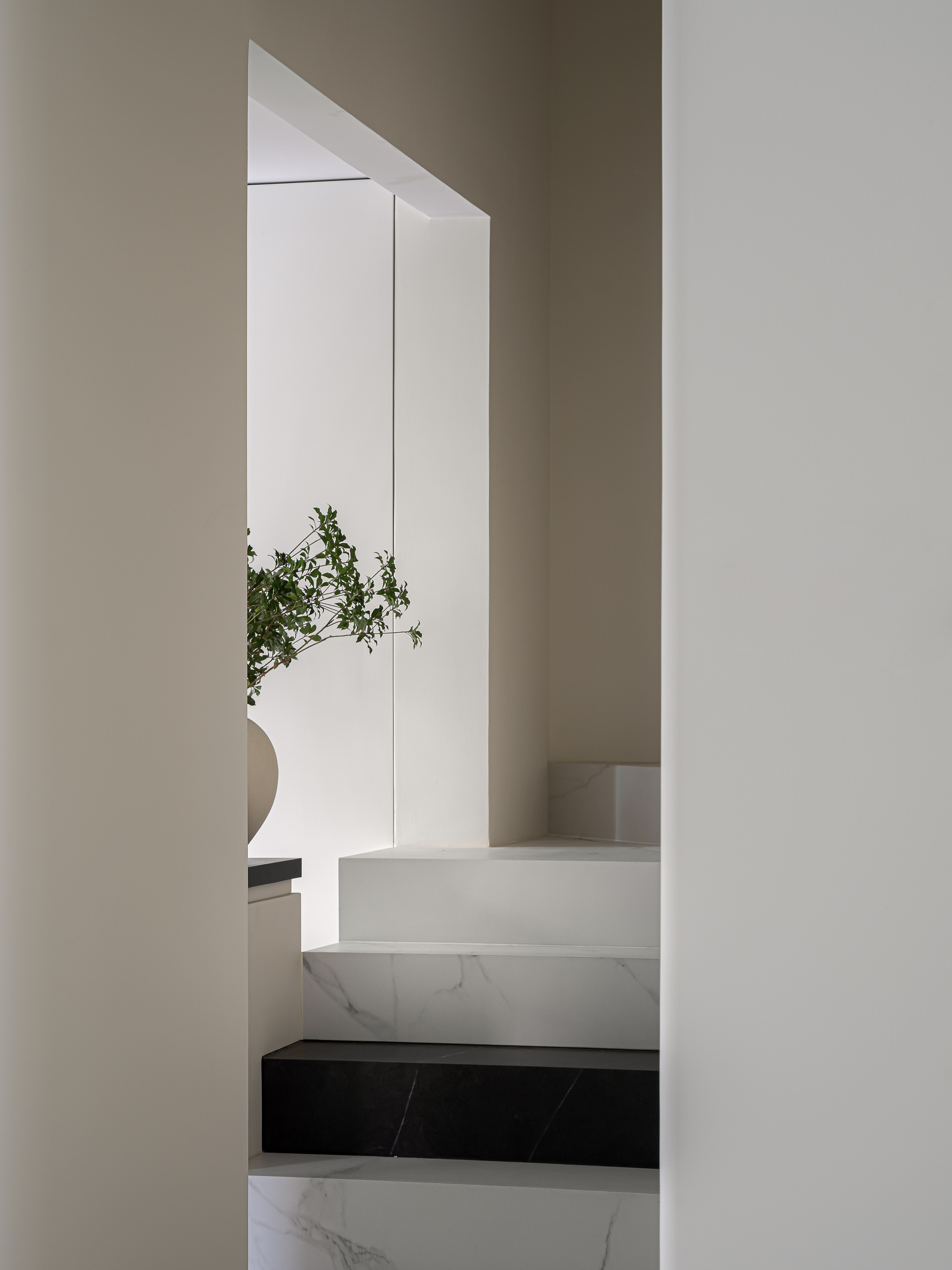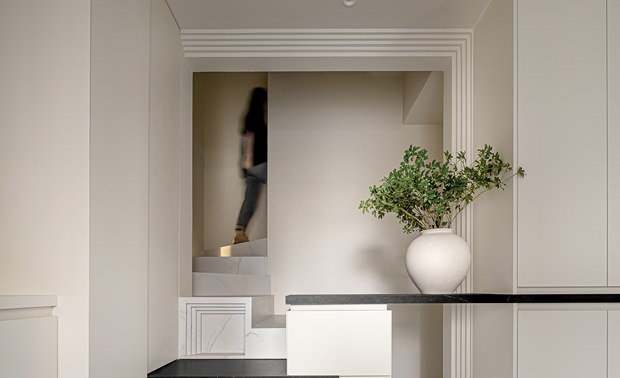 在一层,设计师打通玄关墙面,让楼梯漏出来,踏步与收纳柜体块穿插构。将厨房变成开放式,岛台居中就有了方便的洄游动线。整个空间通透流畅。