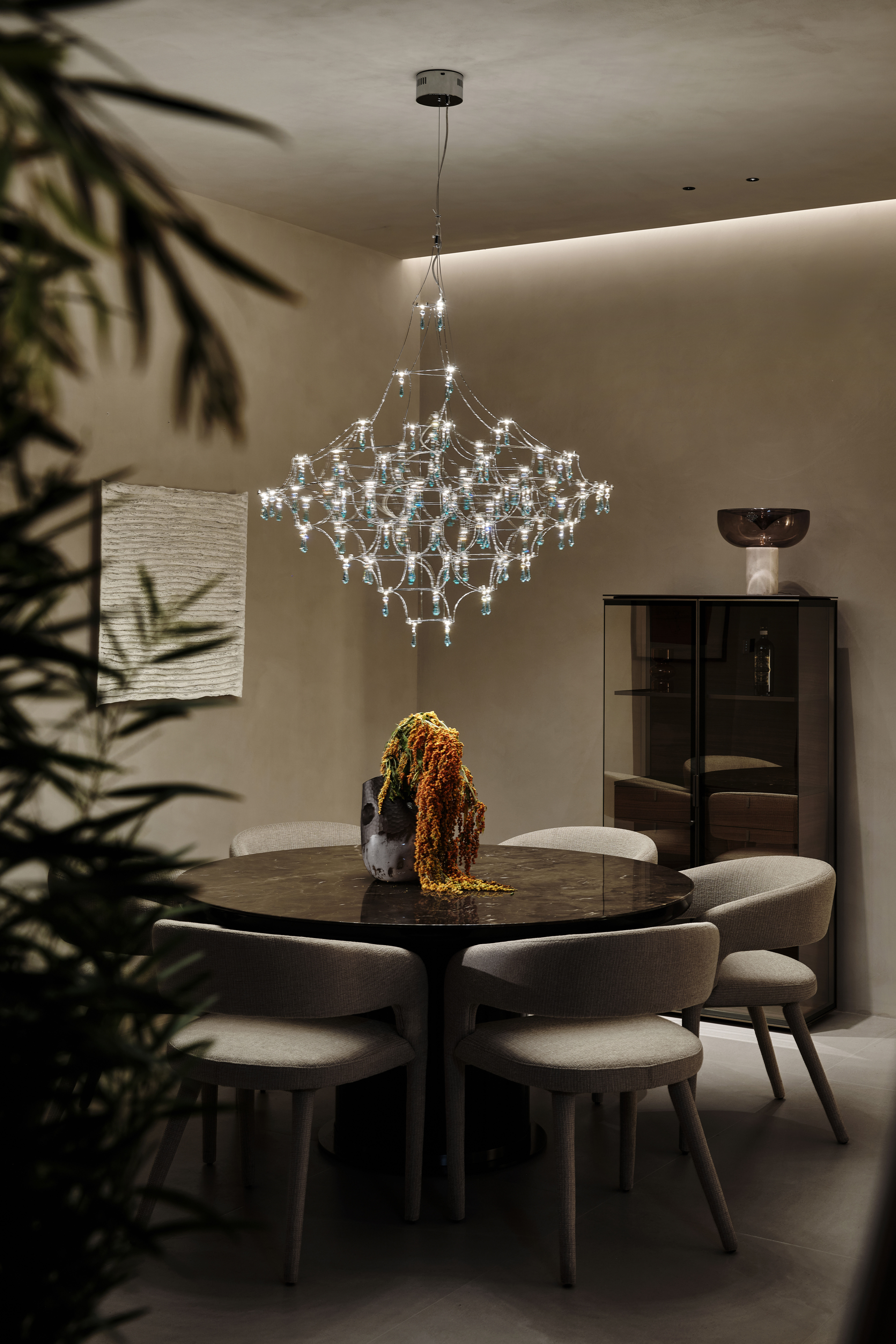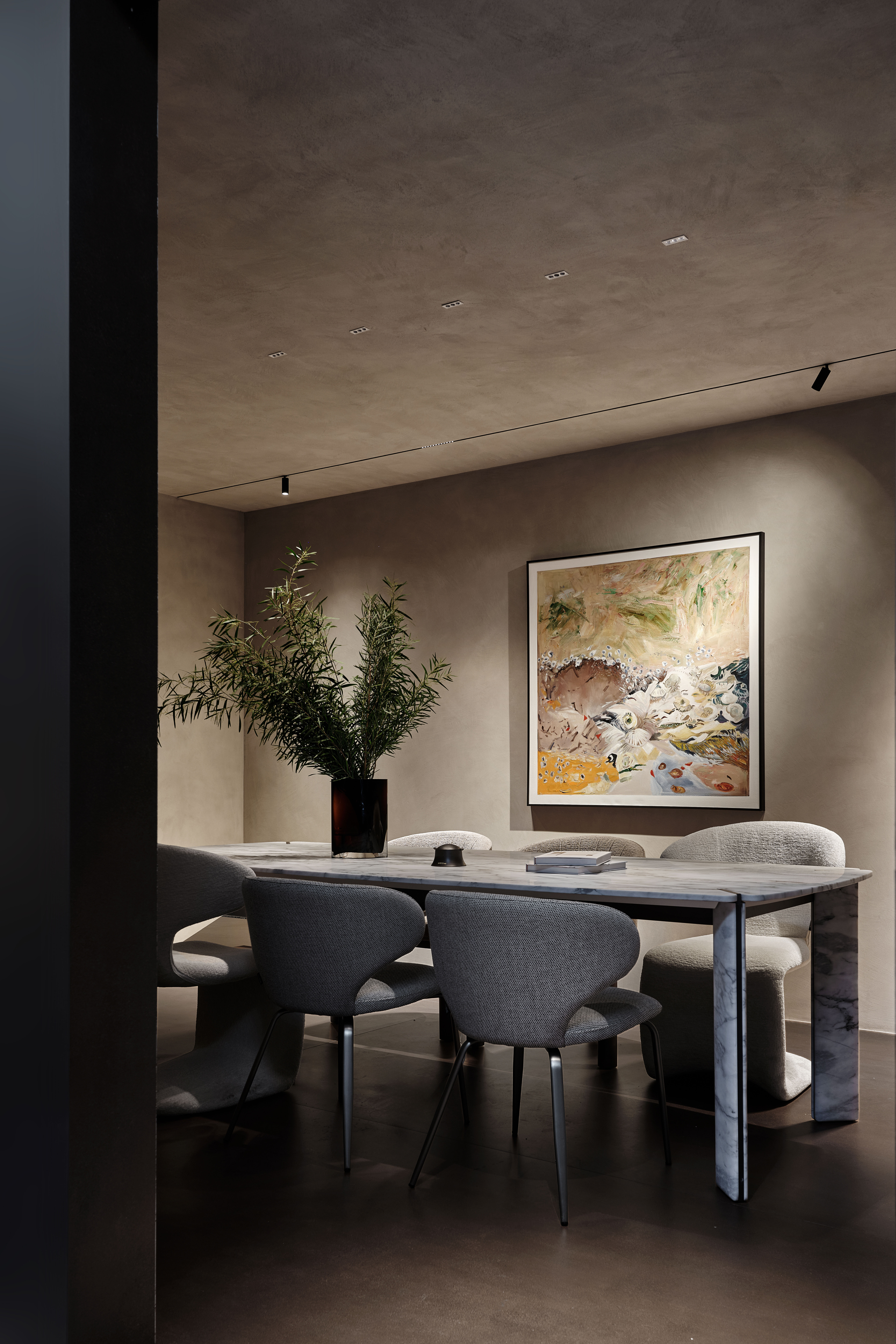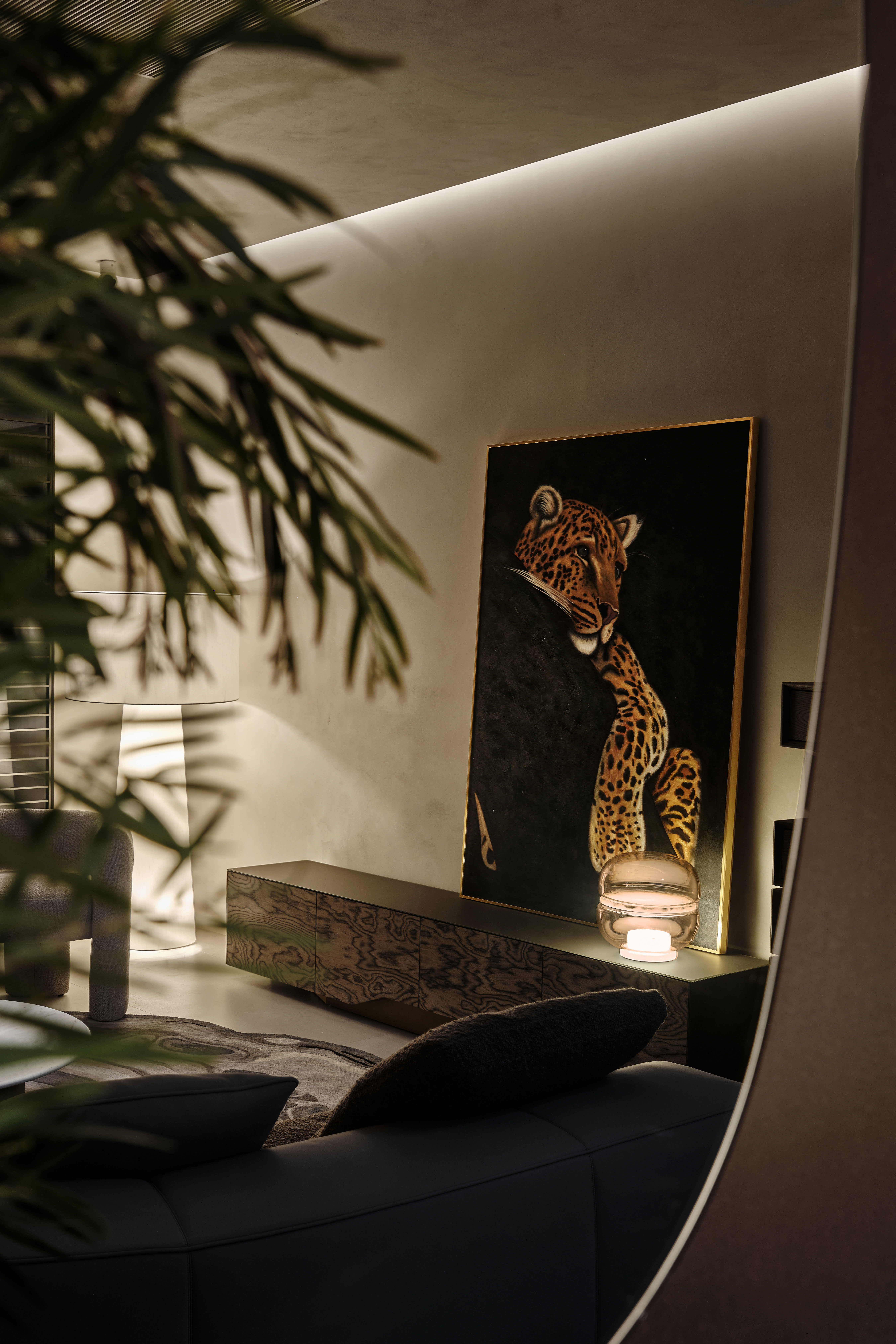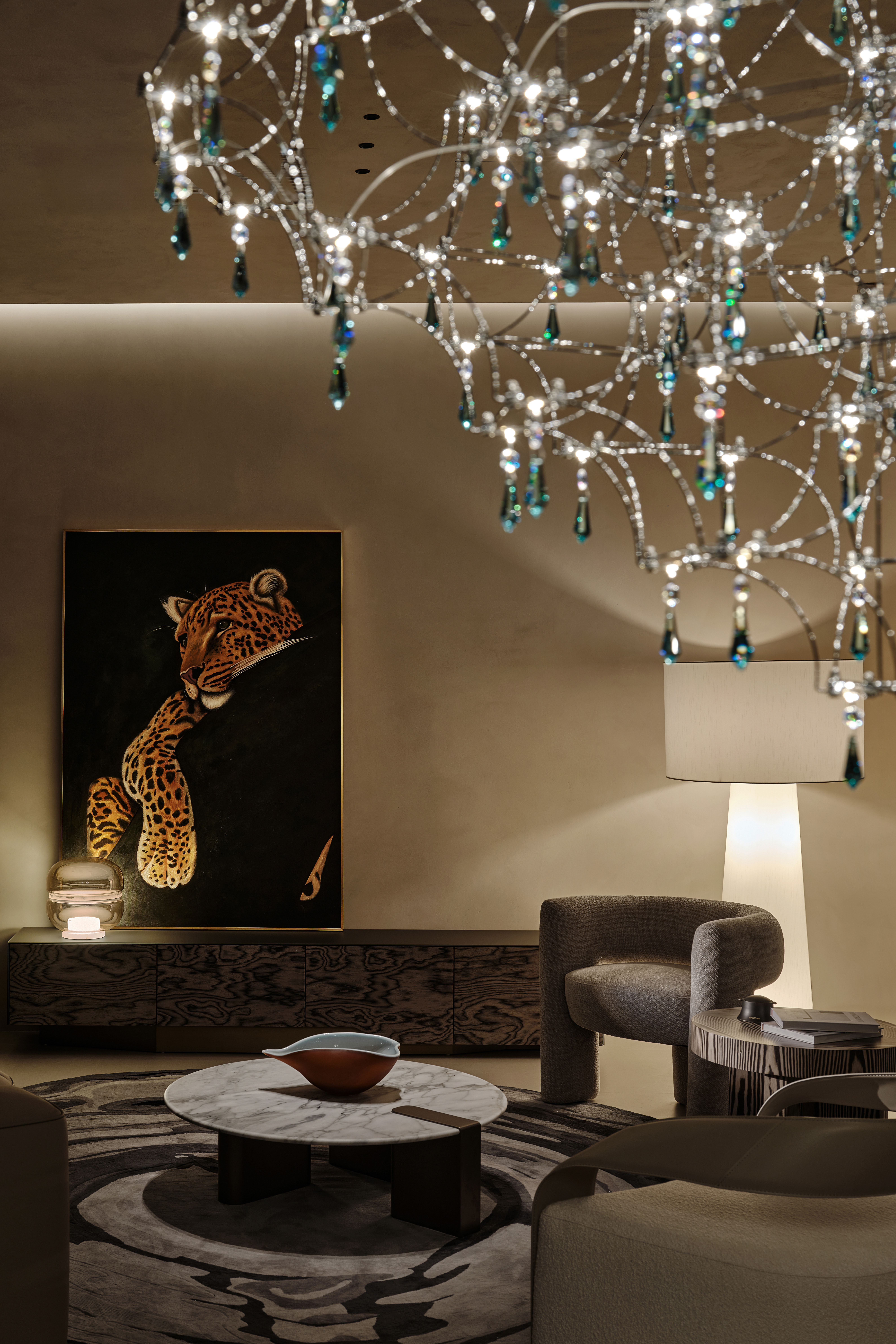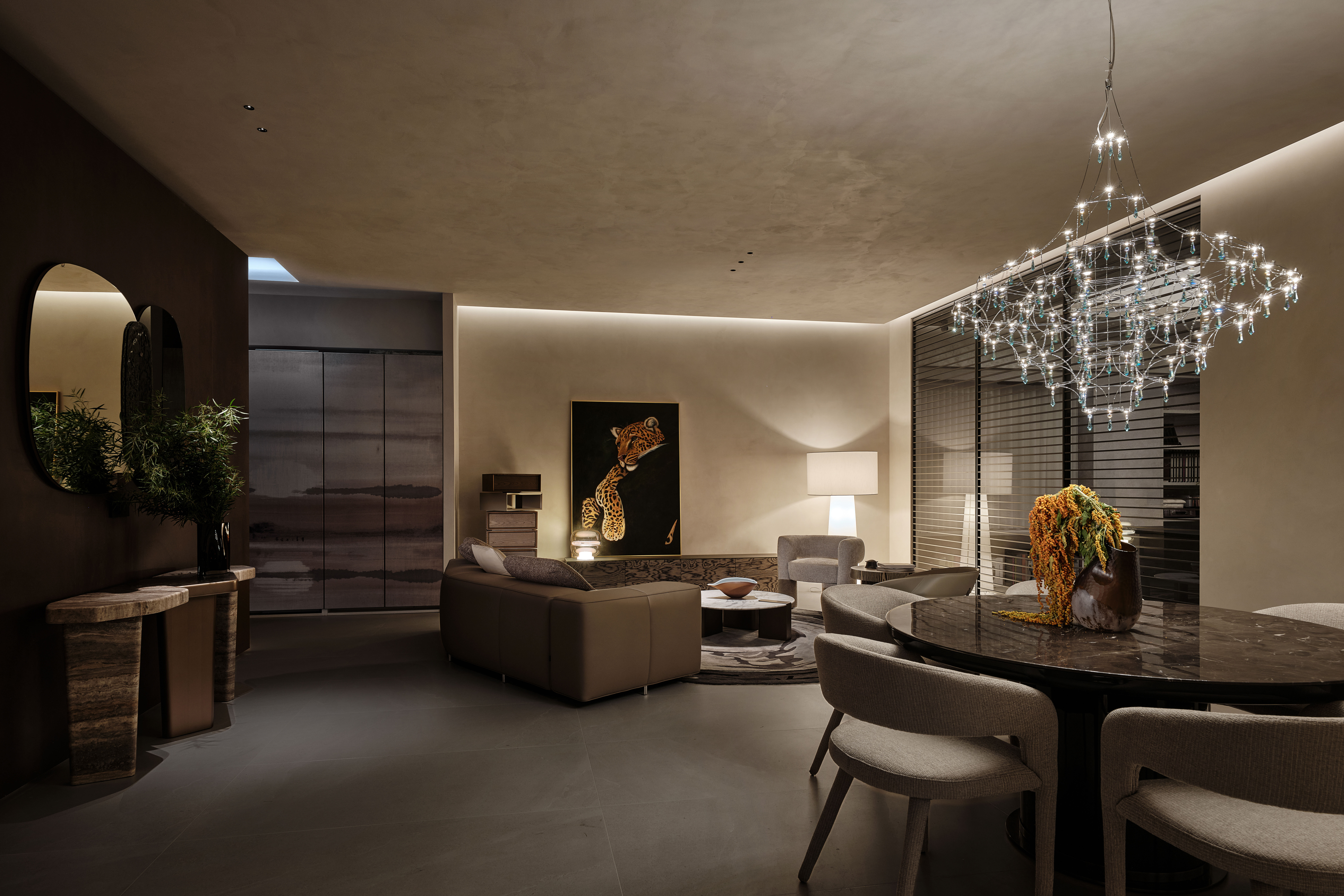 会客厅:以暖棕与浅灰为基底,微水泥墙面的细腻质感,定制家具的极简线条构建出松弛的现代轻奢氛围,豹纹艺术挂画与分子结构吊灯形成视觉呼应,灯光系统在明暗间勾勒层次,重点照明突出艺术陈设。